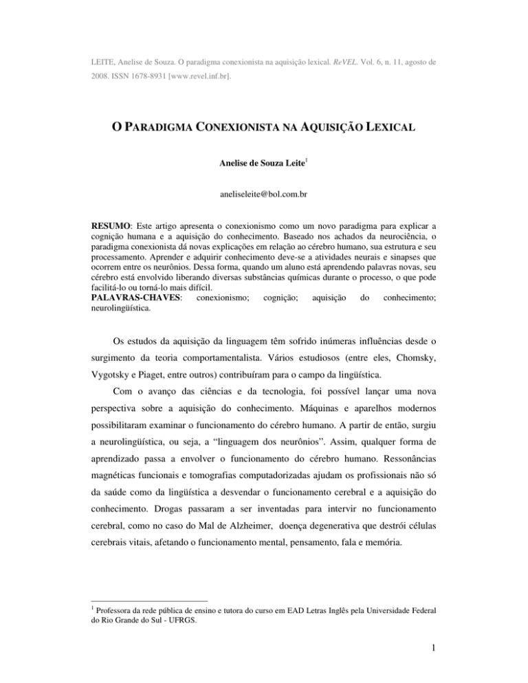LEITE, Anelise de Souza. O paradigma conexionista na aquisição lexical. ReVEL. Vol. 6, n. 11, agosto de 2008. ISSN 1678-8931 [www.revel.inf.br]. O PARADIGMA CONEXIONISTA NA AQUISIÇÃO LEXICAL Anelise de Souza Leite1 [email protected] RESUMO: Este artigo apresenta o conexionismo como um novo paradigma para explicar a cognição humana e a aquisição do conhecimento. Baseado nos achados da neurociência, o paradigma conexionista dá novas explicações em relação ao cérebro humano, sua estrutura e seu processamento. Aprender e adquirir conhecimento deve-se a atividades neurais e sinapses que ocorrem entre os neurônios. Dessa forma, quando um aluno está aprendendo palavras novas, seu cérebro está envolvido liberando diversas substâncias químicas durante o processo, o que pode facilitá-lo ou torná-lo mais difícil. PALAVRAS-CHAVES: conexionismo; cognição; aquisição do conhecimento; neurolingüística. Os estudos da aquisição da linguagem têm sofrido inúmeras influências desde o surgimento da teoria comportamentalista. Vários estudiosos (entre eles, Chomsky, Vygotsky e Piaget, entre outros) contribuíram para o campo da lingüística. Com o avanço das ciências e da tecnologia, foi possível lançar uma nova perspectiva sobre a aquisição do conhecimento. Máquinas e aparelhos modernos possibilitaram examinar o funcionamento do cérebro humano. A partir de então, surgiu a neurolingüística, ou seja, a “linguagem dos neurônios”. Assim, qualquer forma de aprendizado passa a envolver o funcionamento do cérebro humano. Ressonâncias magnéticas funcionais e tomografias computadorizadas ajudam os profissionais não só da saúde como da lingüística a desvendar o funcionamento cerebral e a aquisição do conhecimento. Drogas passaram a ser inventadas para intervir no funcionamento cerebral, como no caso do Mal de Alzheimer, doença degenerativa que destrói células cerebrais vitais, afetando o funcionamento mental, pensamento, fala e memória. 1 Professora da rede pública de ensino e tutora do curso em EAD Letras Inglês pela Universidade Federal do Rio Grande do Sul - UFRGS. 1 Na inteligência artificial, surgiram computadores e softwares que simulam como o cérebro humano aprende, analisa, armazena, recorda e perde a linguagem. Surge, então, um novo paradigma para a explicação da aquisição do conhecimento: o conexionismo . O conexionismo apresenta-se como um paradigma de cognição que se coloca entre o behaviorismo e o simbolismo (POERSCH, 1998). Ele procura avançar em pontos em que os paradigmas anteriores não se apresentaram satisfatórios. A abordagem conexionista busca as explicações para a aquisição do conhecimento humano nos achados da neurociência, a partir de estudos sobre o sistema nervoso central (ROSSA, 2004). Portanto, tal abordagem atribui a aquisição do conhecimento às atividades do cérebro humano. Seidenberg e MacDonald (1999) acreditam que o aprendizado envolve informação cumulativa e aspectos estatísticos e probabilísticos da linguagem. A fim de compreender como ocorre a aquisição do conhecimento de acordo com o paradigma conexionista, é importante saber como o cérebro humano é estruturado e que reações e processos ocorrem nele. Inicialmente ele é dividido em dois grandes hemisférios – o direito e o esquerdo. Estes são unidos por feixes de fibras nervosas, conhecidas como corpo caloso. Segundo Jensen (2002), cada hemisfério processa as informações de forma diferente. Conhecer a biologia do cérebro também é importante para compreender como a linguagem é processada. Segundo Christison (2002) é necessário saber a estrutura biológica que compõe o cérebro humano. Entre os principais elementos a ser considerados encontram-se os seguintes: Tronco cerebral - responsável pela regularização de funções essenciais no corpo (respiração e batimento cardíaco são alguns exemplos) e também responsável pela produção de substâncias químicas, como a serotonina, que regulam o sono e a vigilância; Cerebelo - responsável pela postura e por movimentos motores. Também acreditase que traços de memória estão nele localizados, sendo, portanto, considerado o centro do pensamento; Corpo caloso - parte do cérebro composta de centenas de milhares de nervos que conectam os dois hemisférios; Neocortex - uma fina camada que cobre o cérebro, local onde ocorre o pensamento lógico e a tomada de decisão. O sistema límbico localiza-se na zona central do cérebro. Ele é composto pela amídala, responsável pela emoção e pelo hipocampo, que está envolvido no aprendizado e na memória. A fim de ilustração, temos a seguinte figura: 2 Figura 1: Encéfalo em corte longitudinal (Adaptação de JENSEN, 2002). Além disso, os cientistas também dividem o cérebro em quatro grandes áreas chamadas lobos: frontal, parietal, temporal e occipital e cada um deles está relacionado às seguintes funções: Lobo frontal (área anterior do cérebro) – responsável pelas funções de resolução de problemas e planejamento; Lobo parietal (área superior da região média do cérebro) – responsável pelo processamento da linguagem e por funções sensoriais mais elevadas; Lobo temporal (área inferior da região média do cérebro) - responsável pela audição, pela memória, pelo significado e pela linguagem; Lobo occipital (parte posterior do cérebro) – responsável pela visão. Cabe ainda salientar que a zona central do cérebro (também conhecida como sistema límbico), que inclui o hipocampo, o tálamo, o hipotálamo e a amídala, representa vinte por cento do seu volume, sendo responsável por emoções, sono, atenção, regulação do corpo, hormônios, sexualidade, olfato e pela produção da maior parte das substâncias químicas encefálicas (JENSEN, 2002, p. 23). Este sistema tem um grande papel no aprendizado e na liberação de neurotransmissores que afetam diretamente a qualidade do aprendizado. Uma d