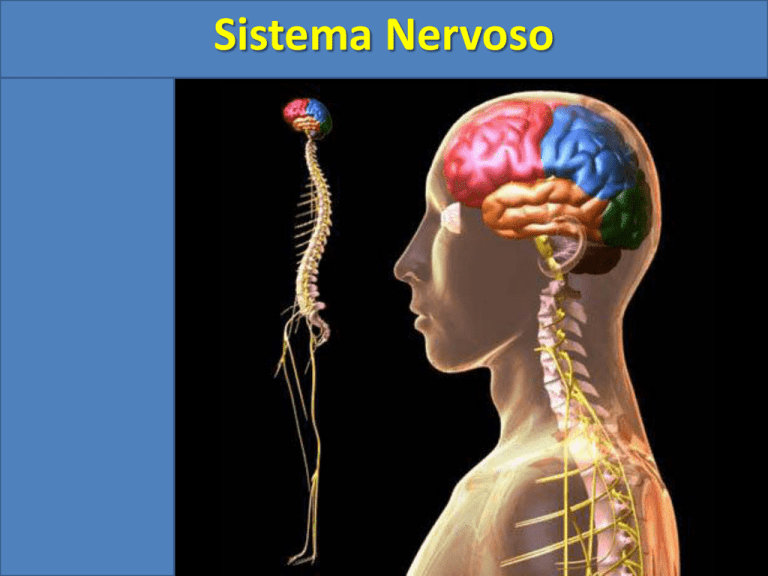 Sistema Nervoso Sistema Nervoso 1) Introdução O sistema nervoso é responsável pelo ajustamento do organismo ao ambiente. Sua função é perceber e identificar as condições ambientais externas, bem como as condições reinantes dentro do próprio corpo e elaborar respostas que adaptem a essas condições. 2) Organização do sistema nervoso humano Cérebro Encéfalo Sistema Nervoso Central (SNC) Cerebelo Mesencéfalo Tronco Encefálico Ponte Bulbo Medula Sistema Nervoso Periférico (SNP) Nervos cranianos (12 pares) Nervos raquidianos (31 pares) Terminações nervosas Sistema Nervoso 3) Sistema nervoso central (SNC) a) Encéfalo Possui cerca de 1,4 kg nos adultos Está localizado na caixa craniana Dividido em 3 partes: cérebro, cerebelo e tronco encefálico Encéfalo cérebro cerebelo Tronco encefálico Sistema Nervoso 3) Sistema nervoso central (SNC) a) Encéfalo I) Cérebro Constitui cerca de 90% da massa encefálica Sua superfície é bastante pregueada (aumento da superfície) Dividido em dois hemisférios (esquerdo e direito) Dividido em duas partes: o Córtex (externo) – substância cinzenta (corpos neuronais) o Região interna – substância branca (dendritos e axônios) Sistema Nervoso 3) Sistema nervoso central (SNC) a) Encéfalo I) Cérebro Funções: o Sensações o Atos conscientes e voluntários (movimentos) o Pensamento o Memória o Inteligência o Aprendizagem o Sentidos o Equilíbrio Sistema Nervoso 3) Sistema nervoso central (SNC) a) Encéfalo I) Cérebro Tálamo e Hipotálamo (presentes na região inferior do cérebro) Tálamo o Reorganização dos estímulos nervosos o Percepção sensorial (consciência) Hipotálamo o Regulador da homeostase corporal o Temperatura o Apetite o Balanço hídrico o Controle da hipófise e outras glândulas Sistema Nervoso 3) Sistema nervoso central (SNC) I) Cérebro Tálamo e Hipotálamo Tálamo Hipotálamo Sistema Nervoso 3) Sistema nervoso central (SNC) II) Cerebelo Responsável pelo equilíbrio do corpo Tônus e vigor muscular Orientação espacial Coordenação dos movimentos Cerebelo Sistema Nervoso 3) Sistema nervoso central (SNC) III) Tronco encefálico 3 divisões: Mesencéfalo Ponte Bulbo Mesencéfalo Ponte Bulbo Sistema Nervoso 3) Sistema nervoso central (SNC) III) Tronco encefálico Mesencéfalo o Recepção e coordenação da contração muscular o Postura corporal Mesencéfalo Sistema Nervoso 3) Sistema nervoso central (SNC) III) Tronco encefálico Ponte o Manutenção da postura corporal, equilíbrio do corpo e tônus muscular. Ponte Sistema Nervoso 3) Sistema nervoso central (SNC) III) Tronco encefálico Bulbo o Controle dos batimentos cardíacos o Controle dos movimentos respiratórios o Controle da deglutição (engolir) Bulbo Sistema Nervoso 3) Sistema nervoso central (SNC) b) Medula Espinhal (raque) Cordão cilíndrico que parte da base do encéfalo e percorre toda a coluna vertebral. Aloja-se dentro das perfurações das vértebras. Da medula espinhal partem 31 pares de nervos raquidianos Sistema Nervoso 3) Sistema nervoso central (SNC) b) Medula Espinhal (raque) Funções da medula o Recebe as informações de diversas partes do corpo e as enviam para o encéfalo e vice-versa. o Responsável pelos atos reflexos (reflexo medular). Sistema Nervoso 3) Sistema nervoso central (SNC) b) Medula Espinhal Reflexo Medular A medula espinhal é capaz de elaborar respostas rápidas em situações de emergência, sem a interferência do encéfalo. Sistema Nervoso 3) Sistema nervoso central (SNC) c) Meninges São três (SNC). o o o delicadas membranas que revestem e protegem o sistema nervoso central Dura-máter Aracnóide Pia-máter Medula espinhal Encéfalo Sistema Nervoso 4) Sistema nervoso periférico (SNP) Constituído por: a) Nervos b) Gânglios nervosos c) Terminações nervosas (receptores para dor, tato, frio, pressão, calor, paladar, etc.). Nervos São fios finos formados por vários axônios de neurônios envolvidos por tecido conjuntivo. Transmitem mensagens de várias partes do corpo para o sistema nervoso central ou destes para as regiões corporais. Sistema Nervoso 4) Sistema nervoso periférico (SNP) Classificação dos nervos I) Quanto ao tipo de neurônio Sensitivos ou aferentes (contém apenas neurônios sensitivos) Motores ou eferentes (contém apenas neurônios motores) Mistos (contém neurônios sensitivos e motores) II) Quanto à posição anatômica Cranianos (ligados ao encéfalo) – 12 pares Raquidianos ou espinhais (ligados à medula) – 31 pares Sistema Nervoso 4) Sistema nervoso periférico (SNP) Gânglios nervosos o Aglomerado de corpos celulares de neurônios encontrados fora do sistema nervo central. Corpos celulares Sistema Nervoso 4) Sistema nervoso periférico (SNP) Terminações Nervosas Captam estímulos do meio interno ou externo e os levam para o sistema nervoso central. Sistema Nervoso 4) Sistema nervoso periférico (SNP) Divisão do sistema nervoso periférico Sistema Nervoso Voluntário (somático) Ações conscientes: andar, falar, pensar, movimentar um braço, etc. Sistema Nervoso Autônomo (visceral) Ações inconscientes: controle da Simpático digestão, batimentos cardíacos, Parassimpático movimento das vísceras, etc. Sistema Nervoso 4) Sistema nervoso periférico (SNP) a) Sistema Nervoso Voluntário (Somático) Formado por nervos motores que conduzem impulsos do sistema nervoso central (SNC) à musculatura estriada esquelética. Determina ações conscientes: Andar, falar, abraçar, correr, etc. SNC Corpos celulares dentro do SNC Axônios controlando a musculatura esquelética Sistema Nervoso 4) Sistema nervoso periférico (SNP) b) Sistema Nervoso Autônomo (vegetativo ou visceral) Constituído por nervos motores que conduzem impulsos do sistema nervoso central à musculatura lisa de órgãos viscerais, músculos cardíacos e glândulas. Realiza o controle da digestão, sistema cardiovascular, excretor e endócrino. Os nervos do SNP autônomo possuem dois tipos de neur
