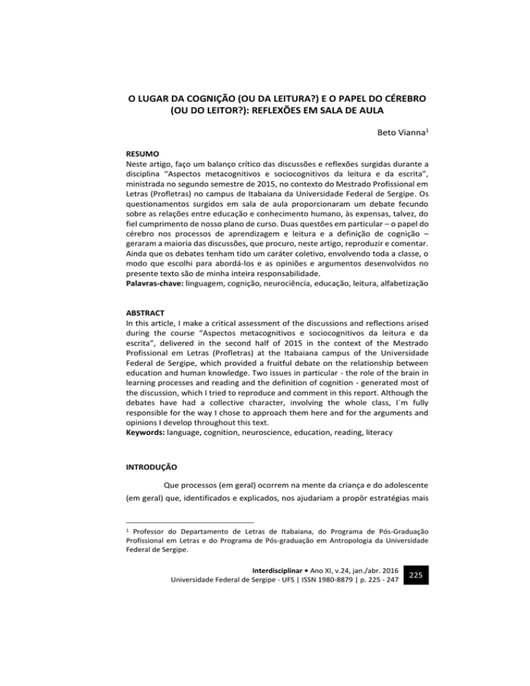 O LUGAR DA COGNIÇÃO (OU DA LEITURA?) E O PAPEL DO CÉREBRO (OU DO LEITOR?): REFLEXÕES EM SALA DE AULA Beto Vianna1 RESUMO Neste artigo, faço um balanço crítico das discussões e reflexões surgidas durante a disciplina “Aspectos metacognitivos e sociocognitivos da leitura e da escrita”, ministrada no segundo semestre de 2015, no contexto do Mestrado Profissional em Letras (Profletras) no campus de Itabaiana da Universidade Federal de Sergipe. Os questionamentos surgidos em sala de aula proporcionaram um debate fecundo sobre as relações entre educação e conhecimento humano, às expensas, talvez, do fiel cumprimento de nosso plano de curso. Duas questões em particular – o papel do cérebro nos processos de aprendizagem e leitura e a definição de cognição – geraram a maioria das discussões, que procuro, neste artigo, reproduzir e comentar. Ainda que os debates tenham tido um caráter coletivo, envolvendo toda a classe, o modo que escolhi para abordá-los e as opiniões e argumentos desenvolvidos no presente texto são de minha inteira responsabilidade. Palavras-chave: linguagem, cognição, neurociência, educação, leitura, alfabetização ABSTRACT In this article, I make a critical assessment of the discussions and reflections arised during the course “Aspectos metacognitivos e sociocognitivos da leitura e da escrita”, delivered in the second half of 2015 in the context of the Mestrado Profissional em Letras (Profletras) at the Itabaiana campus of the Universidade Federal de Sergipe, which provided a fruitful debate on the relationship between education and human knowledge. Two issues in particular - the role of the brain in learning processes and reading and the definition of cognition - generated most of the discussion, which I tried to reproduce and comment in this report. Although the debates have had a collective character, involving the whole class, I´m fully responsible for the way I chose to approach them here and for the arguments and opinions I develop throughout this text. Keywords: language, cognition, neuroscience, education, reading, literacy INTRODUÇÃO Que processos (em geral) ocorrem na mente da criança e do adolescente (em geral) que, identificados e explicados, nos ajudariam a propôr estratégias mais Professor do Departamento de Letras de Itabaiana, do Programa de Pós-Graduação Profissional em Letras e do Programa de Pós-graduação em Antropologia da Universidade Federal de Sergipe. 1 Interdisciplinar • Ano XI, v.24, jan./abr. 2016 Universidade Federal de Sergipe - UFS | ISSN 1980-8879 | p. 225 - 247 225 Beto Vianna_______________________________________________________________________________________ adequadas de alfabetização, ou de letramento, ou de recepção e produção textual, em sala de aula? Essa parece ser uma pergunta razoável, ainda que bastante extensa, em uma disciplina chamada “Aspectos metacognitivos e sociocognitivos da leitura e da escrita”. Ou mesmo a pergunta necessária, dados os objetivos explícitos da disciplina e seu contexto acadêmico, um mestrado profissional para professores de Letras, pessoas que trabalham e pretendem continuar trabalhando com alunos das séries fundamentais e médias, ensinando língua ou literatura. Há o risco, no entanto, da pergunta soar fora de moda. Primeiro, a qualidade “cognitivo” parece mobilizar recursos conceituais bem mais interessantes (no sentido chomskyano de interessante, ou seja, cientificamente relevante; CHOMSKY, 1993, p. 52) do que, simplesmente, investigar propriedades ou processos mentais. Depois, é preciso lidar com os prefixos “meta” e “socio”, derivações atualíssimas que sugerem alçar o cognitivo a domínios ainda mais complexos, e quem sabe, mais interessantes, de inquirição. Tomamos como tarefa em classe, no entanto, não nos assustarmos antecipadamente com o hermetismo vocabular do nome da disciplina, e partimos do pressuposto de que há, afinal de contas, um longo habitus, tanto em educação quanto em ciências linguísticas, de relacionar o que as pessoas fazem quando estão aprendendo, ou imersos na linguagem, com algo que se passa em suas cabeças. Um ponto de partida conservador, mas receptivo, deixando a cargo dos novos paradigmas conceituais ou bem desconstruir, ou ao contrário, reafirnar, essa honrada tradição acadêmica. Em um primeiro momento deste texto (parte 1), e tentando seguir os debates em sala de aula da maneira mais aproximada possível, vou argumentar que a ideia de ideia, ou seja, a noção de que os afazeres humanos são precedidos de uma operação mental – a realidade diante do “Olho da Mente”, na caracterização de Rorty (1994, p.151) –, é pervasiva na linguagem que usamos para falar sobre linguagem e educação até os nossos dias, ainda que haja nuances epistemológicas, às vezes até antagônicas, nas descrições e na atribuição de poder explicativo aos processos mentais. Na parte 1.1, discuto principalmente a ideia de ideia (seus defensores, suas limitações e seus opositores) nas teorias da aprendizagem e, na parte 1.2, nas ciências da linguagem. Sempre lembrando que, apesar dos tópicos parecerem ambiciosos, não proponho aqui o exame profundo de nenhum deles, mas retomar a trilha das discussões que percorremos em sala de aula. Não é meu 226 Interdisciplinar • Ano XI, v.24, jan./abr. 2016 p. 225 - 247 | ISSN 1980-8879 | Universidade Federal de Sergipe - UFS ____O LUGAR DA COGNIÇÃO (OU DA LEITURA?) E O PAPEL DO CÉREBRO (OU DO LEITOR?): REFLEXÕES EM SALA DE AULA objetivo, enfim, oferecer soluções, mas explicitar e comentar criticamente as dúvidas e as fontes das dúvidas que surgiram no percurso da disciplina. Dois desenvolvimentos do Olho da Mente, também tributários dos epistemologistas dos séculos XVIII e XIX, mas com consequências e ramificações diversas entre as ciências empíricas mais recentes, como a psicologia, a linguística e os estudos neurocognitivo