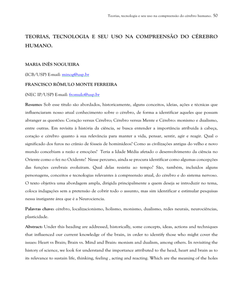 Teorias, tecnologia e seu uso na compreensão do cérebro humano. 50 TEORIAS, TECNOLOGIA E SEU USO NA COMPREENSÃO DO CÉREBRO HUMANO. MARIA INÊS NOGUEIRA (ICB/USP) E-mail: [email protected] FRANCISCO RÔMULO MONTE FERREIRA (NEC IP/USP) E-mail: [email protected] Resumo: Sob esse título são abordados, historicamente, alguns conceitos, ideias, ações e técnicas que influenciaram nosso atual conhecimento sobre o cérebro, de forma a identificar aqueles que possam abranger as questões: Coração versus Cérebro; Cérebro versus Mente e Cérebro: monismo e dualismo, entre outras. Em revisita à história da ciência, se busca entender a importância atribuída à cabeça, coração e cérebro quanto à sua relevância para manter a vida, pensar, sentir, agir e reagir. Qual o significado dos furos no crânio de fósseis de hominídeos? Como as civilizações antigas do velho e novo mundo concebiam a razão e emoções? Teria a Idade Média afetado o desenvolvimento da ciência no Oriente como o fez no Ocidente? Nesse percurso, ainda se procura identificar como algumas concepções das funções cerebrais evoluíram. Qual delas resistiu ao tempo? São, também, incluídos alguns personagens, conceitos e tecnologias relevantes à compreensão atual, do cérebro e do sistema nervoso. O texto objetiva uma abordagem ampla, dirigida principalmente a quem deseja se introduzir no tema, coloca indagações sem a pretensão de cobrir todo o assunto, mas sim identificar e estimular pesquisas nessa instigante área que é a Neurociencia. Palavras chave: cérebro, localizacionismo, holismo, monismo, dualismo, redes neurais, neurociências, plasticidade. Abstract: Under this heading are addressed, historically, some concepts, ideas, actions and techniques that influenced our current knowledge of the brain, in order to identify those who might cover the issues: Heart vs Brain; Brain vs. Mind and Brain: monism and dualism, among others. In revisiting the history of science, we look for understand the importance attributed to the head, heart and brain as to its relevance to sustain life, thinking, feeling , acting and reacting. Which are the meaning of the holes 51 Revista Kronos. Número 2. Ano 2. found in the skull of hominid fossils? How the ancient civilizations of the old and new world conceived reason and emotions? Would the Middle Ages have affected the development of science in the East as it did in the West? In this trajectory, also we try to identify how some concepts of brain functions evolved. Which one resisted the time? There were also included some characters, concepts and technologies relevant to the current understanding of the brain and the nervous system. The text yet aims to represent a comprehensive approach directed primarily to those who want to be introduced to the subject, it also puts questions without the intention to cover the whole subject, but rather to identify and encourage research in this exciting journey. Key words: brain, localizationism, holism, monism, dualism, neural networks, neuroscience, plasticity. Introdução. O corpo é o objeto de estudo mais próximo de nós. Em inglês a expressão “take for granted”, “tomar por garantido”, reflete bem nossa relação com ele. Esse significado que custamos a apreender, mas que ao fazê-lo percebemos o quanto somos inconscientes dos instigantes mecanismos e estratégias evolutivas que resultaram em sua constituição e organização, suas habilidades e potencialidades. Aquisições evolutivas extraordinárias que, em geral, sequer cogitamos sobre sua presença ou ausência. Referimo-nos ao corpo humano, sua organização e funções, com ênfase em uma região em especial, o cérebro. Aquela que possibilita nosso estilo de vida, as ações comuns do dia-a-dia, tais como: dormir, acordar, perceber, aprender e interagir com o mundo ao redor. Contudo, a qualidade e intensidade desse viver resultam de vontades e desejos que precisam ser planejados para serem concretizados. Hoje, com certeza, a maioria de nós diria que as vontades aparecem na cabeça, sendo um pouco mais especifico indicaríamos: o cérebro, mas, e nossos antepassados como pensavam a respeito? Este estudo objetiva identificar as principais estratégias e técnicas de abordagem que nos permitem hoje compreendê-lo melhor. Organização geral do cérebro. O cérebro, que utilizamos para compreendermo-nos e nos relacionarmos é a parte do sistema nervoso mais proeminente, a mais visível do encéfalo. Ele é quem reconhece um desejo, organiza ações e mobiliza estruturas neurais e corporais para realizá-las. O encéfalo corresponde ao tecido nervoso localizado dentro da caixa craniana. Em inglês o encéfalo e o cérebro são, de forma geral, chamados de “brain” (cérebro), mas a rigor o cérebro é formado por algumas partes do encéfalo, quais sejam: o córtex Teorias, tecnologia e seu uso na compreensão do cérebro humano. 52 cerebral (arqui-, paleo- e neocortex) e o diencéfalo (tálamo e hipotálamo), entre ambos estão os núcleos da base: caudado, putamem, globo pálido, amigdala, claustrum, accumbens e núcleos septais (figura 1). Estas estruturas serão retomadas em alguns momentos, assim como a organização do sistema nervoso que brevemente abordamos nos parágrafos seguintes. Como a maioria dos textos simplifica o encéfalo e considera apenas o cérebro, manteremos essa simplificação assumindo que essa diferença já foi identificada. Figura 9: O encéfalo e suas partes componentes. À direita em vista lateral estão representados os 5 lóbulos. À esquerda, em corte sagital acima estão representados o cérebro, tronco cerebral e cerebelo e abaixo, em corte frontal está representada a disposição dos corpos dos neurônios, corados em bege, localizados na periferia; e os seus prolongamentos que efetuam as conexões com outras regiões, os axônios revestidos pela célula da glia, oligodendrócitos, que os envolve com camadas de lipí