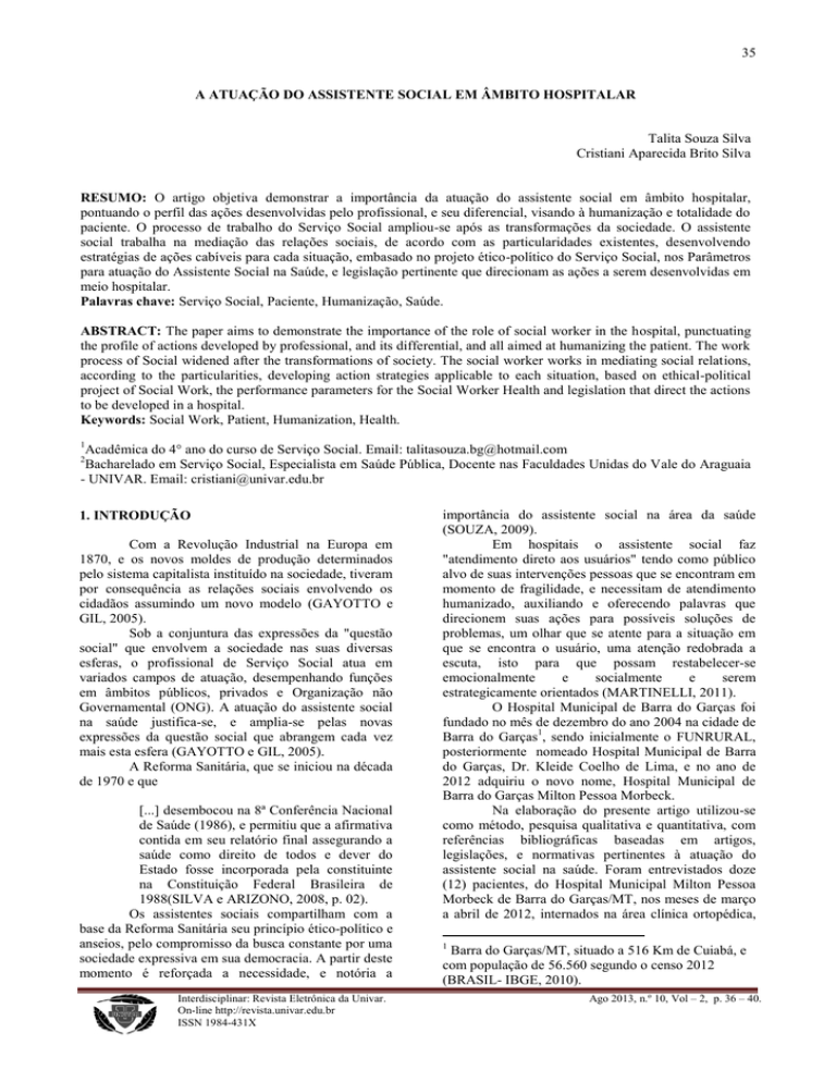 35 A ATUAÇÃO DO ASSISTENTE SOCIAL EM ÂMBITO HOSPITALAR Talita Souza Silva Cristiani Aparecida Brito Silva RESUMO: O artigo objetiva demonstrar a importância da atuação do assistente social em âmbito hospitalar, pontuando o perfil das ações desenvolvidas pelo profissional, e seu diferencial, visando à humanização e totalidade do paciente. O processo de trabalho do Serviço Social ampliou-se após as transformações da sociedade. O assistente social trabalha na mediação das relações sociais, de acordo com as particularidades existentes, desenvolvendo estratégias de ações cabíveis para cada situação, embasado no projeto ético-político do Serviço Social, nos Parâmetros para atuação do Assistente Social na Saúde, e legislação pertinente que direcionam as ações a serem desenvolvidas em meio hospitalar. Palavras chave: Serviço Social, Paciente, Humanização, Saúde. ABSTRACT: The paper aims to demonstrate the importance of the role of social worker in the hospital, punctuating the profile of actions developed by professional, and its differential, and all aimed at humanizing the patient. The work process of Social widened after the transformations of society. The social worker works in mediating social relations, according to the particularities, developing action strategies applicable to each situation, based on ethical-political project of Social Work, the performance parameters for the Social Worker Health and legislation that direct the actions to be developed in a hospital. Keywords: Social Work, Patient, Humanization, Health. 1 Acadêmica do 4° ano do curso de Serviço Social. Email: [email protected] Bacharelado em Serviço Social, Especialista em Saúde Pública, Docente nas Faculdades Unidas do Vale do Araguaia - UNIVAR. Email: [email protected] 2 1. INTRODUÇÃO Com a Revolução Industrial na Europa em 1870, e os novos moldes de produção determinados pelo sistema capitalista instituído na sociedade, tiveram por consequência as relações sociais envolvendo os cidadãos assumindo um novo modelo (GAYOTTO e GIL, 2005). Sob a conjuntura das expressões da "questão social" que envolvem a sociedade nas suas diversas esferas, o profissional de Serviço Social atua em variados campos de atuação, desempenhando funções em âmbitos públicos, privados e Organização não Governamental (ONG). A atuação do assistente social na saúde justifica-se, e amplia-se pelas novas expressões da questão social que abrangem cada vez mais esta esfera (GAYOTTO e GIL, 2005). A Reforma Sanitária, que se iniciou na década de 1970 e que [...] desembocou na 8ª Conferência Nacional de Saúde (1986), e permitiu que a afirmativa contida em seu relatório final assegurando a saúde como direito de todos e dever do Estado fosse incorporada pela constituinte na Constituição Federal Brasileira de 1988(SILVA e ARIZONO, 2008, p. 02). Os assistentes sociais compartilham com a base da Reforma Sanitária seu princípio ético-político e anseios, pelo compromisso da busca constante por uma sociedade expressiva em sua democracia. A partir deste momento é reforçada a necessidade, e notória a Interdisciplinar: Revista Eletrônica da Univar. On-line http://revista.univar.edu.br ISSN 1984-431X importância do assistente social na área da saúde (SOUZA, 2009). Em hospitais o assistente social faz "atendimento direto aos usuários" tendo como público alvo de suas intervenções pessoas que se encontram em momento de fragilidade, e necessitam de atendimento humanizado, auxiliando e oferecendo palavras que direcionem suas ações para possíveis soluções de problemas, um olhar que se atente para a situação em que se encontra o usuário, uma atenção redobrada a escuta, isto para que possam restabelecer-se emocionalmente e socialmente e serem estrategicamente orientados (MARTINELLI, 2011). O Hospital Municipal de Barra do Garças foi fundado no mês de dezembro do ano 2004 na cidade de Barra do Garças1, sendo inicialmente o FUNRURAL, posteriormente nomeado Hospital Municipal de Barra do Garças, Dr. Kleide Coelho de Lima, e no ano de 2012 adquiriu o novo nome, Hospital Municipal de Barra do Garças Milton Pessoa Morbeck. Na elaboração do presente artigo utilizou-se como método, pesquisa qualitativa e quantitativa, com referências bibliográficas baseadas em artigos, legislações, e normativas pertinentes à atuação do assistente social na saúde. Foram entrevistados doze (12) pacientes, do Hospital Municipal Milton Pessoa Morbeck de Barra do Garças/MT, nos meses de março a abril de 2012, internados na área clínica ortopédica, 1 Barra do Garças/MT, situado a 516 Km de Cuiabá, e com população de 56.560 segundo o censo 2012 (BRASIL- IBGE, 2010). Ago 2013, n.º 10, Vol – 2, p. 36 – 40. 36 com cinco (5) enfermarias ocupadas por pacientes acometidos de variadas disfunções ortopédicas. Todos estes aspectos expressam-se com mais intensidade nos pacientes internados no setor ortopédico, por afetar diretamente o modo de vida da pessoa fazendo-se tão necessária a intervenção do assistente social. Diante do exposto, busca-se demonstrar o perfil e a importância do papel do assistente social em âmbito de internação no setor ortopédico no Hospital Municipal de Barra do Garças/MT. 2. HISTORICIDADE DO SERVIÇO SOCIAL No sistema capitalista emergiram de modo consistente, problemáticas sociais, viu-se a necessidade de alguém para lidar com estas pessoas que eram considerados desajustados por não se adequarem ao sistema capitalista. As senhoras da alta sociedade, as chamadas "damas de caridade", vinculadas a Igreja Católica, começaram a lidar com estes problemas com um caráter assistencialista e caritativo, desenvolvendo a função de auxiliar, ajudar e cuidar dessas pessoas (GAYOTTO e GIL, 2005). Dava-se início ao processo de legitimação da "questão social" e suas expressões, (miséria, condições precárias da saúde, falta de infraestrutura,