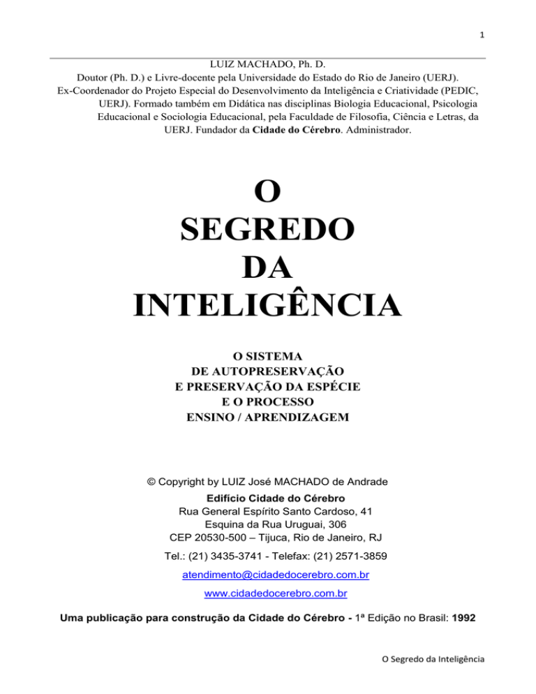 1 LUIZ MACHADO, Ph. D. Doutor (Ph. D.) e Livre-docente pela Universidade do Estado do Rio de Janeiro (UERJ). Ex-Coordenador do Projeto Especial do Desenvolvimento da Inteligência e Criatividade (PEDIC, UERJ). Formado também em Didática nas disciplinas Biologia Educacional, Psicologia Educacional e Sociologia Educacional, pela Faculdade de Filosofia, Ciência e Letras, da UERJ. Fundador da Cidade do Cérebro. Administrador. O SEGREDO DA INTELIGÊNCIA O SISTEMA DE AUTOPRESERVAÇÃO E PRESERVAÇÃO DA ESPÉCIE E O PROCESSO ENSINO / APRENDIZAGEM © Copyright by LUIZ José MACHADO de Andrade Edifício Cidade do Cérebro Rua General Espírito Santo Cardoso, 41 Esquina da Rua Uruguai, 306 CEP 20530-500 – Tijuca, Rio de Janeiro, RJ Tel.: (21) 3435-3741 - Telefax: (21) 2571-3859 [email protected] www.cidadedocerebro.com.br Uma publicação para construção da Cidade do Cérebro - 1ª Edição no Brasil: 1992 O Segredo da Inteligência 2 Índice Apresentação – 3 Eu tenho um Sonho - 4 Introdução - 5 Hipótese - 9 Discussão - 13 A comunicação com o SAPE - 18 Funções que envolvem primordialmente o SAPE - 22 Conclusões - 24 Professor Luiz Machado - 26 Bibliografia - 30 Livros do Prof. Luiz Machado na biblioteca virtual Cidade do Cérebro – 36 O Segredo da Inteligência 3 Apresentação O título deste livro carrega consigo, pelo menos, duas intenções do autor: a primeira, dizer a maneira pela qual uma pessoa pode desenvolver suas capacidades como elemento de autorealização; a segunda, como pode o Homem fazer jus ao adjetivo “racional”, empregando o seu intelecto no sentido de conhecer a si mesmo, de entender seu sistema de autopreservação e preservação da espécie (SAPE) *, repositório de toda a sabedoria da espécie, compondo um todo harmônico com suas estruturas cerebrais. A maioria das pessoas crê que o intelecto, com sua “razão”, seja o mais alto progresso mental. Essa atitude, que procura a “certeza científica” de tudo, acaba por coisificar o Homem. A estrutura do cérebro, que torna possível o intelecto, parece ser a mais recente na evolução do homem, com cerca de 200 milhões de anos, e seu desenvolvimento é quase nulo se comparado com o do SAPE. Mas o homem com a crença no exclusivo poder de seu intelecto é uma aberração da Natureza; por isso, volta-se contra ela, contra si mesmo – pelo menos é o que tem demonstrado, com a destruição do seu ambiente, com o aperfeiçoamento da guerra. Sabemos todos que o processo de racionalização dos acontecimentos é destituído de emoções e sentimentos. Que sabedoria, que ciência é esta que levou o homem à preparação de artefatos nucleares que põem em risco a sua própria espécie? “Que é inteligência?” é uma pergunta que ainda não obteve resposta satisfatória. Inteligência tem sido confundida com memória, com capacidade de aprender e até com a “capacidade de resolver testes de inteligência”...; todavia, no sentido em que estamos usando a palavra, ela indica resposta do ser às suas necessidades. Apresentamos, nas páginas seguintes, aquilo que conseguimos identificar como as bases científicas das realizações humanas, quer ligadas à inteligência, quer relacionadas a fenômenos psíquicos. O Homem, ao saber como funcionam os sistemas de suas capacidades, pode usá-los para crescer como gente e como profissional, transformando conhecimento em sabedoria para uma vida melhor. *Consideramos o sistema de autopreservação e preservação da espécie como composto do sistema límbico e do sistema glandular. O Segredo da Inteligência 4 Eu tenho um Sonho... Que as pessoas sejam melhores, como profissionais e como gente; Que não acreditem no impossível; Que aqueles que duvidam de suas capacidades, se arrependam diante de suas conquistas; Que a ciência não seja usada como instrumento de dominação, como ainda é por aqueles que teimam em não reconhecer que o Ser Humano é corpo, mente e espírito; Que a farsa do Q.I. não sirva aos interesses daqueles que desejam substituir a idéia de “sangue azul” pela de “cérebro azul”; Que as pessoas saibam que a inteligência é uma faculdade que pode ser desenvolvida e não algo que vem pronto com o nascimento e não pode ser alterado; Que as pessoas despertem algo que talvez nem saibam que possuem e muita gente faz questão que elas não saibam: um gênio interior; Que todos saibam que têm o direito de ser inteligentes. Prof. Luiz Machado O Segredo da Inteligência 5 Introdução A Humanidade tem testemunhado os fenômenos mais intrigantes a respeito do Homem e, na falta de explicação de ciência certa, as pessoas os têm atribuído a fatores sobrenaturais, a deuses e ao demônio... Tratar-se-ia, então, de “mistérios deste e do outro mundo”... Ora são curas espetaculares, ora são realizações que parecem transcender o limite das capacidades humanas, ora são feitos de inteligência que assombram a Humanidade. O chamado “efeito mágico”, quer nas curas espetaculares, quer em quaisquer outras manifestações, como, por exemplo, da aprendizagem acelerativa, resultado da mobilização de reservas mentais normalmente não usadas, é sempre obtido diante do prestígio, da autoridade (entenda-se “competência profissional”) e do processo; em outras palavras, o “feiticeiro”, a “palavra mágica” e o “ritual”. Assim foi com os cultos primitivos, assim ainda é nas religiões e crenças e o mesmo ocorre com os mágicos modernos, os cientistas. Em qualquer ciência, encontramos esses elementos e, mais, os “mitos” em que certas “verdades cientificas” foram transformadas. O chamado “efeito mágico” não pertence ao campo do querer intelectual, mas, sim, da representação mental daquilo que se saiba querer, sem esforço de vontade (pois a idéia do “esforço” traz em si a representação mental da dificuldade), sem vacilações. A vacilação (hesitação, incerteza de propósito) confunde a