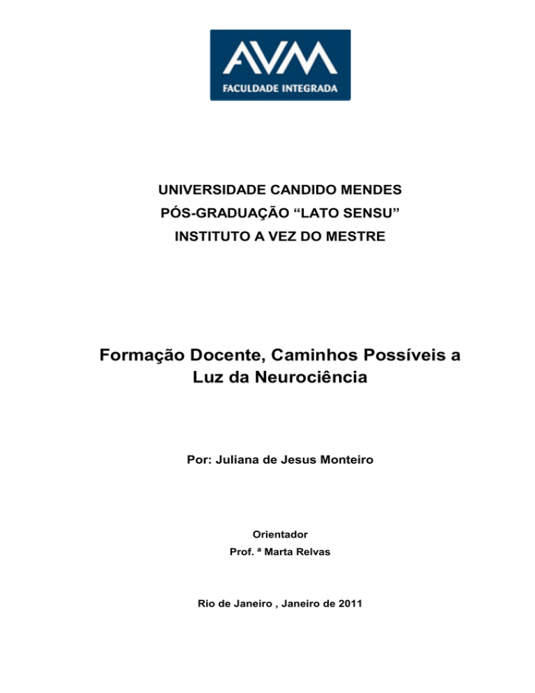 UNIVERSIDADE CANDIDO MENDES PÓS-GRADUAÇÃO “LATO SENSU” INSTITUTO A VEZ DO MESTRE Formação Docente, Caminhos Possíveis a Luz da Neurociência Por: Juliana de Jesus Monteiro Orientador Prof. ª Marta Relvas Rio de Janeiro , Janeiro de 2011 2 UNIVERSIDADE CANDIDO MENDES PÓS-GRADUAÇÃO “LATO SENSU” INSTITUTO A VEZ DO MESTRE Formação Docente, Caminhos Possíveis a Luz da Neurociência Apresentação Candido de Mendes monografia como à requisito Universidade parcial para obtenção do grau de especialista em Neurociência Pedagógica. Por: . Juliana de Jesus Monteiro 3 AGRADECIMENTOS Primeiramente, agradeço a Deus, minha fortaleza, que me concedeu um espírito que percebe a necessidade de viver a plenitude do “ser gente”. Por conta desse espírito, que reconhece a incompletude e imperfeição do ser, busco, a cada dia, o autoconhecimento, avaliando minha jornada e retomando alguns caminhos, num processo de reconstrução contínua, interminável. Aos meus pais. Eles são os grandes responsáveis pela minha autonomia e pela percepção que tenho de que na desordem, em meio ao inesperado, é possível fazer emergir forças e evoluir. Á Marcos, por toda paciência e companheirismo. À professora e orientadora Marta Relvas. Para sempre será lembrada, por seu estímulo inicial, por sua dedicação e brilhantismo intelectual. Aos meus amigos, Aline Zivianni, Michele Soares, Fabiana Carvalho, amigo e irmão Francisco Monteiro a os quais me estiveram sempre presentes pacientemente ouvindo-me ler os textos, capítulos idéias e descobertas em neurociências e contribuindo com suas criticas e elogios nesse processo de reconstrução do conhecimento. Às amizades que o Curso de Neurociência Pedagógica me presenteou: Beth, Patrícia e Rosa. Aos demais familiares, amigos e professores, que de alguma forma contribuíram para que eu realizasse essa jornada evolutiva. 4 DEDICATÓRIA Para todos aqueles que acreditam em práticas pedagógicas verdadeiramente comprometidas com os processos do ensino/aprendizagem, amam sua profissão e que por isso reconhecem seu importante papel na vida dos alunos que lhe são confiados. Sempre prontos a aprender e dispostos reaprender a ensinar. 5 RESUMO O presente estudo aborda a possibilidade de inserção dos significativos avanços da neurociência, como constituintes de saberes disciplinares, nos cursos de formação de professores. Na perspectiva adotada, esses saberes, que fundamentam um saber pedagógico, proporcionam subsídios teóricos para a ação docente, uma vez que a compreensão de como o cérebro funciona permite um melhor entendimento da aprendizagem e o conseqüente aprimoramento da transposição didática. Como resultado, destacase a necessidade de revisão das estruturas curriculares dos cursos de formação de professores, em especial das licenciaturas, indicando como alternativa a inserção de disciplinas, ou a reestruturação de disciplinas já existentes, com vistas a propiciar a interlocução entre neurociência, ensino e aprendizagem. 6 METODOLOGIA “A maneira de pensar complexa prolonga-se em maneira de agir complexa” (MORIN, 2002a, p. 339). Considerando que o objetivo principal do trabalho, que foi apresentar contribuições da neurociência para a formação docente, buscou conhecimentos sobre o tema observando a prática pedagógica de docentes em uma Escola da Rede Municipal em Petrópolis/RJ e abarcou-se em pesquisa bibliográfica de produção teórica de pesquisadores de ensino/aprendizagem tais como: Demo , Moraes, Morin , Pozo, Perrenoud, Relvas, Wallon, entre outros, também foi utilizado como fonte de pesquisa a Lei de Diretrizes e Bases; que trata da Formação de Professores, OCDE – Organização de Cooperação e Desenvolvimento Econômicos Compreendendo o cérebro: rumo a uma nova ciência do aprendizado, entre outros artigos e revistas científicas. 7 SUMÁRIO INTRODUÇÃO..................................................................................................08 CAPÍTULO I - Neurociências...........................................................................12 1.1 Neurociências e Educação........................................................................ 13 CAPÍTULO II - Formação Docente Repensando Práticas Pedagógicas..........15 CAPÍTULO III – A Arte de Ensinar a Luz da Neurociência ..............................21 CAPÍTULO IV – Ensino/Aprendizagem e Neurociências Caminhos Possíveis ..........................................................................................................................27 CAPÍTULO V – Cérebro e Aprendizagem....................................................... 40 5.1- Sinapses ..................................................................................................43 5.2- Córtex Pré-Frontal ....................................................................................45 5.3- Memória e Aprendizagem..........................................................................49 5.4-Plasticidade Cerebral..................................................................................52 5.5- Emoção, Motivação e Aprendizagem .......................................................54 CAPÍTULO VI – Conhecimentos Neurocientificos-Contribuições para Formação Docente............................................................................................................56 CONSIDERAÇÕES FINAIS ........................................................................... 64 REFEÊNCIA BIBLIOGRÁFICA....................................................................... 67 8 1 INTRODUÇÃO “Ensinar é fundamentalmente Aprender.” (Marta Relvas, 2009) O tema abordado pelo presente estudo trata da “Formação Docente e Neurociência: uma articulação necessária, contribuições da neurociência para prática pedagógica”. Professores conhecem e entendem o processo ensino/aprendizagem? Compreendem a 