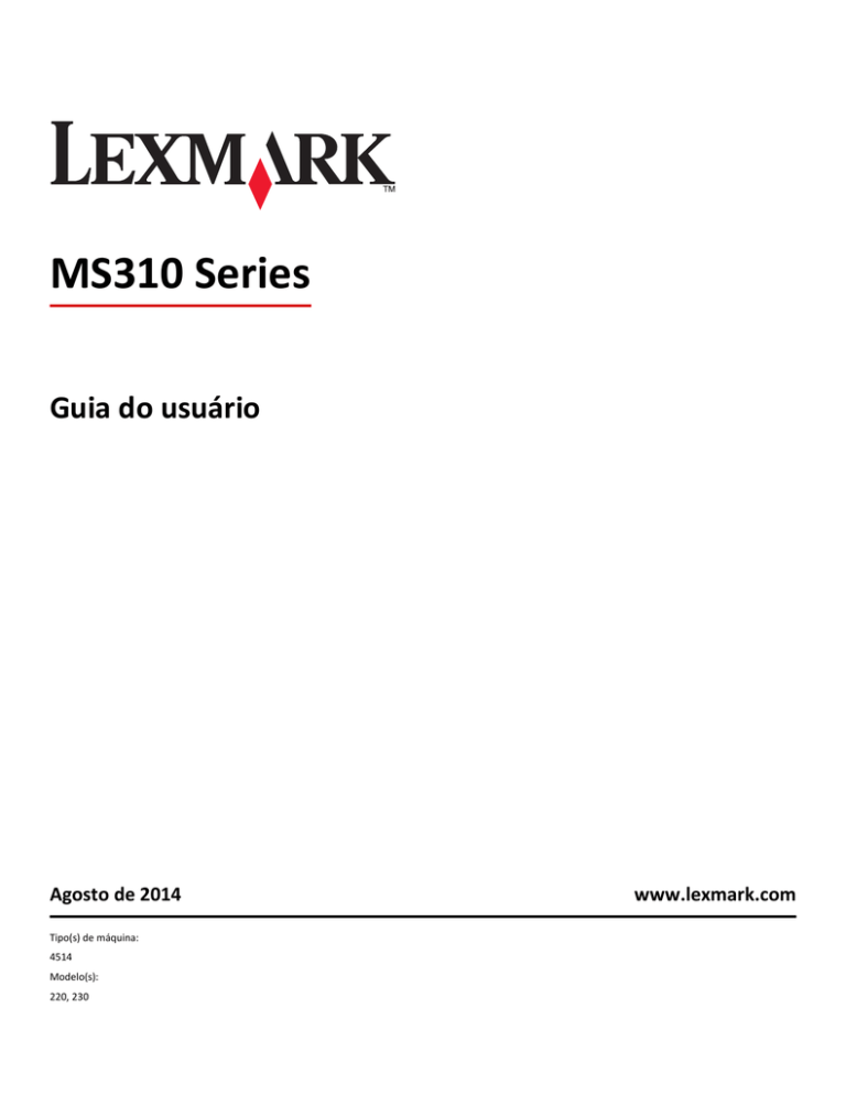 MS310 Series Guia do usuário Agosto de 2014 Tipo(s) de máquina: 4514 Modelo(s): 220, 230 www.lexmark.com Conteúdo 2 Conteúdo Informações sobre segurança.......................................................................5 Aprender sobre a impressora.......................................................................7 Localização das informações sobre a impressora.....................................................................................7 Seleção de um local para a impressora.....................................................................................................8 Configurações da impressora....................................................................................................................9 usando o painel de controle....................................................................................................................11 Para entender as seqüências de luzes do painel de controle da impressora..........................................12 Uso do servidor da Web incorporado.....................................................................................................15 Usando o Utilitário de configuração de impressora local.......................................................................16 Configuração adicional da impressora........................................................17 Instalação de hardware opcional............................................................................................................17 Configuração do software da impressora...............................................................................................19 Colocando em rede.................................................................................................................................21 Impressão das configurações de menu e da página de configuração de rede........................................24 Carregamento de papel e mídia especial....................................................25 Configuração do tamanho e do tipo do papel.........................................................................................25 Definição das configurações do papel Universal.....................................................................................25 Uso da bandeja padrão e da parada de papel.........................................................................................26 Carregamento de bandejas.....................................................................................................................26 Carregando o alimentador multi-uso......................................................................................................31 Ligação e desligamento de bandejas.......................................................................................................35 Guia de papel e mídia especial...................................................................38 Diretrizes de papel..................................................................................................................................38 Usando mídia especial.............................................................................................................................41 Armazenamento do papel.......................................................................................................................43 Tamanhos, tipos e pesos de papel suportados.......................................................................................44 Impressão..................................................................................................47 Impressão de documentos......................................................................................................................47 Imprimindo de um dispositivo móvel......................................................................................................48 Cancelamento de um trabalho de impressão.........................................................................................48 Conteúdo 3 Compreendendo os menus da impressora..................................................49 Lista de menus.........................................................................................................................................49 Menu Papel.............................................................................................................................................49 Menu Rede/Portas..................................................................................................................................57 Menu Configurações...............................................................................................................................58 menu Segurança......................................................................................................................................66 Economizar dinheiro e cuidar do meio ambiente........................................67 Economizar papel e toner.......................................................................................................................67 Economizar energia.................................................................................................................................68 Reciclagem..............................................................................................................................................70 Protegendo a impressora...........................................................................72 Uso do recurso de trava de segurança....................................................................................................72 Declaração de volatilidade......................................................................................................................72 Limpando a memória volátil.........................................................................................................