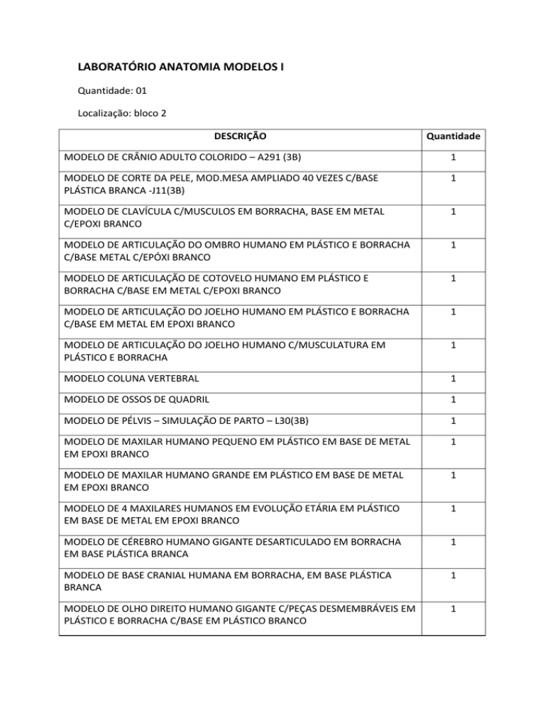 LABORATÓRIO ANATOMIA MODELOS I Quantidade: 01 Localização: bloco 2 DESCRIÇÃO Quantidade MODELO DE CRÂNIO ADULTO COLORIDO – A291 (3B) 1 MODELO DE CORTE DA PELE, MOD.MESA AMPLIADO 40 VEZES C/BASE PLÁSTICA BRANCA -J11(3B) 1 MODELO DE CLAVÍCULA C/MUSCULOS EM BORRACHA, BASE EM METAL C/EPOXI BRANCO 1 MODELO DE ARTICULAÇÃO DO OMBRO HUMANO EM PLÁSTICO E BORRACHA C/BASE METAL C/EPÓXI BRANCO 1 MODELO DE ARTICULAÇÃO DE COTOVELO HUMANO EM PLÁSTICO E BORRACHA C/BASE EM METAL C/EPOXI BRANCO 1 MODELO DE ARTICULAÇÃO DO JOELHO HUMANO EM PLÁSTICO E BORRACHA C/BASE EM METAL EM EPOXI BRANCO 1 MODELO DE ARTICULAÇÃO DO JOELHO HUMANO C/MUSCULATURA EM PLÁSTICO E BORRACHA 1 MODELO COLUNA VERTEBRAL 1 MODELO DE OSSOS DE QUADRIL 1 MODELO DE PÉLVIS – SIMULAÇÃO DE PARTO – L30(3B) 1 MODELO DE MAXILAR HUMANO PEQUENO EM PLÁSTICO EM BASE DE METAL EM EPOXI BRANCO 1 MODELO DE MAXILAR HUMANO GRANDE EM PLÁSTICO EM BASE DE METAL EM EPOXI BRANCO 1 MODELO DE 4 MAXILARES HUMANOS EM EVOLUÇÃO ETÁRIA EM PLÁSTICO EM BASE DE METAL EM EPOXI BRANCO 1 MODELO DE CÉREBRO HUMANO GIGANTE DESARTICULADO EM BORRACHA EM BASE PLÁSTICA BRANCA 1 MODELO DE BASE CRANIAL HUMANA EM BORRACHA, EM BASE PLÁSTICA BRANCA 1 MODELO DE OLHO DIREITO HUMANO GIGANTE C/PEÇAS DESMEMBRÁVEIS EM PLÁSTICO E BORRACHA C/BASE EM PLÁSTICO BRANCO 1 MODELO DE NARIZ HUMANO GIGANTE, DIVIDIDO EM 2 PARTES C/BASE EM MADEIRA 1 MODELO DE ORELHA ESQUERDA HUMANA GIGANTE C/OUVIDO INTERNO DESMEMBRÁVEL, EM PLÁSTICO E BORRACHA, EM BASE DE MADEIRA 1 MODELO DE TRONCO FEM. C/CABEÇA DO CORPO HUMANO C/ORGÃOS DESMENBRÁVEIS EM PLÁSTICO E BORRACHA, C/BASE PLÁSTICA BRANCA 1 MODELO DE TRONCO MASCULINO C/CABEÇA DO CORPO HUMANO C/ORGÃOS DESMEMBRÁVEIS EM PLÁSTICO E BORRACHA COM BASE PLÁSTICA BRANCA 1 MODELO DE CORAÇÃO HUMANO GIGANTE COMPLETO DESMEMBRÁVEL EM PLÁSTICO E BORRACHA C/BASE EM PLÁSTICO BRANCO 1 MODELO DE CORAÇÃO HUMANO EM TAMANHO REAL, DESMEMBRAVEL EM PLÁSTICO E BORRACHA EM BASE PLÁSTICA BRANCA 1 MODELO DE CORAÇÃO HUMANO EM TAMANHO REAL, DESMEMBRAVEL, EM PLÁSTICO E BORRACHA EM BASE PLÁSTICA BRANCA 1 MODELO DE CORAÇÃO HUMANO DESMEMBRAVÉL EM BORRACHA 1 MODELO DE 4 MAXILARES HUMANOS EM EVOLUÇÃO ETÁRIA EM PLÁSTICO EM BASE DE METAL EM EPOXI BRANCO 1 MODELO DE SISTEMA DIGESTIVO HUMANO EM PLÁSTICO EM PLÁSTICO E BORRACHA, C/BASE EM LAMINADO BRANCO 1 MODELO DE PAR DE PULMÕES HUMANOS DESMEMBRÁVEIS EM PLÁSTICO E BORRACHA C/BASE EM MADEIRA 1 MODELO DE SISTEMA RESPIRATÓRIO HUMANO DESMEMBRÁVEL EM PLÁSTICO E BORRACHA C/BASE PLÁSTICA BANCA 1 MODELO DE LARINGE HUMANA DESMEMBRÁVEL EM PLÁSTICO E BORRACHA C/BASE PLÁSTICA BRANCA 1 MODELO SE SISTEMA RESPIRATÓRIO DESMEMBRÁVEL EM PLÁSTICO E BORRACHA C/BASE PLÁSTICA BRANCA 1 MODELO DE ESTOMAGO HUMANO DESMEMBRAVEL EM PLÁSTICO E BORACHA C/BASE PLÁSTICA 1 MODELO DE SISTEMA REPRODUTOR FEMININO HUMANO, DESMEMBRAVEL EM BORRACHA 1 MODELO DE SISTEMA REPRODUTOR MASCULINO HUMANO, DESMEBRÁVEL EM BORRACHA 1 MODELO DE ÓRGÃO SEXUAL MASCULINO HUMANO, DESMAMBRÁVEL,EM 1 BORRACHA MODELO DE ÓRGÃO SEXUAL FEMININO HUMANO, DESMEMBRÁVEL EM BORRACHA 1 MODELO DE ÓRGÃO SEXUAL DE MULHER GESTANTE, DE BORRACHA DESMEMBRÁVEL 1 MODELO DE FÍGADO HUMANO, CORTADO EM SECÇÃO VERTICAL, EM PLÁSTICO EM BASE PLÁSTICA BRANCA 1 MODELO DE RIN DIREITO HUMANO DESMEMBRÁVEL EM PLÁSTICO E BORRACHA, C/ BASE PLÁSTCA BRANCA 1 ESQUELETO COMPLETO DESMEMBRÁVEL 1 MODELO DE PELE EM BLOCO – J13 (3B) – 005665 1 MODELO DE JUNTA FUNCIONAL DEO QUADRIL – A81 (3B) – 005666 1 MODELO DE PÉ COM LIGAMETOS VISÍVEIS (3B) – já -2500/1450 - 005667 1 MODELO DE ESQUELETO COMPLETO, SUSPENSO EM CARRINHO DE AÇO INOXIDÁVEL (LAERDAL) – SK – 2000 - 005668 1 MODELO DE LARINGE FUNCIONAL – 4X TAMANHO REAL – W – 42503(3B) - 1 MODELO DE DOENÇAS DO ESÔFAGO – K-18(3B) - 005670 1 MODELO DE ESTRUTURA MUSCULAR HUMANA COMPLETA, DESMEMVRÁVEL, ARTILADO, DO SEXO MASCULINO, SUSPENSA EM ESTRURUA TUBULAR, EM EPOXI BRANCO, C/ RODÍXZIO - 005671 1 MODELO DE TORSO, SECCIONADO EM 15 DISCOS HORIZONTAIS – VA20 (3B) – 005672 1 MODELO DE FIGURA MUSCULAR BISSEXUAL EM 45 PARTES, B -50 ( SÉRIE Nº 0078) 005710 1 MODELO DE HEMORRÓIDAS EM SECÇÃO VERTICAL (3B) – K27 - 005711 1 MODELO DE IM COM NEFÓLITOS ( CÁLCULOS RENAIS) , K 29 - 005712 1 MODELO DE PÔSTER DA TROMBOSE, MED: 50X67CM (VR-1368) - 005713 1 MODELO DE PULMÃO SEGMENTADO, W – 47029 – 005714 1 MEDULA COM BASE MADEIRA 1 CÉREBRO COM BASE PLÁSTICA 1 CÉREBRO COM TUMOR 1 PULMÃO 1 PERÍNEO MASCULINO 1 PERÍNEO FEMININO 1 APARELHO DIGESTIVO “3 PARTES” 1 ESQUELETOS ANATÔMIC 2 MESA C/ TAMPO OVALADO EM LAMINADO MARFIM C/ ESTRUTURA TUBULAR CINZA BANCO ALTO C/ 4 PÉS, ASSENTO CIRCULAR, EM MADEIRA ENVERNIZADA. 2 30