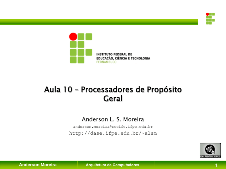Aula 10 – Processadores de Propósito Geral Anderson L. S. Moreira [email protected] http://dase.ifpe.edu.br/~alsm Anderson Moreira Arquitetura de Computadores 1 O que fazer com essa apresentação Anderson Moreira Arquitetura de Computadores 2 O que é um microprocessador? Máquina completa de computação embutida em um único chip Primeiro microprocessador foi o Intel 4004 (1971). O 4004 não era muito poderoso, já que ele só podia somar e subtrair 4 bits por vez. Mesmo assim, era incrível ver tudo isso em um único chip naquela época. Anderson Moreira Arquitetura de Computadores Introdução • Computadores do tipo IBM-PC são os mais populares e mais difundidos mundialmente; • São usados preferencialmente no estudo de arquitetura de computadores; • Intel 8086: – Lançado em 78 foi o primeiro a utilizar 16 bits de largura; Anderson Moreira Arquitetura de Computadores Microprocessador Primeiro microprocessador de um computador pessoal foi o Intel 8080; Era um computador de 8 bits completo dentro de um chip (1974); Primeiro microprocessador que se tornou realmente popular foi o Intel 8088 (1979) e incorporado em um PC IBM - que apareceu em 1982. Anderson Moreira Arquitetura de Computadores Arquiteturas Anderson Moreira Arquitetura de Computadores Arquiteturas Anderson Moreira Arquitetura de Computadores Arquiteturas - CISC Anderson Moreira Arquitetura de Computadores Arquiteturas - RISC Anderson Moreira Arquitetura de Computadores Arquiteturas - RISC Anderson Moreira Arquitetura de Computadores Arquitetura do Pentium Anderson Moreira Arquitetura de Computadores Arquitetura do Pentium Anderson Moreira Arquitetura de Computadores Registradores do 8086/8088 • Possuem 8 registradores de uso geral: – 4 de dados: AX, BX, CX, DX; – 4 registradores de endereços: SP, BP, SI, DI; • 4 registradores de segmentos: – CS, DS, SS, ES. • 1 apontador de instruções (IP); • 1 registrado de flags (F). Anderson Moreira Arquitetura de Computadores Registradores do 8086/8088 15 8 7 0 AX BX AH AL CX BH BL CH CL DH DL DX acumulador base contador dado SP BP ponteiro para pilha ponteiro base SI índice fonte DI índice destino apontador de instruções flags IP Flags CS DS segmento de código segmento de dados SS segmento de pilha ES segmento extra Anderson Moreira Arquitetura de Computadores Registradores de dados • Os quatro registradores de dados são denominados A, B, C, D: – A = acumulador – B = base – C = contador – D = dados • Quando usados como registradores de 16 bits acrescenta o “X” – Quando usados para 8 bits ganha o “H” (High) e o “L” (Low) para indicar o byte dentro da palavra; Anderson Moreira Arquitetura de Computadores Registradores de endereço • Acessam operandos da memória: – SP – ponteiro da pilha (stack pointer) – BP – ponteiro base (base pointer) – SI – índice de operando fonte (source index) – DI – índice de operando destino (destination index) • Registradores SP e BP são usados para operações na pilha Anderson Moreira Arquitetura de Computadores Registradores de segmentos • • • A memória do 8086 é dividida em unidades lógicas chamadas segmentos; Cada segmento tem 64 Kbytes de comprimento; – Processador acessa 4 segmentos de cada vez através de 4 registradores de segmentos; Os registradores armazenam os 16 bits mais significativos do endereço de 20 bits; – Endereço base é sempre múltiplo de 16; Anderson Moreira Arquitetura de Computadores Evolução dos microprocessadores - Intel Nome Data Transistores Mícron s Velocidade do clock Largura de dados MIPS 8080 1974 6.000 6 2 MHz 8 bits 0,64 8088 1979 29.000 3 5 MHz 16 bits 8-bit bus 0,33 80286 1982 134.000 1,5 6 MHz 16 bits 1 80386 1985 275.000 1,5 16 MHz 32 bits 5 80486 1989 1.200.000 1 25 MHz 32 bits 20 Pentium 1993 3.100.000 0,8 60 MHz 32 bits 64-bit bus 100 Pentium II 1997 7.500.000 0,35 233 MHz 32 bits 64-bit bus ~300 Pentium III 1999 9.500.000 0,25 450 MHz 32 bits 64-bit bus ~510 Pentium 4 2000 42.000.000 0,18 1,5 GHz 32 bits 64-bit bus ~1,700 Pentium 4 "Prescott" 2004 125.000.000 0,09 3,6 GHz 32 bits 64-bit bus ~7,000 Anderson Moreira Arquitetura de Computadores Dentro de um Microprocessador Para entender o funcionamento de um microprocessador, temos de entender a lógica utilizada para se criar um; Neste processo, vamos aprender um pouco de linguagem assembly (a língua nativa de um microprocessador). Anderson Moreira Arquitetura de Computadores Funcionamento Um microprocessador executa uma série de instruções de máquina que dizem a ele o que fazer. As três funções básicas de um processador são: Utilizando ULA, o microprocessador pode executar operações matemáticas como adição, subtração, multiplicação e divisão; Um microprocessador pode mover dados de um endereço de memória para outro; Pode tomar decisões e desviar para um outro conjunto de instruções baseado nestas decisões. Anderson Moreira Arquitetura de Computadores Diagrama de Funcionamento Anderson Moreira Arquitetura de Computadores Modos de endereçamento 8086 Modo Significado Imediato Operando na instrução Registrador Operando em registrador Direto Operando na memória, endereçado por deslocamento contido na instrução Registrador indireto Operando na memória, endereçado por deslocamento contido em registrador Indexado (ou base) Operando na memória, endereçado pela soma do registrador de índice (ou base) com o deslocamento contido na instrução Base e indexado com deslocamento Operando na memória, endereçado pela soma do registrador de índice com o conteúdo do registrador base e com o deslocamento contido na instrução. Anderson Moreira Arquitetura de Computadores Modos de endereçamento 8086 • • • • • O endereço final de um operando é formado pela soma do registrador de segmento (estendido para 20 bits) com o endereço efetivo fornecido pelo modo de endereçamento; Exemplo com instrução ADD (soma) → primeiro operando =