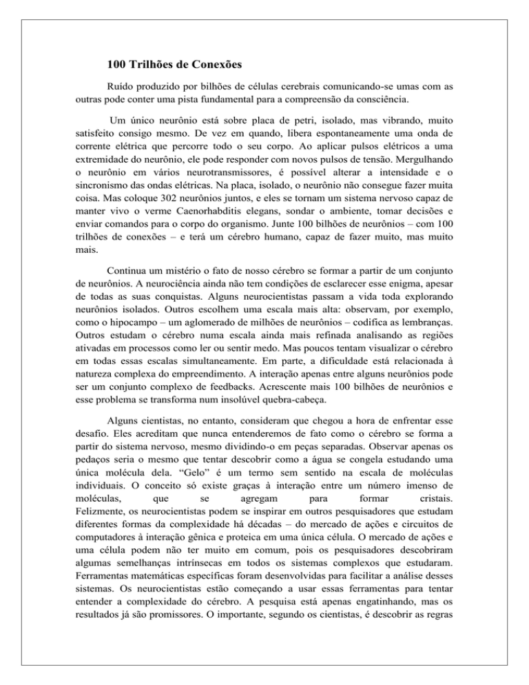 100 Trilhões de Conexões Ruído produzido por bilhões de células cerebrais comunicando-se umas com as outras pode conter uma pista fundamental para a compreensão da consciência. Um único neurônio está sobre placa de petri, isolado, mas vibrando, muito satisfeito consigo mesmo. De vez em quando, libera espontaneamente uma onda de corrente elétrica que percorre todo o seu corpo. Ao aplicar pulsos elétricos a uma extremidade do neurônio, ele pode responder com novos pulsos de tensão. Mergulhando o neurônio em vários neurotransmissores, é possível alterar a intensidade e o sincronismo das ondas elétricas. Na placa, isolado, o neurônio não consegue fazer muita coisa. Mas coloque 302 neurônios juntos, e eles se tornam um sistema nervoso capaz de manter vivo o verme Caenorhabditis elegans, sondar o ambiente, tomar decisões e enviar comandos para o corpo do organismo. Junte 100 bilhões de neurônios – com 100 trilhões de conexões – e terá um cérebro humano, capaz de fazer muito, mas muito mais. Continua um mistério o fato de nosso cérebro se formar a partir de um conjunto de neurônios. A neurociência ainda não tem condições de esclarecer esse enigma, apesar de todas as suas conquistas. Alguns neurocientistas passam a vida toda explorando neurônios isolados. Outros escolhem uma escala mais alta: observam, por exemplo, como o hipocampo – um aglomerado de milhões de neurônios – codifica as lembranças. Outros estudam o cérebro numa escala ainda mais refinada analisando as regiões ativadas em processos como ler ou sentir medo. Mas poucos tentam visualizar o cérebro em todas essas escalas simultaneamente. Em parte, a dificuldade está relacionada à natureza complexa do empreendimento. A interação apenas entre alguns neurônios pode ser um conjunto complexo de feedbacks. Acrescente mais 100 bilhões de neurônios e esse problema se transforma num insolúvel quebra-cabeça. Alguns cientistas, no entanto, consideram que chegou a hora de enfrentar esse desafio. Eles acreditam que nunca entenderemos de fato como o cérebro se forma a partir do sistema nervoso, mesmo dividindo-o em peças separadas. Observar apenas os pedaços seria o mesmo que tentar descobrir como a água se congela estudando uma única molécula dela. “Gelo” é um termo sem sentido na escala de moléculas individuais. O conceito só existe graças à interação entre um número imenso de moléculas, que se agregam para formar cristais. Felizmente, os neurocientistas podem se inspirar em outros pesquisadores que estudam diferentes formas da complexidade há décadas – do mercado de ações e circuitos de computadores à interação gênica e proteica em uma única célula. O mercado de ações e uma célula podem não ter muito em comum, pois os pesquisadores descobriram algumas semelhanças intrínsecas em todos os sistemas complexos que estudaram. Ferramentas matemáticas específicas foram desenvolvidas para facilitar a análise desses sistemas. Os neurocientistas estão começando a usar essas ferramentas para tentar entender a complexidade do cérebro. A pesquisa está apenas engatinhando, mas os resultados já são promissores. O importante, segundo os cientistas, é descobrir as regras que bilhões de neurônios obedecem para se organizar em redes, e como elas se unem numa única estrutura coerente que chamamos cérebro. Para eles, a organização dessa rede é fundamental para entendermos um mundo sempre em mudanças. Alguns transtornos mentais mais devastadores, como esquizofrenia e demência, podem resultar do colapso parcial de redes cerebrais. Os neurônios formam redes estendendo axônios, que fazem contato com outros neurônios. Quando isso ocorre, um sinal que se propaga por uma célula nervosa pode disparar uma onda de corrente em outros neurônios. Como cada célula pode se unir a milhares de outras – tanto as próximas, como as que se encontram do outro lado do cérebro – as redes neurais podem assumir um incrível número de arranjos. A forma como uma determinada rede se organiza tem enormes implicações no funcionamento do cérebro. CÉREBRO DE BRINQUEDO qual a melhor forma de estudar a rede de neurônios do cérebro? Que experimentos os cientistas podem fazer para rastrear bilhões de conexões em rede? Uma alternativa é construir um modelo do cérebro em miniatura, que mostre as diferentes formas de interação entre os neurônios. Olaf Sporns, da Indiana University, e seus colegas criaram exatamente esse modelo. Na simulação, juntaram 1. 600 neurônios e os distribuíram sobre uma superfície esférica, ligando depois cada neurônio aos demais. Em qualquer instante, todos os neurônios têm uma chance mínima de se ativar espontaneamente. Uma vez ativados, têm também uma pequena chance de acionar outros neurônios ligados a eles. Sporns e sua equipe soldaram as conexões entre os neurônios e observaram o cérebro de brinquedo em ação. Inicialmente conectaram cada neurônio apenas a seus vizinhos imediatos. Com a rede formada, o cérebro produzia pequenos lampejos aleatórios de atividade. Quando um neurônio se ativa espontaneamente, cria uma onda elétrica que desaparece rápido. Quando os pesquisadores ligaram cada neurônio aos demais, no cérebro, o padrão resultante foi bem diferente: o cérebro inteiro foi ativado e desativado em pulsos regulares. No fim, os cientistas acabaram atribuindo cérebro uma rede intermediária, criando conexões locais e de longa distância entre os neurônios. O cérebro havia se transformado, então, num sistema complexo. Quando os neurônios começaram a se ativar, surgiram grandes padrões brilhantes de atividade que se propagavam pelo cérebro. Alguns deles colidiam entre si e outros se propagavam pelo cérebro em círculos. O cérebro de brinquedo de Sporns ensinou uma lição importante sobre o aparecimento da complexidade. A própria arquitetura da rede molda seu padrão de atividade. Sporns e outros pe