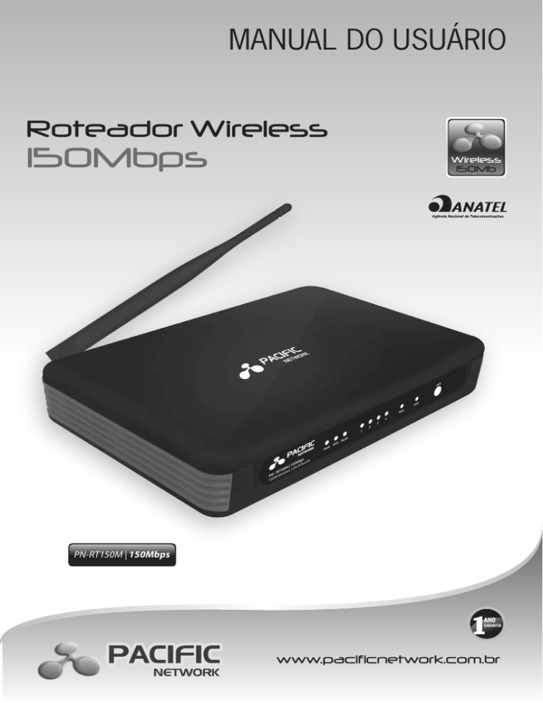 MANUAL DO USUÁRIO Roteador Wireless 150Mbps Wireless 150Mb PN-RT150M | 150Mbps 1 ANO GARANTIA www.pacificnetwork.com.br Caro consumidor, ficamos muito satisfeitos por você ter escolhido um produto da linha PACIFIC NETWORK. É para nós motivo de orgulho a sua preferência. Este aparelho é produzido com alta tecnologia procurando atender suas expectativas e aprimorar a qualidade nas comunicações. 2 Roteador Wireless 150Mbps Índice Conteúdo da embalagem........................................................................ 05 Capítulo 1 - Introdução............................................................................ 06 1.1 Visão geral do roteador............................................................................................ 06 1.2 Convenções.................................................................................................................. 07 1.3 Principais características.......................................................................................... 07 1.4 Layout do painel......................................................................................................... 08 Capítulo 2 - Conectando o roteador........................................................ 10 2.1 Requisitos de sistema............................................................................................... 10 2.2 Requisitos do ambiente de instalação................................................................ 10 2.3 Conectando o roteador............................................................................................ 11 Capítulo 3 - Guia de instalação rápida.................................................... 12 3.1 Configuração TCP/IP.................................................................................................. 12 3.2 Guia de instalação rápida........................................................................................ 14 Capítulo 4 - Configurando o roteador..................................................... 20 4.1 Login............................................................................................................................... 20 4.2 Status.............................................................................................................................. 21 4.3 Quick setup(instalação rápida )............................................................................ 23 4.4 WPS.................................................................................................................................. 23 4.5 Network (rede)............................................................................................................ 31 4.5.1 LAN............................................................................................................................... 31 4.5.2 WAN............................................................................................................................. 32 4.5.3 MAC Clone(clone MAC........................................................................................ 44 4.6 Wireless.......................................................................................................................... 45 4.6.1 Wireless Settings(configurações wireless...................................................... 45 4.6.2 Wireless Security(segurança wireless............................................................. 49 4.6.3 Wireless MAC filtering( filtro MAC wireless) ................................................ 53 4.6.4 Wireless Advanced(avançado........................................................................... 56 4.6.5 Wireless statistics (estatística wireless)............................................................ 58 4.7 DHCP............................................................................................................................... 59 4.7.1 DHCP settings (configurações DHCP)............................................................. 59 4.7.2 DHCP clients list (lista de clientes DHCP)....................................................... 61 4.7.3 Address reservation (reserva de endereço)................................................... 61 4.8 Forwarding(.encaminhamento)............................................................................ 63 4.8.1 Virtual Servers (servidores virtuais)..................................................................63 Roteador Wireless 150Mbps 3 4.8.2 Port Triggering (acionamento de porta)........................................................ 65 4.8.3 DMZ............................................................................................................................. 67 4.8.4 UPnP - Universal Plug and Play (conecte e use universal)....................... 68 4.9 Security (segurança).................................................................................................. 70 4.9.1 Basic security (segurança básica)...................................................................... 70 4.9.2 Advanced Security(segurança avançada)...................................................... 73 4.9.3 Local Management(gerenciamento local).................................................... 74 4.9.4 Remote Management(gerenciamento remoto).......................................... 76 4.10 Parental control (controle dos pais).................................................................. 77 4.11 Access Control(controle de acesso).................................................................. 80 4.11.1 Rule(regra).............................................................................................................. 80 4.11.2 Host (anfitrião)....................................................................................................... 84 4.11.3 Target (alvo)............................................................................................................ 86 4.11.4 Schedule (pr