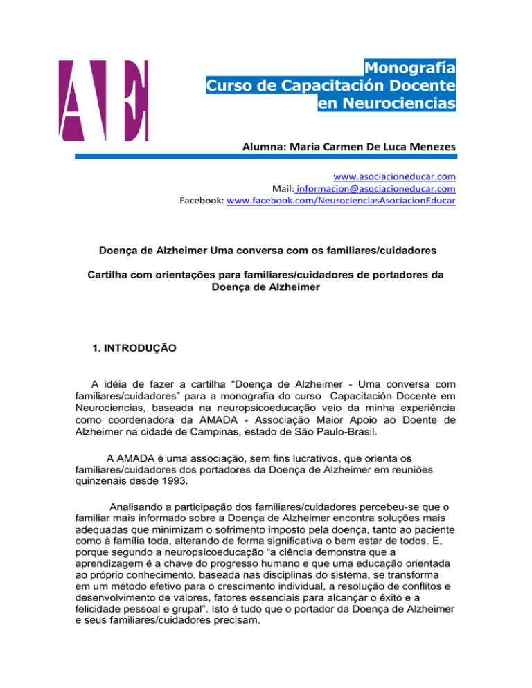 Monografía Curso de Capacitación Docente en Neurociencias Alumna: Maria Carmen De Luca Menezes www.asociacioneducar.com Mail: [email protected] Facebook: www.facebook.com/NeurocienciasAsociacionEducar Doença de Alzheimer Uma conversa com os familiares/cuidadores Cartilha com orientações para familiares/cuidadores de portadores da Doença de Alzheimer 1. INTRODUÇÃO A idéia de fazer a cartilha “Doença de Alzheimer - Uma conversa com familiares/cuidadores” para a monografia do curso Capacitación Docente em Neurociencias, baseada na neuropsicoeducação veio da minha experiência como coordenadora da AMADA - Associação Maior Apoio ao Doente de Alzheimer na cidade de Campinas, estado de São Paulo-Brasil. A AMADA é uma associação, sem fins lucrativos, que orienta os familiares/cuidadores dos portadores da Doença de Alzheimer em reuniões quinzenais desde 1993. Analisando a participação dos familiares/cuidadores percebeu-se que o familiar mais informado sobre a Doença de Alzheimer encontra soluções mais adequadas que minimizam o sofrimento imposto pela doença, tanto ao paciente como à família toda, alterando de forma significativa o bem estar de todos. E, porque segundo a neuropsicoeducação “a ciência demonstra que a aprendizagem é a chave do progresso humano e que uma educação orientada ao próprio conhecimento, baseada nas disciplinas do sistema, se transforma em um método efetivo para o crescimento individual, a resolução de conflitos e desenvolvimento de valores, fatores essenciais para alcançar o êxito e a felicidade pessoal e grupal”. Isto é tudo que o portador da Doença de Alzheimer e seus familiares/cuidadores precisam. 2. JUSTIFICATIVA A Doença de Alzheimer (DA) é a forma mais comum de demência, com repercussões individuais, familiares e sociais. Afeta milhões de pessoas no mundo todo e é esperado que este número cresça. As estimativas indicam que nos Estados Unidos existam 5,1 milhões de portadores de DA, no Brasil 1,2 milhão e no mundo 35,6 milhões. (ADI Associação Internacional da Doença de Alzheimer). É uma doença neurológica, evolutiva que apesar do avanço das pesquisas ainda não se sabe a causa e nem cura. Mas tem tratamento. 2.1 Por que aprender sobre o cérebro e sobre a Doença de Alzheimer? O objetivo desta cartilha é oferecer ao familiar e ao cuidador de portadores da Doença de Alzheimer(DA) informações sobre a doença, dar algumas orientações gerais e exercícios domiciliares e alguns cuidados. São de grande importância para facilitar as atividades de vida diária melhorando a qualidade de vida do paciente e do cuidador que se torna mais apto, cuidando bem do doente, de si e não se deixando dominar pelos sentimentos negativos que esta nova missão pode acarretar. A Doença de Alzheimer afeta a família inteira que sofre uma grande tensão emocional devido às mudanças de comportamento e ações imprevisíveis de seu parente. Aprender mais sobre a doença é importante para você poder reconhecer os sintomas e ajudar seu ente querido. Para entender sobre a Doença de Alzheimer é preciso conhecer um pouco o nosso cérebro. Aprender sobre o cérebro nos permite reflexionar e aprender a ser responsável pelo nosso bem estar e o de outras pessoas. Não tenho pretensão de resolver todos os problemas, é só uma cartilha, é só o “beaba” sobre a importância da Doença de Alzheimer. 3. A CARTILHA 3.1 NOSSO CÉREBRO No cérebro estão os centros de comando que coordenam tudo o que acontece no corpo humano. Sendo assim consideramos que corpo, cérebro e mente formam uma unidade: UCCM – Unidade Corpo Cérebro Mente. O cérebro é formado por pequenas ferramentas destinadas a resolver diferentes problemas de sobrevivência. É o mesmo há 150 mil anos sempre preparado a enfrentar os desafios do dia a dia, em todos os tempos e em todos os ambientes, chamamos esta interação de UCCMMA - Unidade Corpo Cérebro Mente e Meio Ambiente. O cérebro humano é composto de aproximadamente 100 bilhões de células neurais individuais , interconectadas em sistemas que se comunicam por meio de 10 trilhões de pontos de contato que produzem nossa percepção do mundo através da visão, audição, olfação, gustação, tato. Controlam não só andar, falar, enxergar, escutar, sentir e comer, mas a todas as complexas ações mentais como atenção; memória; emoções; sensações; sentimentos; imagens mentais; pensamentos automáticos; pensamentos voluntários; idéias criativas; planos futuros; sonhos; imaginação; rotinas; cáculos matemáticos; desejos; autoconciência; cálculos mentais; motivação e tomada de consciência. Isso acontece porque o sistema nervoso é um todo único, indivisível, dividido em partes só para fins didáticos e científicos. 3.2 NEURÔNIOS O tecido nervoso é constituído por células nervosas - neurônios - e pela neuroglia, que é formado pela glia, elemento de sustentação física dos neurônios e também metabólico, conjunto este que participa ativamente das funções do encéfalo. O neurônio é a unidade funcional e www.infoescola.com/wp-content/uploads/2009/08/esqemaNeuro.gif estrutural do sistema nervoso. O neurônio é formado pelo corpo celular (soma), dendritos, que recebem as informações, e axônios que veiculam os sinais de saída. No cérebro adulto existem 100 bilhões de neurônios (dos quais existem vários tipos diferentes) conectados formando mais de 100 trilhões de sinápses. É uma unidade completamente envolvida pela bainha de mielina, uma membrana que separa o compartimento intracelular do extracelular para facilitar a geração e a condução dos sinais bioelétricos. A mielinização ocorre durante a última parte do desenvolvimento fetal e durante o primeiro ano pós-natal. Neurônios são destruídos na Doença de Alzheimer. 3.3 SINAPSES Trata-se de um ponto de contato que permite a passagem de impulsos elétricos ou químicos, numa única direção