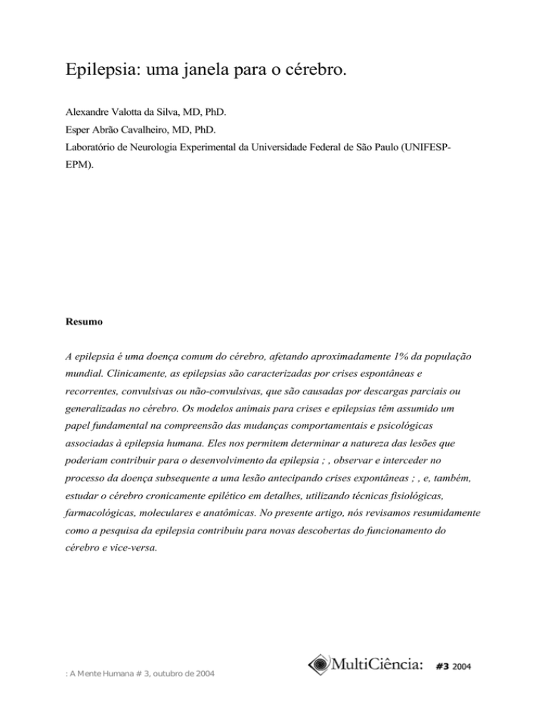 Epilepsia: uma janela para o cérebro. Alexandre Valotta da Silva, MD, PhD. Esper Abrão Cavalheiro, MD, PhD. Laboratório de Neurologia Experimental da Universidade Federal de São Paulo (UNIFESPEPM). Resumo A epilepsia é uma doença comum do cérebro, afetando aproximadamente 1% da população mundial. Clinicamente, as epilepsias são caracterizadas por crises espontâneas e recorrentes, convulsivas ou não-convulsivas, que são causadas por descargas parciais ou generalizadas no cérebro. Os modelos animais para crises e epilepsias têm assumido um papel fundamental na compreensão das mudanças comportamentais e psicológicas associadas à epilepsia humana. Eles nos permitem determinar a natureza das lesões que poderiam contribuir para o desenvolvimento da epilepsia ; , observar e interceder no processo da doença subsequente a uma lesão antecipando crises expontâneas ; , e, também, estudar o cérebro cronicamente epilético em detalhes, utilizando técnicas fisiológicas, farmacológicas, moleculares e anatômicas. No presente artigo, nós revisamos resumidamente como a pesquisa da epilepsia contribuiu para novas descobertas do funcionamento do cérebro e vice-versa. : A Mente Humana # 3, outubro de 2004 Epilepsia: uma janela para o cérebro. “Mestre, eu te trouxe o meu filho, que está com um espírito que o impede de falar. Onde quer que o apanhe, joga-o no chão. Ele espuma pela boca, range os dentes e fica rígido...”. Todos sabemos o que está acontecendo com esse garoto. O que alguns talvez não saibam é que esse relato tem mais de dois mil anos (1). Naquela época, as idéias relacionadas às doenças geralmente vinculavam-se a fenômenos sobrenaturais, magia ou maldições. Hoje sabemos que aproximadamente 1% da população mundial (60 milhões de pessoas) é acometida por crises epilépticas recorrentes, resultantes de uma hiperatividade dos neurônios e circuitos cerebrais (2) (3) (4). A essa síndrome chamamos “epilepsia”, que na língua original significa “ser apanhado de surpresa”. As descrições mais remotas de epilepsia são atribuídas aos egípcios e sumérios, datando de aproximadamente 3.500 a.C. O principal documento que trata de neurologia no Egito Antigo, o Papiro de Smith, relata crises convulsivas nos trechos que descrevem indivíduos com ferimentos na cabeça, por volta de 1.700 a.C. Na Suméria (Mesopotâmia), nessa mesma época, vários textos em acadiano registram claramente o que hoje chamamos de crises epilépticas. Manuscritos mais recentes, como os textos bíblicos do primeiro século, também citam a ocorrência de manifestações muito semelhantes a crises convulsivas, geralmente associadas à possessão demoníaca. Por volta de 400 a.C., Hipócrates, o chamado “Pai da Medicina”, afirmou que a causa da epilepsia não estava em espíritos malignos, mas sim no cérebro, tentando desfazer mitos sobrenaturais. Os escritos da época foram os primeiros a atribuir causas físicas para as doenças neurológicas, identificando o cérebro como local-chave para o entendimento do comportamento humano. Desde então, esse novo olhar sobre o sistema nervoso tem impulsionado as pesquisas na área da neurologia. Médicos, anatomistas, escultores, pintores, filósofos, teólogos, físicos e uma infinidade de pesquisadores tem sido seduzidos pelo estudo da “sede da alma” (5). : A Mente Humana # 3, outubro de 2004 Conhecendo o cérebro quebrado Muito do que sabemos hoje sobre o funcionamento do sistema nervoso é fruto da observação de indivíduos acometidos por doenças neurológicas. Assim, inferimos que o cerebelo participa da coordenação dos movimentos voluntários ao observar que indivíduos com lesões cerebelares tornam-se incapazes de executar movimentos adequadamente. Nesse sentido, o estudo da epilepsia oferece uma oportunidade ímpar para aprofundar o conhecimento a respeito do cérebro humano. Bastaria dizer que a epilepsia é a doença neurológica mais comum, mas isso não é tudo. O termo “epilepsia” encerra uma grande variedade de manifestações clínicas, desde as chamadas auras psíquicas até as crises tônicoclônicas generalizadas, incluindo as epilepsias da infância, as epilepsias secundárias a outras doenças, as epilepsias de origem familiar e muitas outras (6) (7). Poderíamos dizer que os tipos de epilepsia são tão variados quanto as próprias funções cerebrais. Assim, o conhecimento da epilepsia se mistura ao conhecimento do próprio cérebro. Em pacientes com epilepsia, as causas das descargas epilépticas são muito variadas. Elas podem ocorrer em virtude de uma simples tendência a crises, determinada por fatores genéticos, ou em função de lesões bem definidas do sistema nervoso. Aproximadamente 70% dos pacientes com epilepsia controlam as crises usando os fármacos disponíveis. Mas uma porcentagem significativa (de 30% a 40%), em que predominam indivíduos com lesões focais, não consegue controlá-las com medicamentos. Nesses casos, o tratamento cirúrgico pode, após análise cuidadosa, ser uma alternativa eficaz. Atualmente, a avaliação desses pacientes inclui uma gama de exames bastante sofisticados como a ressonância magnética estrutural e funcional, a tomografia por emissão de pósitrons (Positron Emission Tomography - PET) e a tomografia por emissão de fóton único (Single Photon Emission Computed Tomography - SPECT). Esses exames nos permitem visualizar mudanças sutis na estrutura do tecido nervoso e no modo como as diferentes regiões cerebrais estão funcionando (2) (3) (4). Além dos estudos envolvendo pacientes com epilepsia, existe uma variedade de modelos em animais que têm contribuído sobremaneira para o conhecimento detalhado dos fenômenos envolvidos na origem e na manifestação das crises epilépticas. : A Mente Humana # 3, outubro de 2004 Crises provocadas As preparações experimentais mais antigas não reproduziam de forma fidedigna a fenomenologia encontrada 