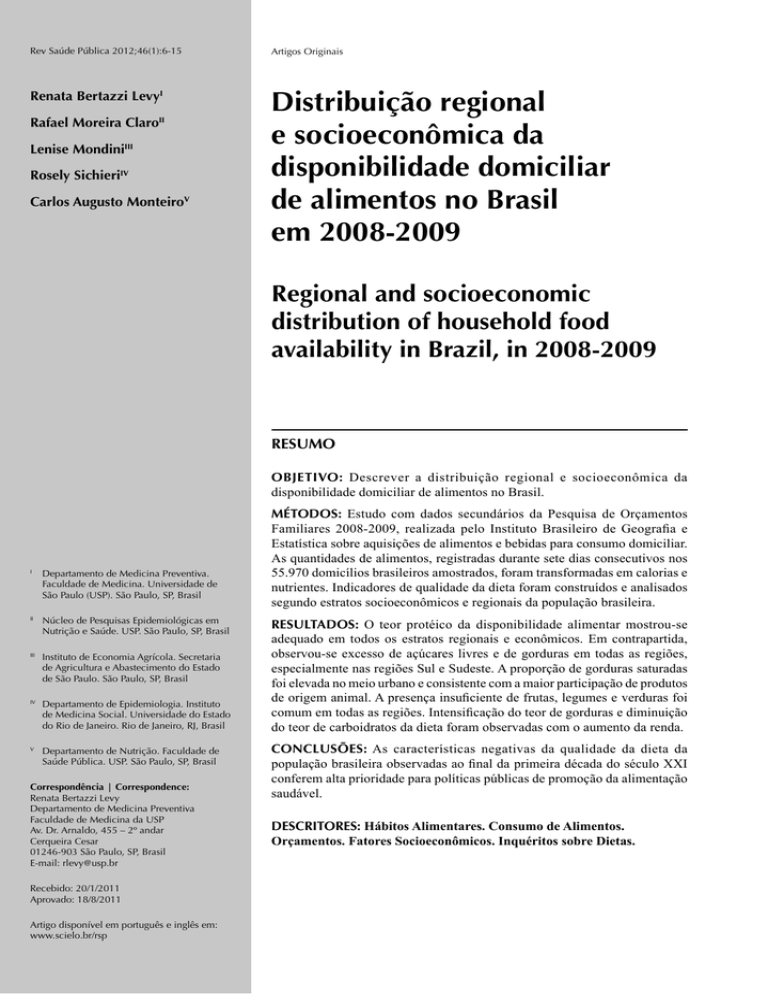 Rev Saúde Pública 2012;46(1):6-15 Artigos Originais Renata Bertazzi LevyI Distribuição regional e socioeconômica da disponibilidade domiciliar de alimentos no Brasil em 2008-2009 Rafael Moreira ClaroII Lenise MondiniIII Rosely SichieriIV Carlos Augusto MonteiroV Regional and socioeconomic distribution of household food availability in Brazil, in 2008-2009 RESUMO OBJETIVO: Descrever a distribuição regional e socioeconômica da disponibilidade domiciliar de alimentos no Brasil. I Departamento de Medicina Preventiva. Faculdade de Medicina. Universidade de São Paulo (USP). São Paulo, SP, Brasil II Núcleo de Pesquisas Epidemiológicas em Nutrição e Saúde. USP. São Paulo, SP, Brasil III Instituto de Economia Agrícola. Secretaria de Agricultura e Abastecimento do Estado de São Paulo. São Paulo, SP, Brasil IV Departamento de Epidemiologia. Instituto de Medicina Social. Universidade do Estado do Rio de Janeiro. Rio de Janeiro, RJ, Brasil V Departamento de Nutrição. Faculdade de Saúde Pública. USP. São Paulo, SP, Brasil Correspondência | Correspondence: Renata Bertazzi Levy Departamento de Medicina Preventiva Faculdade de Medicina da USP Av. Dr. Arnaldo, 455 – 2º andar Cerqueira Cesar 01246-903 São Paulo, SP, Brasil E-mail: [email protected] Recebido: 20/1/2011 Aprovado: 18/8/2011 Artigo disponível em português e inglês em: www.scielo.br/rsp MÉTODOS: Estudo com dados secundários da Pesquisa de Orçamentos Familiares 2008-2009, realizada pelo Instituto Brasileiro de Geografia e Estatística sobre aquisições de alimentos e bebidas para consumo domiciliar. As quantidades de alimentos, registradas durante sete dias consecutivos nos 55.970 domicílios brasileiros amostrados, foram transformadas em calorias e nutrientes. Indicadores de qualidade da dieta foram construídos e analisados segundo estratos socioeconômicos e regionais da população brasileira. RESULTADOS: O teor protéico da disponibilidade alimentar mostrou-se adequado em todos os estratos regionais e econômicos. Em contrapartida, observou-se excesso de açúcares livres e de gorduras em todas as regiões, especialmente nas regiões Sul e Sudeste. A proporção de gorduras saturadas foi elevada no meio urbano e consistente com a maior participação de produtos de origem animal. A presença insuficiente de frutas, legumes e verduras foi comum em todas as regiões. Intensificação do teor de gorduras e diminuição do teor de carboidratos da dieta foram observadas com o aumento da renda. CONCLUSÕES: As características negativas da qualidade da dieta da população brasileira observadas ao final da primeira década do século XXI conferem alta prioridade para políticas públicas de promoção da alimentação saudável. DESCRITORES: Hábitos Alimentares. Consumo de Alimentos. Orçamentos. Fatores Socioeconômicos. Inquéritos sobre Dietas. 7 Rev Saúde Pública 2012;46(1):6-15 ABSTRACT OBJECTIVE: To describe the regional and socioeconomic distribution of household food availability in Brazil. METHODS: Data from the 2008-2009 Household Budget Survey on food and beverage acquisition for household consumption, conducted by the Instituto Brasileiro de Geografia e Estatística (Brazilian Institute of Geography and Statistics), were analyzed. The amounts of foods, recorded during seven consecutive days in the 55,970 sample households, were converted into calories and nutrients. Food quality indicators were constructed and analyzed according to the regional and socioeconomic strata of the Brazilian population. RESULTS: The amount of energy from protein was adequate in all regional and socioeconomic strata. On the other hand, an excess of free sugars and fats was observed in all regions of the country, especially in the Southern and Southeastern regions. The proportion of saturated fats was high in urban areas and consistent with the greater contribution of animal-derived products. Limited availability of fruits and vegetables was found in all regions. An increase in the fat content and reduction in carbohydrate content of the diet were observed with the increase in income. CONCLUSIONS: The negative characteristics of the Brazilian diet observed at the end of the first decade of the 21st century indicate the need to prioritize public policies for the promotion of healthy eating. DESCRIPTORS: Food Habits. Food Consumption. Budgets. Socioeconomic Factors. Diet Surveys. INTRODUÇÃO Condições favoráveis à ocorrência de desnutrição e doenças infecciosas têm sido gradativamente substituídas por um cenário propício à epidemia de obesidade e outras doenças crônicas não transmissíveis relacionadas ao consumo excessivo e/ou desbalanceado de alimentos.13 A análise da evolução do estado nutricional da população adulta brasileira mostrou que, enquanto a prevalência de baixo peso declinou, as prevalências de excesso de peso e de obesidade aumentaram continuamente nas últimas décadas.a A estratégia global da Organização Mundial da Saúde (OMS) para Alimentação, Atividade Física e Saúde ressalta a necessidade de adequação dos padrões mundiais de alimentação, um dos responsáveis diretos pelo crescimento da carga global de obesidade e doenças crônicas não transmissíveis. A OMS enfatiza a necessidade de redução do consumo de alimentos com alto teor de energia e baixo teor de nutrientes e com alto teor de sódio, gorduras saturadas, gorduras trans e carboidratos refinados.b a A descrição dos padrões dietéticos de uma população deve ser feita preferencialmente por investigação direta do consumo alimentar individual. Recentemente, o Instituto Brasileiro de Geografia e Estatística (IBGE) introduziu um módulo específico que investiga o consumo alimentar individual em uma subamostra do total de domicílios nas Pesquisas de Orçamentos Familiares (POF). Inquéritos regulares com dados sobre disponibilidade domiciliar de alimentos, originários das POF, possibilitam a caracteriza