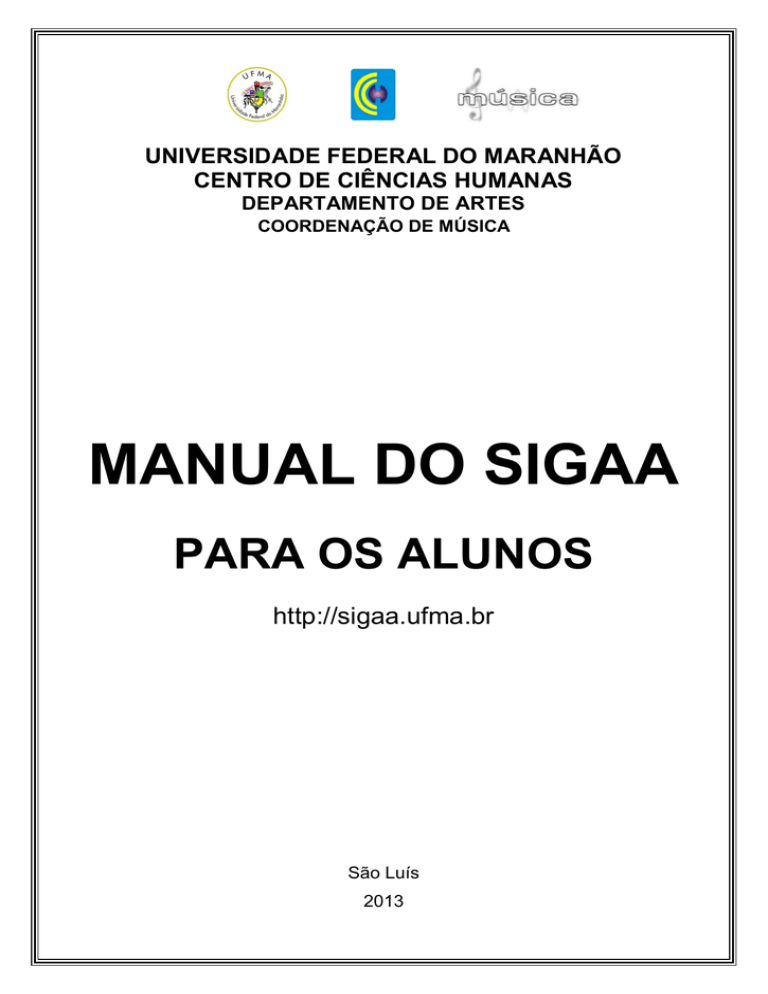 UNIVERSIDADE FEDERAL DO MARANHÃO CENTRO DE CIÊNCIAS HUMANAS DEPARTAMENTO DE ARTES COORDENAÇÃO DE MÚSICA MANUAL DO SIGAA PARA OS ALUNOS http://sigaa.ufma.br São Luís 2013 SUMÁRIO SOBRE O MANUAL ...................................................................................................... 3 1. Conheça a tela principal do SIGAA ............................................................................. 3 2. Matrícula on-line (Inscrição em disciplinas) .................................................................... 4 3. Matrícula on-line em disciplina de férias ...................................................................... 6 4. Atestado de Matrícula (Confirmação de Matrícula) ......................................................... 7 5. Consultar Histórico ...................................................................................................... 8 6. Trancamento de Componente Curricular (Cancelar Disciplina) ..................................... 9 7. Declaração de Vínculo (Solicitar Declaração) ................................................................ 9 8. Abono de faltas.......................................................................................................... 10 9. Pedir revisão de nota em avaliação ........................................................................... 10 10. Solicitar Prova de Reposição................................................................................... 11 11. Inserção de Disciplina cursada em período anterior ................................................ 12 12. Correção de Nota em Disciplina cursada em período anterior ................................ 12 13. Trancamento de Programa (Trancar o Curso) ........................................................... 12 2 SOBRE O MANUAL O novo sistema adotado na UFMA – o SIGAA – permite que você possa resolver grande parte das questões via internet, em casa, em laboratórios da UFMA ou até em uma lan house. Isto agiliza muito seu trabalho, pois você poderá fazer a maioria das operações até mesmo durante uma viagem. Logo, a Coordenação irá focar somente em problemas que não podem ser resolvidos pelo sistema. Este é o objetivo deste manual: simples e direto, mostrando os termos do sistema e aqueles que usamos no dia-a-dia. Vamos criar a cultura de acompanhar nosso curso pela internet! 1. Conheça a tela principal do SIGAA Primeiramente, é necessário conhecer as principais telas do SIGAA. Entre no endereço http://sigaa.ufma.br. Em seguida, aparecerá a seguinte tela: Você deve sempre entrar no SIGAA (Acadêmico), que já vem selecionado. Assim, digite seu Usuário e Senha nos campos. Caso ainda não possua uma senha, cadastre-se clicando no item abaixo à direita. Após o acesso, você entrará na tela principal do SIGAA, semelhante à que se segue: 3 No centro da tela, você verá os componentes curriculares (disciplinas, estágio e outras atividades) em que está matriculado no momento. À direita, temos o calendário acadêmico, com datas importantes de determinadas atividades. Acima, na barra de menus, você tem o item Ensino, onde são feitas todas as operações descritas a seguir. 2. Matrícula on-line (Matrícula em Disciplinas) A primeira atividade importante, que se inicia antes do semestre letivo, é a matrícula em disciplinas. Em primeiro lugar, tente seguir a sequência aconselhada na matriz curricular do curso, para não deixar de fazer disciplinas importantes e assim atrasar sua formatura. Lembre-se também que há uma data limite para fazer este pedido (observe à direita, no Calendário Acadêmico). Abaixo, segue o procedimento para matrícula em disciplinas: 2.1 Entre no SIGAA a partir do endereço http://sigaa.ufma.br; 2.2 Pela barra de menus, acesse Ensino → Matrícula on-line → Realizar Matrícula: 2.3 Em seguida, você verá uma mensagem semelhante à que segue: 2.4 Ao clicar Iniciar Seleção de Turmas, você verá a tela principal de matrícula: 4 É fundamental saber as funções de cada botão presente nesta tela, explicados abaixo: Este botão exibe todas as turmas abertas do seu curso, onde você pode ver dados sobre cada componente e turma; Clicando aqui, você verá componentes que equivalem às disciplinas que você precisa para formar; Este botão permite pesquisar turmas abertas de outros cursos, sendo útil para inscrição em disciplinas isoladas. 2.5 Selecione os componentes que você deseja cursar, marcando os quadrinhos ( ). Lembre-se que componentes com pré-requisitos não serão liberados pelo SIGAA (ficarão em vermelho). Após concluir a marcação, clique em Adicionar Turmas. Aparecerá uma tela semelhante à que segue: 5 Você verá no quadro à direita como ficará seu horário no período. Caso queira excluir um componente, clique em sua respectiva “Lixeira”. Se quiser voltar para escolher outras disciplinas, clique em Ver as turmas da Estr. Curricular. Para concluir a matrícula, clique em Confirmar Matrícula. 2.6 Ao confirmar a matrícula, você verá a tela com o número de Solicitação de Matrícula: Lembre-se de guardar este número, pois ele é a única prova de que você efetuou sua matrícula. Se puder, imprima o comprovante, clicando em Imprimir Comprovante. 3. Matrícula on-line em disciplina de férias As telas das matrículas em disciplina de férias são um pouco diferentes. Para realizá-la, faça o seguinte: 3.1 Entre no SIGAA a partir do endereço http://sigaa.ufma.br; 3.2 Acesse, pelo menu, Ensino → Matrícula on-line → Realizar Matrícula em turma de férias. Aparecerá uma tela semelhante à que segue: 6 3.3 Clique na seta verde correspondente à disciplina que você deseja cursar. Em seguida, aparecerá uma tela solicitando informações suas e a senha para confirmar a inscrição: Por último, clique em Confirmar Matrícula. 4. Atestado de Matrícula (Confirmação de Matrícula) Ao fim do período de matrícula, voc