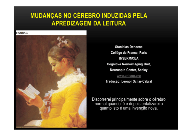MUDANÇAS NO CÉREBRO INDUZIDAS PELA APREDIZAGEM DA LEITURA Stanislas Dehaene Collège de France, Paris INSERM/CEA Cognitive Neuroimaging Unit, Neurospin Center, Saclay www.unicog.org Tradução: Leonor Scliar-Cabral Discorrerei principalmente sobre o cérebro normal quando lê e depois enfatizarei o quanto isto é uma invenção nova. PRIMEIRAS FORMAS DE ARTE Há cerca de 32.000 anos, os homens adentraram a gruta de Chauvet, ao sul da França e realizaram belos desenhos de cavalos, tigres e leões, mas também formas simbólicas, tais como mãos. Um pouco mais tarde, em Lascaux, pela primeira vez, podem ser observados símbolos, tais como a cruz. EMERGÊNCIA DA ESCRITA SIMBÓLICA FIGURA 3 Há cerca de 5.400 anos, a escrita foi inventada Rapidamente, assumiu formas variadas Ao escrever em hieróglifos, os homens inventaram seus próprios sistemas de escrita. Isso foi uma invenção radical, completa, não antecipada por nada em nossa evolução A chave para entender o sistema de leitura, de escrita ou de aritmética • É entender que o cérebro não passou por evolução específica para dar suporte a esses sistemas que são invenções humanas FIGURA 4 Duas hipóteses simples sobre como o desenvolvimento do cérebro sustenta a educação e a aprendizagem cognitiva ° Ideia 1. Nosso cérebro é altamente estruturado desde o nascimento, para adquirir rapidamente representações sofisticadas, herdadas com a evolução: desenvolvemos os conceitos de objetos, espaço, tempo, número, estruturas linguísticas, relações sociais... Mas, é claro, nenhuma evolução específica para a leitura, para a escrita, para a aritmética... ° Ideia 2. “Reciclamos” alguns desses sistemas cerebrais para novos usos culturais - Qualquer objeto cultural novo precisa encontrar seu “nicho cerebral”, modificando circuitos cerebrais pré-existentes, explorando a margem de variabilidade tornada possível pela plasticidade cerebral - Ganhamos novas competências, mas também podemos perder algumas das antigas, legadas pela evolução A neuroimagem da leitura completa agora quase 20 anos Com instrumentos como a IRMf (Imagem por Ressonância Magnética funcional) podemos em poucos minutos ver o cérebro de um leitor aprendendo a ler e observar o que a leitura envolve Existe uma área específica do cérebro – um sistema da forma da palavra visual, envolvida no reconhecimento da ortografia – que é somente um subconjunto dentro de um circuito maior É muito surpreendente que essa área seja localizada em relação a outros domínios do cérebro, tais como os que suportam as respostas a faces, a casas, ou a objetos É um completo mistério como o cérebro pode ter um sistema localizado como esse, uma vez que não evoluiu para a leitura Realmente, não entendemos esse mistério, mas podemos confirmar essas áreas localizadas com dados convergentes de lesões. Embaixo: a ativação quando o sujeito está lendo Acima: as lesões encontradas em vários pacientes que desenvolveram alexia total, após traumatismo cerebral (consequência de um acidente) ▼ envolvem a mesma seção da forma da palavra visual que é ativada quando um sujeito normal lê ENTÃO, COMO PODEMOS RESUMIR ESSES DADOS? Visão geral proposta: Uma palavra começa a ser processada no cérebro como um objeto visual, primeiro codificado na parte posterior do cérebro, nas áreas visuais genéricas, envolvidas no reconhecimento das faces e dos objetos, bem como das palavras escritas FIGURA 7 – ARQUITETURA CEREBRAL PARA A LEITURA Mas aprender a ler consiste numa especialização numa outra área, um pouco mais adiante, no giro fusiforme ↓ que é a área da forma da palavra visual ↓↓↓ a qual se tornou afinada com as formas das letras e com as cadeias de letras que constituem as palavras num dado sistema ortográfico A informação a partir da área da forma da palavra visual ↓↓↓ navega para outras áreas que são envolvidas com a pronúncia e a articulação, bem como com o acesso ao significado das palavras Todas essas áreas exibidas no quadro são áreas cerebrais conhecidas por serem ativadas, fato atestado por todos os diferentes métodos de imagem Contudo, no momento, ainda não são conhecidos completamente todos os caminhos da ativação Certeza: todas as áreas numeradas na Figura 7 podem ser ativadas pela língua falada e já estão posicionadas na criança antes de aprender a ler Podemos acompanhá-las sendo ativadas em muitos casos, mesmo numa criança de apenas poucos meses O que é especializado para a leitura é a área número 2, como uma interface entre o sistema visual e o sistema existente para a linguagem verbal Aprender a ler consiste em criar uma ponte entre a visão (a representação visual das palavras escritas) e a linguagem verbal (que correspondente aos sons e ao significado das palavras) Figura 8 Os neurônios ínfero-temporais reconhecem objetos e faces através de uma “pirâmide neuronal” de traços aninhados. Modelo de reconhecimento de face ou objeto Modelo de reconhecimento da palavra Tamanho e estrutura escrita dos campos receptivos Amostragem dos estímulos preferidos Modelo de reciclagem Começa com um cérebro um pouco semelhante ao cérebro do macaco que vemos na Figura 8, já organizado para reconhecer objetos e, em particular, para reconhecer faces Esse modelo de reconhecimento da face foi desenvolvido por Shimon Ullman e é um modelo acurado de como o sistema visual trabalha Reconhecemos faces porque temos uma hierarquia de neurônios capazes de reconhecer partes das faces, tais como a região dos olhos, ou um pedaço do olho Cada um desses neurônios, por sua vez, conta com uma pirâmide de neurônios precedentes, ao longo do caminho em direção ao córtex visual primário, que codifica os segmentos da imagem visual Em uma arquitetura muito similar subjaz o reconhecimento da palavra Reciclamos a arquitetura para as faces em algo semelhante para lidar com as palavra O que temos é 