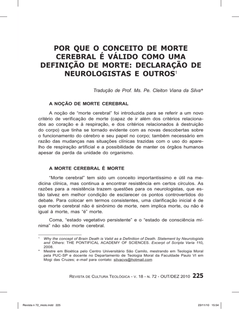 Por que o conceito de morte cerebral é válido como uma definição de morte: declaração de neurologistas e outros1 Tradução de Prof. Ms. Pe. Cleiton Viana da Silva* A noção de morte cerebral A noção de “morte cerebral” foi introduzida para se referir a um novo critério de verificação de morte (capaz de ir além dos critérios relacionados ao coração e à respiração, e dos critérios relacionados à destruição do corpo) que tinha se tornado evidente com as novas descobertas sobre o funcionamento do cérebro e seu papel no corpo; também necessário em razão das mudanças nas situações clínicas trazidas com o uso do aparelho de respiração artificial e a possibilidade de manter os órgãos humanos apesar da perda da unidade do organismo. A morte cerebral é morte “Morte cerebral” tem sido um conceito importantíssimo e útil na medicina clínica, mas continua a encontrar resistência em certos círculos. As razões para a resistência trazem questões para os neurologistas, que estão talvez em melhor condição de esclarecer os pontos controvertidos do debate. Para colocar em termos consistentes, uma clarificação inicial é de que morte cerebral não é sinônimo de morte, nem implica morte, ou não é igual à morte, mas “é” morte. Coma, “estado vegetativo persistente” e o “estado de consciência mínima” não são morte cerebral. Why the concept of Brain Death is Valid as a Definition of Death. Statement by Neurologists and Others: THE PONTIFICAL ACADEMY OF SCIENCES. Excerpt of Scripta Varia 110, 2008. * Mestre em Bioética pelo Centro Universitário São Camilo, mestrando em Teologia Moral pela PUC-SP e docente no Departamento de Teologia Moral da Faculdade Paulo VI em Mogi das Cruzes; e-mail para contato: [email protected] 1 Revista de Cultura Teológica - v. 18 - n. 72 - OUT/DEZ 2010 Revista n 72_miolo.indd 225 225 23/11/10 15:54 Por que o conceito de morte cerebral é válido como uma definição de morte A inclusão do termo “morte” na morte cerebral pode constituir um problema central, mas a comunidade de neurologistas (com poucas exceções) reconhece que alguma coisa essencial distingue a morte cerebral de todos os outros tipos de disfunções cerebrais severas que trazem alterações de consciência (por exemplo, coma, estado vegetativo, estado de consciência mínima). Se os critérios para morte cerebral não são satisfeitos, a barreira entre vida e morte não é atravessada, não importa quão severo ou irreversível seja a lesão no cérebro. Morte cerebral é a morte do indivíduo O conceito de morte cerebral não quer promover a ideia de que haja mais de uma forma de morte. Mais do que isto, esta terminologia específica se relaciona com um estado particular, com uma sequência de fatos, que constitui a morte de um indivíduo. Por isso, morte cerebral significa a cessação irreversível de toda atividade vital do cérebro (dos hemisférios e do tronco cerebral). Isso envolve uma perda irreversível da função das células do cérebro e sua total, ou quase total, destruição. O cérebro está morto e o funcionamento dos outros órgãos é mantido direta e indiretamente por meios artificiais. Este estado resulta somente e especificamente do uso das modernas técnicas médicas e, com somente pouca exceções, pode ser mantido por um tempo limitado. A tecnologia pode preservar os órgãos de uma pessoa morta (alguém apropriadamente considerado morto por critérios neurológicos) por certo tempo, usualmente algumas horas ou dias, raramente mais que isso. No entanto, aquele indivíduo está morto. A morte é o fim de um processo O processo começa com um fato irreversível de saúde, a saber, o começo da falência das funções integradoras exercidas pelo cérebro e pelo tronco cerebral. Ele termina com a morte do cérebro e consequentemente com a morte do indivíduo. Geralmente, o processo envolve um edema cerebral incontrolável e progressivo, fazendo a pressão intracraniana elevar-se. Quando a pressão intracraniana excede a pressão sistólica, o coração já não é mais capaz de bombear sangue para o cérebro. O cérebro inchado fica comprimido dentro da sua “caixa” rígida, o crânio, e se comprime pelo tentório e pelo forame magno, que consequentemente bloqueiam totalmente 226 Revista de Cultura Teológica - v. 18 - n. 72 - OUT/DEZ 2010 Revista n 72_miolo.indd 226 23/11/10 15:54 Tradução de Prof. Ms. Pe. Cleiton Viana da Silva seu próprio suprimento de sangue. A morte cerebral, a morte do indivíduo, acontece ao final deste processo. Há um segundo processo que se inicia com a morte do indivíduo e envolve a decomposição do cadáver e a morte de todas as células. Os antigos estavam conscientes destes dois processos e sabiam, por exemplo, que o cabelo e as unhas continuavam a crescer dias após a morte. Pensar que hoje seja necessário manter o subsistema de um cadáver recebendo suporte artificial e esperar pela morte de todas as células do corpo para declarar a morte do indivíduo seria confundir os dois processos. Esta abordagem foi denominada “tratamento exagerado” ou, mais especificamente, retardamento de uma decomposição inexorável do cadáver através do uso de instrumentos artificiais. O consenso sobre morte cerebral O critério de morte cerebral, como morte do indivíduo, foi estabelecido há quarenta anos e desde aquele período o consenso sobre este critério tem crescido. As mais importantes academias de neurologistas adotaram este critério, como também a maioria das nações desenvolvidas (EUA, França, Alemanha, Itália, Reino Unido, Espanha, Holanda, Bélgica, Suíça, Áustria, Índia, Japão, Argentina e outros) que têm tratado dessa questão. Infelizmente, há insuficiente explicação do mundo científico para a opinião pública, o que deveria ser corrigido. Precisamos conseguir uma convergência de visões e estabelecer uma terminologia em comum acordo. Ainda mais, organ