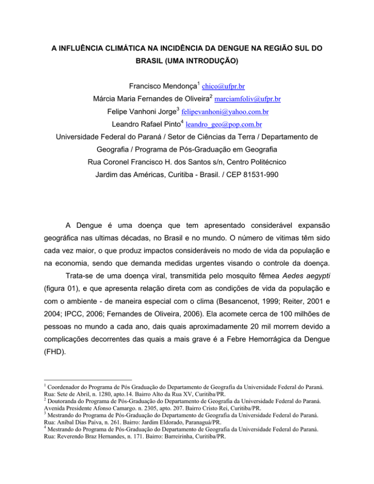A INFLUÊNCIA CLIMÁTICA NA INCIDÊNCIA DA DENGUE NA REGIÃO SUL DO BRASIL (UMA INTRODUÇÃO) Francisco Mendonça1 [email protected] Márcia Maria Fernandes de Oliveira2 [email protected] Felipe Vanhoni Jorge3 [email protected] Leandro Rafael Pinto4 [email protected] Universidade Federal do Paraná / Setor de Ciências da Terra / Departamento de Geografia / Programa de Pós-Graduação em Geografia Rua Coronel Francisco H. dos Santos s/n, Centro Politécnico Jardim das Américas, Curitiba - Brasil. / CEP 81531-990 A Dengue é uma doença que tem apresentado considerável expansão geográfica nas ultimas décadas, no Brasil e no mundo. O número de vitimas têm sido cada vez maior, o que produz impactos consideráveis no modo de vida da população e na economia, sendo que demanda medidas urgentes visando o controle da doença. Trata-se de uma doença viral, transmitida pelo mosquito fêmea Aedes aegypti (figura 01), e que apresenta relação direta com as condições de vida da população e com o ambiente - de maneira especial com o clima (Besancenot, 1999; Reiter, 2001 e 2004; IPCC, 2006; Fernandes de Oliveira, 2006). Ela acomete cerca de 100 milhões de pessoas no mundo a cada ano, dais quais aproximadamente 20 mil morrem devido a complicações decorrentes das quais a mais grave é a Febre Hemorrágica da Dengue (FHD). 1 Coordenador do Programa de Pós Graduação do Departamento de Geografia da Universidade Federal do Paraná. Rua: Sete de Abril, n. 1280, apto.14. Bairro Alto da Rua XV, Curitiba/PR. 2 Doutoranda do Programa de Pós-Graduação do Departamento de Geografia da Universidade Federal do Paraná. Avenida Presidente Afonso Camargo. n. 2305, apto. 207. Bairro Cristo Rei, Curitiba/PR. 3 Mestrando do Programa de Pós-Graduação do Departamento de Geografia da Universidade Federal do Paraná. Rua: Aníbal Dias Paiva, n. 261. Bairro: Jardim Eldorado, Paranaguá/PR. 4 Mestrando do Programa de Pós-Graduação do Departamento de Geografia da Universidade Federal do Paraná. Rua: Reverendo Braz Hernandes, n. 171. Bairro: Barreirinha, Curitiba/PR. Figura 1 Embora a incidência da dengue apresente estreita relação com as condições sócioeconomicas, culturais e políticas de uma determinada sociedade, no presente estudo o enfoque volta-se à sua interação com as condições climáticas, pois que o vetor e o vírus da doença respondem diretamente às influências deste componente do ambiente natural. Para ilustrar o presente estudo tomou-se como analise as interações entre a distribuição da Dengue e as condições climáticas na região Sul do Brasil, compreendendo os Estados do Paraná (PR), Santa Catarina (SC) e Rio Grande do Sul (RS) - figura 02 - no período de 1999 a 2004. Nesta porção do país os primeiros registros de casos de dengue datam de 1993, mas apresentaram uma considerável evolução após este ano, pois, a partir de 1995 que foram registradas as primeiras epidemias. Métodos e técnicas da pesquisa O presente estudo foi elaborado segundo uma concepção sistêmica na qual a manifestação da dengue (vírus, mosquito e ser humano) responde a influências da sociedade (cultura, economia e política) e do ambiente (clima) na qual está inserida. Trata-se de uma perspectiva multicausal na abordagem do processo saúde-doença da população para a qual o enfoque geográfico reveste-se de suma importância. Para o estudo da manifestação e expansão da dengue na região Sul do Brasil utilizouse do bando de dados do SINAN – Sistema Nacional de Acompanhamento e Notificação – do Ministério da Saúde, bem como de dados fornecidos pelas Secretarias Estaduais de Saúde dos Estados do Paraná, Santa Catarina e Rio Grande do Sul, correspondentes ao período de 1990 a 2004, embora o período analisado no presente estudo seja referente a 1999 a 2003. Os dados meteorológicos foram fornecidos pelo INMET – Instituto Nacional de Meteorologia. Para o tratamento dos dados empregou-se inicialmente o software Excel e, posteriormente, o software Access para organização do banco de dados. Em seguida este banco foi trabalhado no software ArcView GIS 3.3, que serviu para o desenvolvimento da representação espacial da doença analisada, sobre bases cartográficas cedidas pelo IBGE. Os resultados apresentados em forma de tabelas, gráficos e mapas possibilitaram a elaboração de uma análise crítica sobre a espacialidade da dengue e sua evolução na região Sul do Brasil no período aludido, parte deles constituindo-se no conteúdo do presente texto. A dengue na região Sul do Brasil A região Sul do Brasil apresenta uma muito recente (re)introdução da dengue nos registros de saúde, pois que a doença (re)aparece na região somente a partir de meados da década de 1990. A grande maioria dos casos de dengue registrados caracteriza-se como importados, ou seja, foram contraídos em outros estados do país ou em países vizinhos e, somente no Estado do Paraná é que observou-se o registro de casos autóctones da doença. Esta situação parece refletir não somente a distinção de condições de vida / modo de vida da população dos três estados, mas sobretudo a diversidade climática desta região em relação ao restante do país, pois ela se constitui na mais fria (ou menos quente) porção do território nacional. Entre as epidemias registradas na última década no Estado do Paraná, aquela ocorrida no ano de 2003 destacou-se como a mais importante. Nela foram registrados mais de 12.000 casos, dos quais o número de casos autóctones confirmados excedeu a 9.300 (SINAN/SESA-PR). Considerando-se que o numero de casos seja, normalmente, três vezes superior ao total dos registrados, estima-se que mais de 40 mil pessoas tenham sido infectadas pelo vírus naquele ano, o que demanda uma atenção especial da saúde pública. Trata-se de uma doença cujo controle esta embasado no modo de vida, nas políticas públicas e no ambiente, pois que não possui controle 