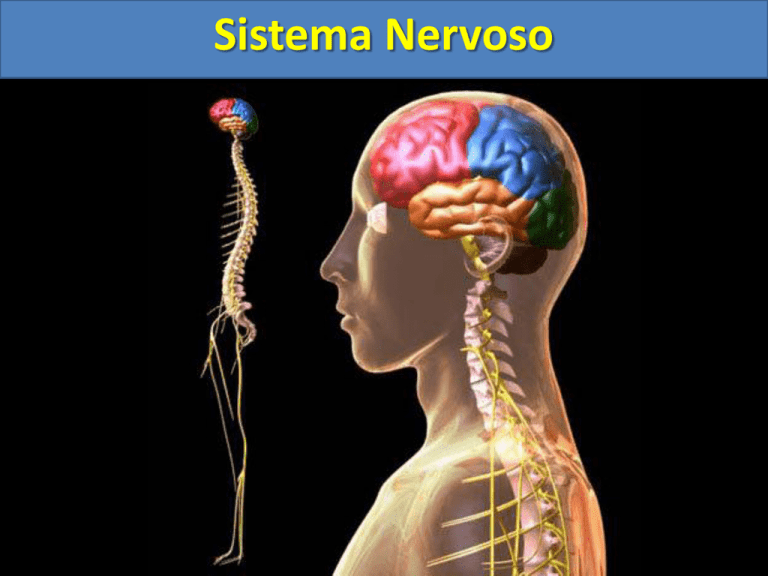 Sistema Nervoso TIPOS DE NEURÔNIOS NEURÔNIO SENSORIAL CORPO CELULAR Direção da condução AXÔNIO CORPO CELULAR NEURÔNIO ASSOCIATIVO DENDRITOS AXÔNIO CORPO CELULAR AXÔNIO NEURÔNIO MOTOR SINAPSE AXÔNIO DENDRITO Vesículas sinápticas contém NEUROTRANSMISSORES A velocidade do impulso nervoso varia de neurónio para neurónio e relacionase com a estrutura do axônio. A rápida propagação do impulso nervoso nos neurónios dos vertebrados é garantida pela presença da bainha de mielina que recobre os axónios. Como se transmite o impulso nervoso entre neurônios? As terminações dos axónios estabelecem ligações com as dendrites ou com o corpo celular do dos neurónios seguintes Região de contacto muito próximo entre a extremidade de um neurónio e a superfície de outras células - SINAPSE Na fenda sináptica, quando o impulso atinge as extremidades do axónio pré-sináptico, libertam-se para a fenda os NEUROTRANSMISSORES. Estas substâncias químicas ligam-se a receptores da membrana da célula seguinte (célula pós-sináptica). E, o impulso propaga-se… Sistema Nervoso 1) Introdução O sistema nervoso é responsável pelo ajustamento do organismo ao ambiente. Sua função é perceber e identificar as condições ambientais externas, bem como as condições reinantes dentro do próprio corpo e elaborar respostas que adaptem a essas condições. 2) Organização do sistema nervoso humano Cérebro Encéfalo Sistema Nervoso Central (SNC) Cerebelo Mesencéfalo Tronco Encefálico Ponte Bulbo Medula Sistema Nervoso Periférico (SNP) Nervos cranianos (12 pares) Nervos raquidianos (31 pares) Terminações nervosas Somático Autônomo Simpático Parasimpático Sistema Nervoso 3) Sistema nervoso central (SNC) a) Encéfalo Possui cerca de 1,4 kg nos adultos Está localizado na caixa craniana Dividido em 3 partes: cérebro, cerebelo e tronco encefálico Encéfalo cérebro cerebelo Tronco encefálico Sistema Nervoso 3) Sistema nervoso central (SNC) a) Encéfalo I) Cérebro Constitui cerca de 90% da massa encefálica Sua superfície é bastante pregueada (aumento da superfície) Dividido em dois hemisférios (esquerdo e direito) Dividido em duas partes: o Córtex (externo) – substância cinzenta (corpos celulares) o Região interna – substância branca (dendritos e axônios) CÓRTEX CEREBRAL LOBO FRONTAL: processamentos complexos (cognição, planejamento e iniciação dos movimentos voluntários). LOBO PARIETAL: área de projeção e processamento somestésico. LOBO TEMPORAL: área de projeção e processamento auditivo. LOBO OCCIPITAL: área de projeção e processamento visual Sistema Nervoso 3) Sistema nervoso central (SNC) a) Encéfalo I) Cérebro Funções: o Sensações o Atos conscientes e voluntários (movimentos) o Pensamento o Memória o Inteligência o Aprendizagem o Sentidos o Equilíbrio Sistema Nervoso 3) Sistema nervoso central (SNC) a) Encéfalo I) Cérebro Tálamo e Hipotálamo (presentes na região inferior do cérebro) Tálamo o Reorganização dos estímulos nervosos o Percepção sensorial (consciência) o Consciência, alerta e atenção Hipotálamo o Regulador da homeostase corporal o Temperatura o Apetite o Balanço hídrico o Expressão emocional o Comportamento sexual o Controle da hipófise e outras glândulas Sistema Nervoso 3) Sistema nervoso central (SNC) I) Cérebro Tálamo e Hipotálamo Tálamo Hipotálamo Sistema Nervoso 3) Sistema nervoso central (SNC) II) Cerebelo Responsável pelo equilíbrio do corpo Tônus e vigor muscular Orientação espacial Coordenação dos movimentos Cerebelo Sistema Nervoso 3) Sistema nervoso central (SNC) III) Tronco encefálico 3 divisões: Mesencéfalo Ponte Bulbo Mesencéfalo Ponte Bulbo Sistema Nervoso 3) Sistema nervoso central (SNC) III) Tronco encefálico Mesencéfalo o Recepção e coordenação da contração muscular o Postura corporal Mesencéfalo Sistema Nervoso 3) Sistema nervoso central (SNC) III) Tronco encefálico Ponte o Manutenção da postura corporal, equilíbrio do corpo e tônus muscular. o Movimentação dos olhos, pescoço e corpo. Ponte Sistema Nervoso 3) Sistema nervoso central (SNC) III) Tronco encefálico Bulbo o Controle dos batimentos cardíacos o Controle dos movimentos respiratórios o Controle da deglutição (engolir) Bulbo Sistema Nervoso 3) Sistema nervoso central (SNC) b) Medula Espinhal (raque) Cordão cilíndrico que parte da base do encéfalo e percorre toda a coluna vertebral. Aloja-se dentro das perfurações das vértebras. Da medula espinhal partem 31 pares de nervos raquidianos Sistema Nervoso 3) Sistema nervoso central (SNC) b) Medula Espinhal (raque) Funções da medula o Recebe as informações de diversas partes do corpo e as enviam para o encéfalo e vice-versa. o Responsável pelos atos reflexos (reflexo medular). Sistema Nervoso 3) Sistema nervoso central (SNC) b) Medula Espinhal (raque) Reflexo Medular A medula espinhal é capaz de elaborar respostas rápidas em situações de emergência, sem a interferência do encéfalo. Sistema Nervoso 3) Sistema nervoso central (SNC) c) Meninges São três (SNC). o o o delicadas membranas que revestem e protegem o sistema nervoso central Dura-máter Aracnóide Pia-máter Medula espinhal Encéfalo Sistema Nervoso 4) Sistema nervoso periférico (SNP) Constituído por: a) Nervos b) Gânglios nervosos c) Terminações nervosas (receptores para dor, tato, frio, pressão, calor, paladar, etc.). Nervos São fios finos formados por vários axônios de neurônios envolvidos por tecido conjuntivo. Transmitem mensagens de várias partes do corpo para o sistema nervoso central ou destes para as regiões corporais. Sistema Nervoso 4) Sistema nervoso periférico (SNP) Classificação dos nervos I) Quanto ao tipo de neurônio Sensitivos ou aferentes (contém apenas neurônios sensitivos) Motores ou eferentes (contém apenas neurônios motores) Mistos (contém neurônios sensitivos e motores) II) Quanto à posição anatômica Cranianos (lig