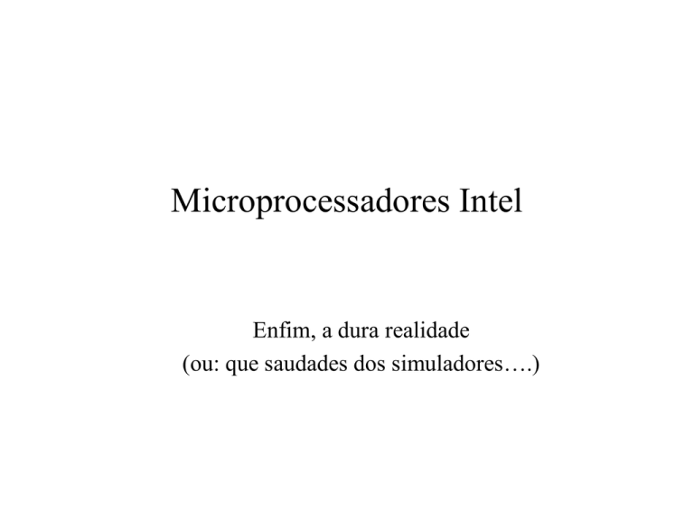 Microprocessadores Intel Enfim, a dura realidade (ou: que saudades dos simuladores….) Chip 8088(6) 80186 80286 ALU 16 16 16 reg 16 16 16 dado 8 (16) 16 16 End. 20 20 24 386SX 80386 486SX 80486 486DX2 32 32 32 32 32 32 32 32 32 32 16 32 32 32 32 32 32 32 32 32 DX4 32 32 32 32 Pentium 32 32 64 32 Pentium Pro 32 32 64 36 Pentium MMX 32 32 64 32 Pentium II 32 32 64 36 Cache - Características micro de 16 bits 8086 & circuitos de apoio memória virtual segmentada e modo protegido 80386 simplificado MMU, 32 bits e modo virtual 8K 80486 sem FPU 8K 80386 com FPU 8K 486 com frequência interna de clock dupla 8K instr. 486 com frequência interna de clock 8K dado tripla 8K instr. 2 pipelines inteiros, FPU de 64 bits, 8K dado lógica de previsão de desvios 8K instr. Pentium, mais renomeação de 8K dado registradores e execução fora de 256Knível2 sequência 16K instr. Pentium, com instruções extras para 16K dado paralelismo (SIMD) 16K instr. Pentium Pro com MMX 16K dado 512Knível2 Chip Pentium ALU reg dado 32 32 64 Pentium Pro 32 32 64 Pentium MMX 32 32 64 Pentium II 32 32 64 Pentium Celeron II 32 32 64 Pentium Celeron A II 32 32 64 Pentium II Xeon 32 32 64 Pentium III 32 32 64 Pentium 4 32 32 64 End. Cache 32 8K instr. 8K dado 36 8K instr. 8K dado 256Knível2 32 16K instr. 16K dado 36 16K instr. 16K dado 512Knível2 36 16K instr. 16K dado 0K nível 2 36 16K instr. 16K dado 128Knível2 36 16K instr. 16K dado cache nív.2 36 16K instr. 16K dado cache nív.2 36 12K instr. 8K dado cache nív.2 Características 2 pipelines inteiros, FPU de 64 bits, lógica de previsão de desvios Pentium, mais renomeação de registradores e execução fora de sequência Pentium, com instruções extras para paralelismo (SIMD) Pentium Pro com MMX Pentium II sem cache de nível 2 Pentium II com cache na mesma frequência da CPU Pentium II com 512K/1M/2M de cache na mesma frequência da CPU Pentium II com instruções extras para paralelismo de ponto flutuante Pentium III com mais instruções extras para paralelismo de ponto flutuante (SSE2) Características tecnológicas Processador 8088(6) 80286 80386 486SX 486DX 486DX2 DX4 Pentium 60/66 Pentium 75/200 Pentium Pro Pentium MMX Pentium II Celeron Celeron A Xeon Pentium III Pentium III E Pentium 4 Cache 8K 8K 8K 16K 2x8K 2x8K 2x8K 2x16K 2x16K 2x16K 2x16K 2x16K 2x16K 2x16K 8K tipo WT WT WT WT WB WB WB WB WB WB WB WB WB WB WB nível 2 256K 512K 0K 128K 512K-2M 512K 256K 256K frequência 1 1/2 1 1 1/2 1 1 mult. 1x 1x 1x 1x 1x 2x 2-3x 1x 1,5-3x 2-3x 1,5-3x 3,5-5x 3,5-5x 3,5-5x 3,5-5x 3,5-5x 4,0-9x 3,0-4x Tensão 5V 5V 5V 5V 5V 5V 3,3 V 5V 3,3 V 3,3 V 1,8-2,8 V 1,8-2,8 V 1,8-2,8 V 1,8-2,8 V 1,8-2,8 V 1,8-2,8 V 1,3-1,7 V 1,3-1,7 V Transistor 29.000 134.000 275.000 1.185.000 1.200.000 1.100.000 1.600.000 3.100.000 3.300.000 5.500.000 4.100.000 7.500.000 7.500.000 7.500.000 7.500.000 9.500.000 28.100.000 42.000.000 Computadores Pessoais tipo PC tipos microprocessador FPU barramento de dados barramento de endereços PC XT PC AT PC AT PC AT 386 486 8088 80286 80386 80486 8087 8 bits 80287 80387 16 bits 32 bits 20 bits 24 bits 30 bits Pentium P5 Pentium, MMX interna interna 32 bits 64 bits Pentium P6 Pentium Pro, II, III, 4 Interna 64 bits 30 bits 33 bits 30 bits • versão PC 99 disponível em http://developer.intel.com/design/desguide ou http://www.microsoft.com/hwdev/pc99.htm. • Usos distintos (servidores, portáteis, domésticos, estações de trabalho, etc) • Configuração básica: – – – – – – – – Pentium II 300 MHz 32 a 64 MBytes de memória barramento PCI (sem conectores ISA) duas portas USB resolução de vídeo de 800 x 600 com 64K cores suporte a CD ou DVD modem de 56 Kbps ou placa de rede opcionais: placas de som, placas aceleradoras 3D, suporte a infravermelho (IrDA) e IEEE 1394 (barramento serial rápido) • versão PC 2001 disponível em http://www.pcdesguide.org. • Usos distintos (servidores, portáteis, domésticos, estações de trabalho, etc) • Configuração básica: – – – – – – – – – Pentium II 667 MHz (desktop) ou 400 MHz (laptop) 64 a 128 MBytes de memória barramento PCI (proibição de conectores ISA) duas portas USB (substituição de portas seriais e paralela) resolução de vídeo de 1024 x 768 com 32 bits por pixel suporte a CD ou DVD modem de 56 Kbps ou placa de rede placa aceleradora 3D em modelos desktop opcionais: placas de som, suporte a infravermelho (IrDA) e IEEE 1394 (barramento serial rápido) Microprocessador Intel 8086 • • • • Arquitetura de 16 bits Comunicação com a memória em 16 (8086) ou 8 (8088) bits Capacidade máxima de memória de 1 MByte 14 registradores (4 dado, 4 endereço, 4 segmento, ponteiro do programa, flags) Microprocessador Intel 8086/8088 15 AX BX CX DX SP BP SI DI IP FLAGS CS DS SS ES 8 AH BH CH DH 7 0 AL BL CL DL acumulador base contador dado ponteiro para pilha ponteiro base índice fonte índice destino apontador de instruções flags segmento de código segmento de dados segmento de pilha segmento extra Microprocessador Intel 8086 • • • • Arquitetura de 16 bits Comunicação com a memória em 16 (8086) ou 8 (8088) bits Capacidade máxima de memória de 1 MByte 14 registradores (4 dado, 4 endereço, 4 segmento, ponteiro do programa, flags) • endereço físico = segmento * 16 + deslocamento 8086 - Formação de endereço 15 0 Offset (deslocamento) CS DS SS ES 15 0 0000 0000 0000 0000 19 0 Endereço Físico Uso padrão de registradores de segmento tipo de referência memória busca de instrução pilha variável à segmento default CS SS DS segmento alternativo BP como base SS CS,ES,DS string fonte string destino DS ES CS,ES,SS CS,ES,SS deslocamento IP SP endereço de operando endereço de operando SI DI Uso padrão de registradores de segmento Modos de endereçamento (cálculo do deslocamento) Modo Imediato Registrador Direto Significado operando na instrução operando em registrador operando na memória, endereçado por deslocamento contido na ins