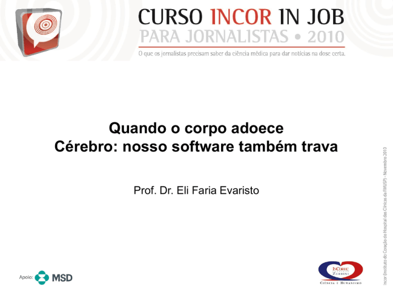 Quando o corpo adoece Cérebro: nosso software também trava Prof. Dr. Eli Faria Evaristo Cérebro: nosso software também trava • Temas abordados nesta aula • Doença de Alzheimer • Estamos perto da cura? • Doença de Parkinson • E quando os remédios não resolvem? • Acidente Vascular Cerebral • O tratamento faz mesmo diferença? Doença de Alzheimer: estamos perto da cura? Diagnóstico precoce e remédios ajudam a retardar efeitos do Alzheimer Doença cerebral degenerativa atinge 5% população com mais de 65 anos e não tem cura Agência Brasil da 21 de setembro de 2010 | 20h 05 http://www.estadao.com.br/noticias/vida,diagnostico-precoce-e-remedios-ajudam-a-retardar-efeitosdo-alzheimer,613212,0.htm Doença de Alzheimer: estamos perto da cura? • Questões importantes • É fácil fazer o diagnóstico precoce da doença? • O que a Doença de Alzheimer causa no cérebro? • Como agem os remédios atualmente disponíveis? • Quais são os principais desafios na busca da cura? É fácil fazer o diagnóstico precoce da Doença de Alzheimer? • Dificuldades • Sintomas insidiosos • Perda de memória • Dificuldade em planejar e resolver • Dificuldade em completar tarefas em casa, no trabalho e no lazer • Confusão com tempo ou espaço • Problemas de ordem visuoespacial • Dificuldade nova para ler e escrever • Esquecimento de objetos e trajetos • Alterações de juízo e crítica • Isolamento de atividades sociais e profissionais • Alterações de humor e personalidade Adaptado de http://www.alz.org/alzheimers_disease_10_signs_of_alzheimers.asp É fácil fazer o diagnóstico precoce da Doença de Alzheimer? • Dificuldades • Sintomas insidiosos • Início da patologia antes dos sintomas http://www.nia.nih.gov/NR/rdonlyres/BF555973-D7E2-4C98-A81F-8E27B689A9BA/2470/03_chartcourse_big.jpg É fácil fazer o diagnóstico precoce da Doença de Alzheimer? • Outras doenças degenerativas • Dificuldades • Alterações circulatórias • Sintomas insidiosos • Alterações hormonais • Início da patologia antes dos sintomas • Outros diagnósticos • Deficiências vitamínicas • Doenças infecciosas • Doenças inflamatórias Adaptado de http://www.alz.org/alzheimers_disease_10_signs_of_alzheimers.asp O que a Doença de Alzheimer causa no cérebro? • Alterações anatomopatológicas • Emaranhados neurofibrilares • Placas amilóides • Perda neuronal http://www.ahaf.org/assets/images/plaques_and_tangles_border.jpg O que a Doença de Alzheimer causa no cérebro? • Emaranhados neurofibrilares • Desagregação de micro-túbulos intracelulares • Hiperfosforilação da proteína TAU Adaptado de http://www.nia.nih.gov/Alzheimers/Publications/ADProgress2004_2005/Part3/part3a.htm http://agewell.biz/2010/02/15/hallmarks-of-alzheimer%E2%80%99s-disease/ O que a Doença de Alzheimer causa no cérebro? • Emaranhados neurofibrilares (fragmentos de proteína TAU) Adaptado de http://www.nia.nih.gov/Alzheimers/Publications/ADProgress2004_2005/Part3/part3a.htm http://agewell.biz/2010/02/15/hallmarks-of-alzheimer%E2%80%99s-disease/ O que a Doença de Alzheimer causa no cérebro? • Clivagem normal da proteína precursora de amilóide • Ação da -secretase e -secretase Adaptado de http://www.nia.nih.gov/NR/rdonlyres/BF555973-D7E2-4C98-A81F-8E27B689A9BA/2657/03_pathways01_big1.jpg O que a Doença de Alzheimer causa no cérebro? • Clivagem anormal da proteína precursora de amilóide • Ação da -secretase e -secretase Adaptado de http://www.nia.nih.gov/NR/rdonlyres/BF555973-D7E2-4C98-A81F-8E27B689A9BA/2657/03_pathways01_big1.jpg O que a Doença de Alzheimer causa no cérebro? • Placas amilóides • Proteína precursora de amilóide • Ação das secretases e • Peptídio -amilóide • Oligômeros solúveis de Pa • Polimerização dos fragmentos • Formação da placa amilóide Adaptado de http://www.nia.nih.gov/NR/rdonlyres/878C0448-1597-4E49-A23A-D105795B36FD/10887/02_plaques2_lg1.jpg O que a Doença de Alzheimer causa no cérebro? • Perda neuronal • Intensa atrofia cerebral Adaptado de http://possibilistic.org/presentation/alzheimers-cell-phys/ O que a Doença de Alzheimer causa no cérebro? • ENTRETANTO... • Não sabemos se essas alterações patológicas (emaranhados neurofibrilares, placas amilóides e atrofia cerebral) são causadoras da doença ou apenas achados secundários ao envelhecimento cerebral Como agem os remédios atualmente disponíveis? • Anticolinesterásicos •Tacrina, donepezila, rivastigmina, galantamina • Antagonista de receptor NMDA • Memantina Situação habitual na fenda sináptica Adaptado de http://www.cnsforum.com/content/pictures/imagebank/hirespng/Drug_neostig.png Como agem os remédios atualmente disponíveis? Situação habitual na fenda sináptica Acetilcolina é o principal neurotransmissor envolvido com memória Adaptado de http://www.cnsforum.com/content/pictures/imagebank/hirespng/Drug_neostig.png Como agem os remédios atualmente disponíveis? Anticolinesterásicos Bloqueio da acetilcolinesterase Essas medicações aumentam o neurotransmissor acetilcolina Adaptado de http://www.cnsforum.com/content/pictures/imagebank/hirespng/Drug_neostig.png Como agem os remédios atualmente disponíveis? Bloqueio da acetilcolinesterase Pode ocorrer melhora parcial dos sintomas, mas não cura ou abrandamento da evolução Adaptado de http://www.ncbi.nlm.nih.gov/pmc/articles/PMC2684708/figure/F1/ Quais são os principais desafios na busca da cura? • Fazer o diagnóstico precoce da DA • Exames laboratoriais (biomarcadores? genes?) • Usar remédios com ação no início do processo • Vacina; anticorpo monoclonal; antiagregante de PA; inibidores de secretase (?); terapia celular? • Detectar pontos de ação ainda mais iniciais • O que leva a ação preferencial da -secretase? Doença de Parkinson: e quando os remédios não resolvem? Cerca de 200 mil brasileiros sofrem do Mal de Parkins
