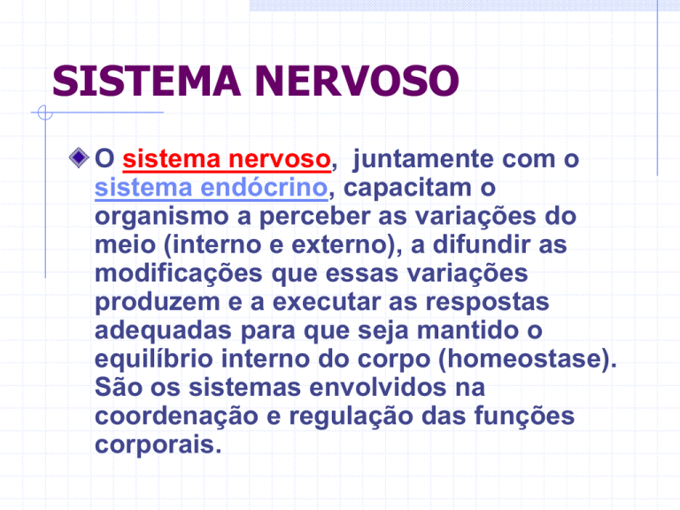 SISTEMA NERVOSO O sistema nervoso, juntamente com o sistema endócrino, capacitam o organismo a perceber as variações do meio (interno e externo), a difundir as modificações que essas variações produzem e a executar as respostas adequadas para que seja mantido o equilíbrio interno do corpo (homeostase). São os sistemas envolvidos na coordenação e regulação das funções corporais. SISTEMA NERVOSO SISTEMA NERVOSO O SNC recebe, analisa e integra informações. É o local onde ocorre a tomada de decisões e o envio de ordens. O SNP carrega informações dos órgãos sensoriais para o sistema nervoso central e do sistema nervoso central para os órgãos efetores (músculos e glândulas). SISTEMA NERVOSO No sistema nervoso diferenciam-se duas linhagens celulares: os neurônios e as células da glia (ou da neuróglia). Os neurônios são as células responsáveis pela recepção e transmissão dos estímulos do meio (interno e externo), possibilitando ao organismo a execução de respostas adequadas para a manutenção da homeostase. SISTEMA NERVOSO Para exercerem tais funções, contam com duas propriedades fundamentais: a irritabilidade (também denominada excitabilidade ou responsividade) e a condutibilidade. Irritabilidade é a capacidade que permite a uma célula responder a estímulos, sejam eles internos ou externos. SISTEMA NERVOSO Irritabilidade é a capacidade que permite a uma célula responder a estímulos, sejam eles internos ou externos. A resposta emitida pelos neurônios assemelha-se a uma corrente elétrica transmitida ao longo de um fio condutor: uma vez excitados pelos estímulos, os neurônios transmitem essa onda de excitação - chamada de impulso nervoso - por toda a sua extensão em grande velocidade e em um curto espaço de tempo. Esse fenômeno deve-se à propriedade de condutibilidade. SISTEMA NERVOSO Os corpos celulares dos neurônios são geralmente encontrados em áreas restritas do sistema nervoso, que formam o Sistema Nervoso Central (SNC), ou nos gânglios nervosos, localizados próximo da coluna vertebral. SISTEMA NERVOSO CÉLULAS DA GLIA (NEURÓGLIA) As células da neuróglia cumprem a função de sustentar, proteger, isolar e nutrir os neurônios. SISTEMA NERVOSO Do sistema nervoso central partem os prolongamentos dos neurônios, formando feixes chamados nervos, que constituem o Sistema Nervoso Periférico (SNP). SISTEMA NERVOSO PERCURSO DO IMPULSO NERVOSO NO NEURÔNIO SISTEMA NERVOSO O SNC divide-se em encéfalo e medula. SISTEMA NERVOSO SISTEMA NERVOSO A MEDULA ESPINHAL SISTEMA NERVOSO SISTEMA NERVOSO SISTEMA NERVOSO PERIFÉRICO SISTEMA NERVOSO ATOS REFLEXOS SISTEMA NERVOSO SISTEMA NERVOSO SENTIDOS SENTIDOS Os sentidos fundamentais do corpo humano - visão, audição, tato, gustação ou paladar e olfato - constituem as funções que propiciam o nosso relacionamento com o ambiente. Por meio dos sentidos, o nosso corpo pode perceber muita coisa do que nos rodeia; contribuindo para a nossa sobrevivência e integração com o ambiente em que vivemos. SENTIDOS Existem determinados receptores, altamente especializados, capazes de captar estímulos diversos. Tais receptores, chamados receptores sensoriais, são formados por células nervosas capazes de traduzir ou converter esses estímulos em impulsos elétricos ou nervosos que serão processados e analisados em centros específicos do sistema nervoso central (SNC), onde será produzida uma resposta (voluntária ou involuntária). A estrutura e o modo de funcionamento destes receptores nervosos especializados é diversa. SENTIDOS Dessa maneira: pelo tato - sentimos o frio, o calor, a pressão atmosférica, etc; pela gustação - identificamos os sabores; pelo olfato - sentimos o odor ou cheiro; pela audição - captamos os sons; pela visão - observamos as cores, as formas, os contornos, etc. SENTIDOS Em nosso corpo os órgãos dos sentidos estão encarregados de receber estímulos externos. Esses órgãos são: a pele - para o tato; a língua - para a gustação; as fossas nasais - para o olfato; os ouvidos - para a audição; os olhos - para a visão. VISÃO ANATOMIA DO OLHO VISÃO VISÃO Em ambientes mal iluminados, por ação do sistema nervoso simpático, o diâmetro da pupila aumenta e permite a entrada de maior quantidade de luz. Em locais muito claros, a ação do sistema nervoso parassimpático acarreta diminuição do diâmetro da pupila e da entrada de luz. Esse mecanismo evita o ofuscamento e impede que a luz em excesso lese as delicadas células fotossensíveis da retina. VISÃO O MECANISMO DA VISÃO Os raios luminosos atravessam a córnea, o cristalino, o humor aquoso e o humor vítreo e atingem a retina. O mecanismo da visão pode ser melhor entendido, se compararmos o globo ocular a uma câmara fotográfica: o cristalino seria a objetiva; a Íris, o diafragma, e a retina seria a placa ou película. Desta maneira os raios luminosos, ao penetrarem na córnea e no humor aquoso, passando pela pupila, chegam ao cristalino, que leva a imagem mais para trás ou para frente, permitindo que ela se projete sobre a retina. O MECANISMO DA VISÃO O MECANISMO DA VISÃO O nervo óptico conduz os impulsos nervosos para o centro da visão, no cérebro, que o interpreta e nos permite ver os objetos nas posições em que realmente se encontram. AUDIÇÃO ANATOMIA DA ORELHA O órgão responsável pela audição é a orelha (antigamente denominado ouvido), também chamada órgão vestíbulo-coclear ou estato-acústico. A maior parte da orelha fica no osso temporal, que se localiza na caixa craniana. Além da função de ouvir, o ouvido também é responsável pelo equilíbrio. AUDIÇÃO A orelha está dividida em três partes: orelhas externa, média e interna (antigamente denominadas ouvido externo, ouvido médio e ouvido interno). AUDIÇÃO AUDIÇÃO ORELHA EXTERNA A orelha externa é formada pelo pavilhão auditivo (antigamente denominado orelha) e pelo canal auditivo externo ou meato auditivo. AUDIÇ