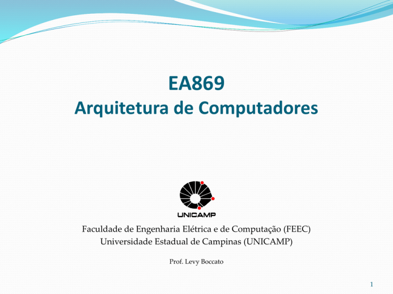 EA869 Arquitetura de Computadores Faculdade de Engenharia Elétrica e de Computação (FEEC) Universidade Estadual de Campinas (UNICAMP) Prof. Levy Boccato 1 Recordando Problema Estruturas de dados Representação numérica Algoritmo Nível Conceitual Linguagem Assembly Hierarquia de linguagens Como está organizado o hardware de um computador? Hardware ARQUITETURA DE COMPUTADORES 2 Introdução Objetivos: Conhecer os processadores. principais aspectos da arquitetura de Conhecer as características de cada componente desta arquitetura. Projetar uma máquina simples. O que é um computador? Seguindo o espírito da máquina universal de Turing, é uma máquina cuja função é ler e executar instruções. 3 Introdução Instrução de máquina: Identifica uma operação elementar que o processador é capaz de realizar. Nela, o processador deve encontrar referências quanto: I. II. à operação que deve realizar – soma, subtração, movimentação de dados etc. aos operandos envolvidos – onde estão os dados que desejamos manipular? A linguagem simbólica oferece uma maneira visualmente mais atraente para descrever uma instrução. Exemplo: 0010 0001 Código da operação Identificação do primeiro operando A leitura do código da operação deve desencadear no processador uma sequência de ações, através de sinais de controle, que ativem os elementos do circuito responsáveis por realizar uma soma, tendo como entrada os operandos identificados na instrução. Instrução: ADD r1, r5 0101 Identificação do segundo operando r1 ← r1 + r5 4 Introdução Tendo este entendimento inicial acerca das instruções, daremos início ao estudo da arquitetura e organização de computadores. Quais componentes devem existir em um computador? 5 Introdução Tendo este entendimento inicial acerca das instruções, daremos início ao estudo da arquitetura e organização de computadores. Quais componentes devem existir em um computador? Processador Gabinete Sistema operacional Memória Placa mãe Disco rígido Monitor Jogos 6 Arquitetura de computadores 7 Arquitetura de computadores 8 Registradores O que são? Elementos de armazenamento de informação. O que armazenam? 1 palavra de informação – Ex.: ARM: 32 bits. Características: Estão localizados dentro do processador e são de rápido acesso. Realizam algumas operações sincronizadas com o relógio (clock) do sistema. Como são construídos? Um registrador de n bits é formado pela ligação de n flip-flops, cada um armazenando 1 bit de informação, sincronizados pelo mesmo relógio. Flip-flops? REGISTRADOR 9 Registradores Flip-flops: circuitos digitais que atuam como uma memória de 1 bit. FLIP-FLOP D Mantém o estado anterior a cada pulso do relógio. FLIP-FLOP JK Além de manter o estado anterior, ele pode setar (1), resetar (0) ou complementar a saída a cada pulso do clock. Tabela Verdade J K Q 0 0 Q 0 1 0 D Q 1 0 1 0 0 1 1 Q’ 1 1 Tabela Verdade Operação Sensíveis ao nível Sensíveis à borda de subida Sensíveis à borda de descida 10 Registradores Agora que recordamos como funcionam os FFs, vamos ver quais operações podem ser realizadas no registrador. Transferência de dados: o registrador envia (leitura) ou recebe (escrita) dados do barramento. Lembrar que cada operação é sincronizada com o relógio do sistema. W Clock Comando Operação W REG ← (BAR) R BUS ← (REG) R REGISTRADOR 11 Registradores Agora que recordamos como funcionam os FFs, vamos ver quais operações podem ser realizadas no registrador. Transferência de dados: o registrador envia (leitura) ou recebe (escrita) dados do barramento. Lembrar que cada operação é sincronizada com o relógio do sistema. Comando Operação W REG ← (BAR) R BUS ← (REG) Barramento Clock W K ... Clock R CLK Ai K J ... J Bi Controle de acesso ao barramento via tri-state ... 12 Registradores Agora que recordamos como funcionam os FFs, vamos ver quais operações podem ser realizadas no registrador. Complementação: o registrador recebe seus bits complementados. Exemplo: registrador de 4 bits – 0110 se torna 1001. W Clock Comando Operação C REG ← (REG) R C REGISTRADOR 13 Registradores Agora que recordamos como funcionam os FFs, vamos ver quais operações podem ser realizadas no registrador. Deslocamento: o registrador recebe seus bits deslocados. Exemplo: registrador de 4 bits – 0110 se torna 0011. W Clock Comando Operação D REG ← SHIFT(REG) R C D REGISTRADOR 14 Registradores Agora que recordamos como funcionam os FFs, vamos ver quais operações podem ser realizadas no registrador. Incrementa/Decrementa: o registrador recebe os seus bits somados ou subtraídos por 1. Exemplo: registrador de 4 bits (incremento) – 0110 se torna 0111. W Clock Comando Operação I/D REG ← (REG) +/- 1 R C D I/D REGISTRADOR 15 Registradores Agora que recordamos como funcionam os FFs, vamos ver quais operações podem ser realizadas no registrador. Set/Reset: o registrador recebe 1 (set) ou 0 (reset) em todos os seus bits. Exemplo: registrador de 4 bits (set) – 0110 se torna 1111. W Clock Comando Operação S/R REG ← 1/0 R C D I/D REGISTRADOR S/R 16 Registradores Registrador sensível a múltiplos comandos: Responde a múltiplos sinais de controle. Cuidado: somente um sinal de controle pode estar ativo a cada pulso de relógio. Barramento de dados W R C D I/D S/R Circuito de múltiplos comandos Clock REGISTRADOR 17 Registradores Exemplo: Barramento Barramento W Z C K CLK J FFi Qi W R C Z CLK R Registrador Sensível a Múltiplos Comandos (Sinais de Controle) W - Transferir do barramento para o registrador (Write) R - Transferir do registrador para o barramento (Read) C - Complementar o registrador Z - Zerar o registrador 18 Arquitetura de computadores 19 Unidade Lógico-Aritmética ULA: responsável pela execução de todas as operações sobre os dados. Características: suas entradas e saídas de dados, bem como a operação que pode realizar, estão diretamente relaci
