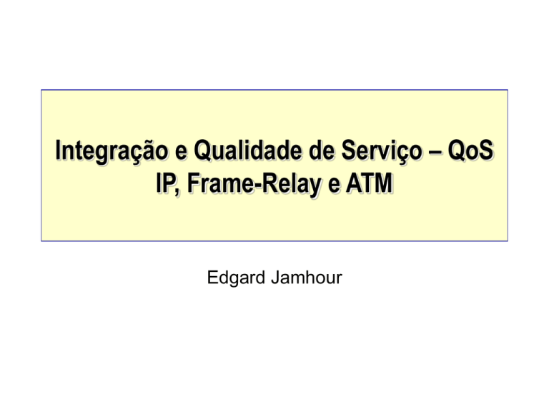 Integração e Qualidade de Serviço – QoS IP, Frame-Relay e ATM Edgard Jamhour Sinalização nas Interfaces • Os protocolos de sinalização do ATM são definidos para cada uma dos quatro tipos de interfaces: – UNI Privada, NNI Privada, UNI Pública, NNI Pública Versões de Protocolo • Os protocolos também divergem se a interface é pública ou privada. • Versão atual: – UNI 3.1, UNI 4.0, definida pelo ATM Forum – P-NNI (Private NNI), Phase 1, definida pelo ATM Forum • Protocolo de sinalização • Protocolo de roteamento Canal de Sinalização • Toda a sinalização no ATM é transportada no canal PVC (Permanet Virtual Circuit) VPI=0, VCI=5. ILMI: Interim Local Management Interface • ILMI é um protocolo de gerenciamente para o ATM – Implementado na UNI e na NNI – Existe em todos os dispositivos de uma rede ATM (switches e dispositivos terminais) – É baseado no protocolo de gerenciamento SNMP (foi definida uma MIB para ILMI) • ILMI utiliza um circuito virtual definido: – VPI=0, VCI=16. • O protocolo ILMI permite a nós adjacentes: – determinarem várias características do outro nó • tipo de protocolo de sinalização – opções de autoconfiguração • como endereçamento. Endereços ATM • Endereços ATM podem ser configurados automaticamente a partir dos endereços MAC dos computadores. • Esse mecanismo é implementado através do ILMI. Ao ser inicializado o nó Endereços ATM • Baseado em 3 componentes: – Authority and Format Identifier (AFI) • Identifica o tipo de endereço e a autoridade – Initial Domain Identifier (IDI): • Identifica a autoridade que gerencia o endereço – Domain Specific Part (DSP): • Contém informaçãoes de roteamento – End System Identifier (ESI): • Identifica o Host QoS no ATM • P-NNI topology state packets (PTSP), – Permite monitorar o estado de um enlace ATM – Um switch ATM pode conhecer o estado de todos os demais nós da rede e assim decidir se vale a pena encaminhar ou não uma requisição para ele. • As métricas usadas para medir o estado do link são relativas: – – – – – Máxima taxa de transferência de célula Variação de atraso máxima Taxa de perda de células Taxa sustentável de célula Taxa de células disponíveis (ACR – Avaiable Cell Rate) Topologia Hierárquica • Para minimizar a troca de informações de QoS, as redes ATM são organizadas em grupos: O grupo é Os swiches se reconhecem através de um discover protocol (Hello). Eles sabem a que grupo pertencem pelo ID do seu endereço. identificado pelos 12 bytes mais significativos do endereço. O lider é escolhido por eleição. Envia PTSP para os outros grupos. A informação é passada de maneira sumarizada (Aggregated PTSP). Estabelecimento da Conexão DTL: Designated Transit List (DTL) Mensagem com a descrição da rota SubNetwork ou Overlay Model • O modelo de integração de ATM com outros protocolos é denominado “Overlay Model”. – Neste modelo, o ATM funciona como um modelo independente dos protocolos das camadas superiores. • Por esta razão, os dispositivos de rede executando ATM possuem dois endereços: – Endereço de rede do protocolo de rede (IP) – Endereço ATM Integração de ATM com outras Redes • Existem duas técnicas para integrar redes ATM com outros protocolos, como IP ou IPx: – Método NATIVO: • Utiliza métodos de resolução de endereços para mapear os endereços do protocolo (IP), em endereços ATM. – LANE: • LAN Emulation LANE: LAN Emulation • Princípio: – LANE faz com que a rede ATM pareça uma rede LAN convencional (Ethernet ou Token-Ring) para os protocolos das camadas superiores (IP). • VANTAGEM: – As redes ATM tiram proveito dos mecanismos existentes de integração de protocolos com redes do tipo Ethernet. Equipamentos para LANE • A função básica do LAN é resolver endereços MAC em endereços ATM. • Para isso, são utilizados dois tipos de equipamento. • 1. Placas de Rede ATM – Transferem informações na forma de células, isto é, conectam-se diretamente a um switch ATM. – Se apresentam para o sistema operacional como se fossem uma placa de rede Ethernet (com endereço MAC). • 2. Equipamentos Switch de Interconexão – Possuem portas ATM e Ethernet. – Permitem interconectar dispositivos Ethernet (como Switches Ethernet) e Switches ATM. LANE • Com LANE é possível interconectar, de maneira transparente, equipamentos Ethernet e ATM. ELAN – Emulated LANs • Redes LANs ATM são denominadas ELANs – Emulated LANs Elementos da ELAN Elementos da LANE • LAN Emulation Client (LEC) – Interface ATM de um host ou outro dispositivo (roteador, switch) • LAN Emulation Server (LES) – Responsável por simular o funcionamento da LAN • Broadcast and Unknown Server (BUS) – Simula broadcast e multicast para rede ATM • LAN Emulation Configuration Server (LECS) – Responsável por controlar quais LECs pertencem a cada ELAN. Protocolos de Modo NATIVO • LANE transporta todos os tráfegos num único circuito virtual, por isso não suporta QoS. – Apenas os modos ABR e UBR são suportados. • Os Protocolos de Modo Nativo são uma alternativa para permitir a utilização de redes ATM com tráfego do tipo VBR, com QoS garantida. • Os principais protocolos que se integram ao ATM de modo nativo são: – IP over ATM – MHS – MPOA IP over ATM • IP over ATM utiliza realiza várias comunicações no mesmo circuito virtual, com ABR e UBR, mas utiliza um circuitos virtual para cada comunicação quando QoS é exigido (VBR). • A adaptação do IP sobre o ATM é feita através da AAL5. Resolução de Endereços Roteamento em IP sobre ATM • Circuitos virtuais são criados entre as interfaces ATM dos roteadores. • Uma interface do roteador pode ter várias conexões ATM. • Cada conexão ATM é facilmente identificada pelo endereço IP do gateway de destino. • O roteamento é feito utilizando tabelas de roteam