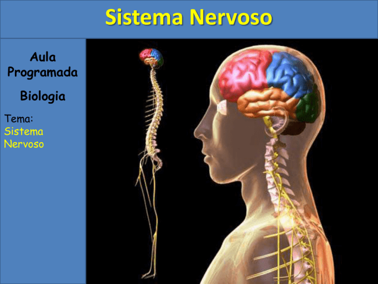 Sistema Nervoso Aula Programada Biologia Tema: Sistema Nervoso Sistema Nervoso 1) Introdução O sistema nervoso é responsável pelo ajustamento do organismo ao ambiente. Sua função é perceber e identificar as condições ambientais externas, bem como as condições reinantes dentro do próprio corpo e elaborar respostas que adaptem a essas condições. 2) Organização do sistema nervoso humano Cérebro Encéfalo Sistema Nervoso Central (SNC) Cerebelo Mesencéfalo Tronco Encefálico Ponte Bulbo Medula Sistema Nervoso Periférico (SNP) Nervos cranianos (12 pares) Nervos raquidianos (31 pares) Terminações nervosas Sistema Nervoso 3) Sistema nervoso central (SNC) a) Encéfalo Possui cerca de 1,4 kg nos adultos Está localizado na caixa craniana Dividido em 3 partes: cérebro, cerebelo e tronco encefálico Encéfalo cérebro cerebelo Tronco encefálico Sistema Nervoso 3) Sistema nervoso central (SNC) a) Encéfalo I) Cérebro Constitui cerca de 90% da massa encefálica Sua superfície é bastante pregueada (aumento da superfície) Dividido em dois hemisférios (esquerdo e direito) Dividido em duas partes: o Córtex (externo) – substância cinzenta (corpos neuronais) o Região interna – substância branca (dendritos e axônios) Sistema Nervoso 3) Sistema nervoso central (SNC) a) Encéfalo I) Cérebro Funções: o Sensações o Atos conscientes e voluntários (movimentos) o Pensamento o Memória o Inteligência o Aprendizagem o Sentidos Sistema Nervoso 3) Sistema nervoso central (SNC) II) Cerebelo Responsável pelo equilíbrio do corpo Tônus e vigor muscular Orientação espacial Coordenação dos movimentos Cerebelo Sistema Nervoso 3) Sistema nervoso central (SNC) III) Tronco encefálico 3 divisões: Mesencéfalo Ponte Bulbo Mesencéfalo Ponte Bulbo Sistema Nervoso 3) Sistema nervoso central (SNC) III) Tronco encefálico Bulbo o Controle dos batimentos cardíacos o Controle dos movimentos respiratórios o Controle da deglutição (engolir) Bulbo Sistema Nervoso 3) Sistema nervoso central (SNC) b) Medula Espinhal (raque) Cordão cilíndrico que parte da base do encéfalo e percorre toda a coluna vertebral. Aloja-se dentro das perfurações das vértebras. Da medula espinhal partem 31 pares de nervos raquidianos Sistema Nervoso 3) Sistema nervoso central (SNC) b) Medula Espinhal (raque) Funções da medula o Recebe as informações de diversas partes do corpo e as enviam para o encéfalo e vice-versa. o Responsável pelos atos reflexos (reflexo medular). Sistema Nervoso 3) Sistema nervoso central (SNC) b) Medula Espinhal (raque) Reflexo Medular A medula espinhal é capaz de elaborar respostas rápidas em situações de emergência, sem a interferência do encéfalo. Sistema Nervoso 3) Sistema nervoso central (SNC) c) Meninges São três (SNC). o o o delicadas membranas que revestem e protegem o sistema nervoso central Dura-máter Aracnóide Pia-máter Medula espinhal Encéfalo Sistema Nervoso 4) Sistema nervoso periférico (SNP) Divisão do sistema nervoso periférico Sistema Nervoso Voluntário (somático) Ações conscientes: andar, falar, pensar, movimentar um braço, etc. Sistema Nervoso Autônomo (visceral) Ações inconscientes: controle da Simpático digestão, batimentos cardíacos, Parassimpático movimento das vísceras, etc. Sistema Nervoso 4) Sistema nervoso periférico (SNP) a) Sistema Nervoso Voluntário (Somático) Formado por nervos motores que conduzem impulsos do sistema nervoso central (SNC) à musculatura estriada esquelética. Determina ações conscientes: Andar, falar, abraçar, correr, etc. SNC Corpos celulares dentro do SNC Axônios controlando a musculatura esquelética Sistema Nervoso 4) Sistema nervoso periférico (SNP) b) Sistema Nervoso Autônomo É dividido em duas partes: I. Simpático II. Parassimpático Sistema Nervoso Simpático: Prepara o organismo para o estresse (instinto de fuga ou luta) Sistema Nervos Parassimpático: Estimula atividades relaxantes (repouso) Ações antagônicas no organismo! Sistema Nervoso Exercícios Sistema Nervoso 1) (VUNESP) Quando uma pessoa encosta a mão em um ferro quente, ela reage imediatamente por meio de um reflexo. Neste reflexo o neurônio efetuador (motor) leva o impulso nervoso para: a) a medula espinhal. b) o encéfalo. c) os músculos flexores do braço d) as terminações sensoriais de calor na ponta dos dedos. e) as terminações sensoriais de dor na ponta dos dedos. Resposta: C 2) Se o cerebelo de um rato for destruído, ele perderá a capacidade de: a) digerir alimentos. b) respirar. c) andar. d) eliminar excretas e) produzir anticorpos. Resposta: C Sistema Nervoso 3) Assinale a alternativa que apresenta de forma correta, a condução do impulso nervoso nos neurônios sensorial e motor. a) O estímulo nervoso se propaga do dendrito para o corpo celular e deste para o axônio no neurônio sensorial, e o inverso no neurônio motor. b) O estímulo nervoso se propaga do axônio para o corpo celular e deste para o dendrito no neurônio sensorial, e o inverso no neurônio motor. c) O estímulo nervoso se propaga do dendrito para o corpo celular e deste para o axônio no neurônio sensorial e no neurônio motor. d) O estímulo nervoso se propaga do axônio para o corpo celular e deste para o dendrito, tanto no neurônio sensorial como no motor. e) O estímulo nervoso se propaga do dendrito para o corpo celular ou do corpo celular para o dendrito no neurônio sensorial e do corpo celular para o axônio no neurônio motor. Resposta: C Sistema Nervoso 4) Dos sistemas abaixo relacionados, qual está subordinado ao sistema nervoso vegetativo ou autônomo? a) sistema muscular estriado. b) sistema ósseo. c) todo o sistema de revestimento. d) sistema ósteo-articular e) sistema glandular. Resposta: e 5) Considere os seguintes elementos do sistema nervoso: I- encéfalo II- medula III- nervos cranianos IV- nervos raquidianos O sistema nervoso central é constituído por: a) II e III b) III e IV c) I e II d) I e III e) I