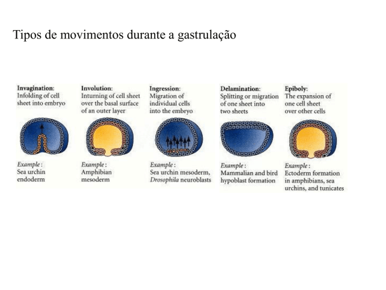 Tipos de movimentos durante a gastrulação Epitélio Polarizado Membrana basal Transição Epitélio-Mesenquimal Gastrulação: Ectoderma Mesoderma Endoderma Larsen, Human Embriology, 6th Ed. Células troco embrionárias Mesoderma Músculo Sangue Endoderma Pulmão Pâncreas Ectoderma Pele Neurônios Gastrulação: Ectoderma Mesoderma Endoderma Larsen, Human Embriology, 6th Ed. Notocorda Larsen, Human Embriology, 6th Ed. Ectoderma Mesoderma Endoderme X Notocorda Sistema nervoso Somitos Desenvolvimento Regulatório Blastóporo http://worms.zoology.wisc.edu/frogs/fert/subcortrot/grescres.html http://worms.zoology.wisc.edu/frogs/fert/subcortrot/corrot.html Blastóporo De Robertis, MOD 2009 Eixo Dorso-Ventral De Robertis Cell 2008 Eixo Ântero-Posterior De Robertis Cell 2008 Drosophila melanogaster Desenvolvimento sincicial Blitz Development 2003 Schmidt Development 1995