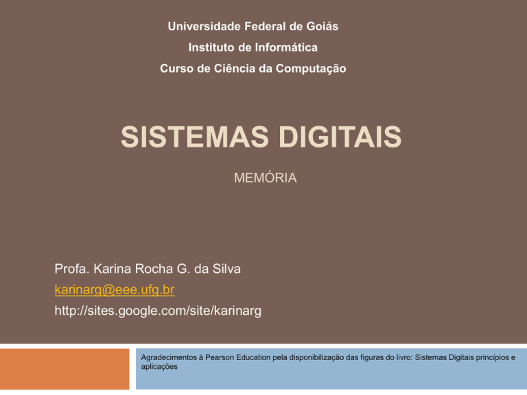 Universidade Federal de Goiás Instituto de Informática Curso de Ciência da Computação SISTEMAS DIGITAIS MEMÓRIA Profa. Karina Rocha G. da Silva [email protected] http://sites.google.com/site/karinarg Agradecimentos à Pearson Education pela disponibilização das figuras do livro: Sistemas Digitais princípios e aplicações Conexões CPU-Memória 2 A memória principal de um computador é construída com Cis de RAMs e ROMs São interfaceados com a CPU por 3 grupos de linhas de sinais ou barramentos. Profa. Dra. Karina Rocha G. da Silva - Universidade Federal de Goiás 31/05/2017 Conexões CPU-Memória 3 Linhas de endereço ou barramento de endereço Linhas de dados ou barramentos de dados Linhas de controle ou barramentos de controle Profa. Dra. Karina Rocha G. da Silva - Universidade Federal de Goiás 31/05/2017 Conexões CPU-Memória 4 Cada barramento consiste de diversas linhas O número de linhas varia de um computador para o outro Os três barramentos são fundamentais para permitir que a CPU escreva doados na memória e leia dados da memória Profa. Dra. Karina Rocha G. da Silva - Universidade Federal de Goiás 31/05/2017 Conexões CPU-Memória 5 Quando um computador está executando instruções de um programa: A CPU busca (lê) informações da área de memória que contêm as instruções do programa A CPU busca (lê) dados sobre os quais as operações são realizadas A CPU armazena dados em posições da memória conforme instruções do programa Profa. Dra. Karina Rocha G. da Silva - Universidade Federal de Goiás 31/05/2017 Operação de escrita 6 Operação de escrita A CPU fornece o endereço binário da posição da memória em que o dado será armazenado. Coloca esse endereço nas linhas de barramento de endereço A CPU coloca os dados a serem armazenados no barramento de dados A CPU ativa as linhas de controle para a operação de escrita na memória Os Cis da memória decodificam o endereço binário para determinar o local de escrita Os dados são colocados na posição da memória Profa. Dra. Karina Rocha G. da Silva - Universidade Federal de Goiás 31/05/2017 Operação de leitura 7 Operação de leitura A CPU fornece o endereço binário na posição que o dado deve ser recuperado Coloca o endereço no barramento de endereço CPU ativa as linhas de controle apropriadas para a operação de leitura Os Cis da memória decodificam o endereço binário para determinar a posição para a leitura Colocam o dado no barramento de dados e os transfere para a CPU Profa. Dra. Karina Rocha G. da Silva - Universidade Federal de Goiás 31/05/2017 Função de cada barramento 8 Função de cada barramento: Barramento de endereço: Unidirecional Transporta as saídas binárias de endereço da CPU para os CIS de memória para selecionar uma posição de memória Barranebto de dados: Barramento bidirecional Transporta dados entre a CPU eos Cis de memória Profa. Dra. Karina Rocha G. da Silva - Universidade Federal de Goiás 31/05/2017 Função de cada barramento 9 Função de cada barramento: Barramento Transporta de controle sinais de controle da CPU para os Cis de memória Exemplo: sinais de R/W Profa. Dra. Karina Rocha G. da Silva - Universidade Federal de Goiás 31/05/2017 Memória apenas de leitura 10 Memória apenas de leitura Projetada para manter os dados que são permanentes ou que não mudam com frequencia Durante operações normais nenhum novo dado pode ser escrito na ROM, mas podem ser lidos dela Algumas ROMs devem ser gravadas durante o processo de fabricação Algumas RAMs podem ser gravadas eletricamente O processo de inserção de dados é chamado de programação ou queima da ROM Profa. Dra. Karina Rocha G. da Silva - Universidade Federal de Goiás 31/05/2017 Memória apenas de leitura 11 Algumas ROMs não podem ter seus dados alterados uma vez que eles tenham sido programados Algumas ROMs podem ser apagadas ou reprogramadas tantas vezes quanto desejado O principal uso de uma Rom é para o armazenamento de dados de um microcomputador Como a ROM não é volátil, esses dados não se perdem quando a energia elétrica é desligada Profa. Dra. Karina Rocha G. da Silva - Universidade Federal de Goiás 31/05/2017 Memória apenas de leitura 12 Quando o computador é desligado ele pode iniciar imediatamente a execução do programa armazenado na ROM As ROMs também são usadas em equipamentos como: Caixas registradoras Aparelhos e sistemas de segurança Profa. Dra. Karina Rocha G. da Silva - Universidade Federal de Goiás 31/05/2017 Diagrama em bloco de uma ROM 13 Diagrama de bloco de uma ROM Possui 3 conjuntos de sinais: entrada de endereço, entrada de controle e saída de dados Essa ROM armazena 16 palavras Saída da ROM permite a conexão de vários Cis de ROM no mesmo barramento de dados para expansão da memória. Profa. Dra. Karina Rocha G. da Silva - Universidade Federal de Goiás 31/05/2017 Diagrama em bloco de uma ROM 14 Profa. Dra. Karina Rocha G. da Silva - Universidade Federal de Goiás 31/05/2017 Diagrama em bloco de uma ROM 15 A entrada de controle CS é a entrada de seleção de chip (chip select) Essa entrada habilita e desabilita as saídas da ROM Pode ser chamada de CE (chip enable), OE (output enable) Profa. Dra. Karina Rocha G. da Silva - Universidade Federal de Goiás 31/05/2017 Operação de leitura 16 Para ler uma palavra precisamos fazer: Aplicar a entrada de endereço apropriada Ativar as entradas de controle Profa. Dra. Karina Rocha G. da Silva - Universidade Federal de Goiás 31/05/2017 Arquitetura da ROM 17 A arquitetura (estrutura) interna do CI de uma ROM é complexa Existem 4 partes básicas: Matriz de registradores Decodificador de linhas Decodificador de colunas Buffers de saídas Profa. Dra. Karina Rocha G. da Silva - Universidade Federal de Goiás 31/05/2017 Arquitetura da ROM 18 Profa. Dra. Karina Rocha G. da Silva - Universidade Federal de Goiás 31/05/2017 Matriz de registradores 19 Armazena os dados que são programados na ROM 
