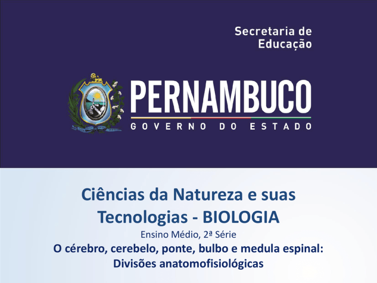 Ciências da Natureza e suas Tecnologias - BIOLOGIA Ensino Médio, 2ª Série O cérebro, cerebelo, ponte, bulbo e medula espinal: Divisões anatomofisiológicas COMPONENTE CURRICULAR, Série Tópico O cérebro, cerebelo, ponte, bulbo e medula espinal cérebro bulbo medula Imagem: Brain bulbar region / Patrick Lynch, medical illustrator / Creative Commons Attribution 2.5 Generic cerebelo O cérebro • O cérebro é a maior e mais evidente estrutura do encéfalo, constituindo cerca de 80% da massa total deste. • Compõe-se do telencéfalo e do diencéfalo. O telencéfalo é a parte mais desenvolvida do encéfalo humano, constituindo entre 85% e 90% da massa encefálica do crânio. Sua superfície é intensamente pregueada, marcada por sulcos e depressões, que definem os giros cerebrais. • O cérebro está dividido em duas metades, os hemisférios cerebrais esquerdo e direito, interligados entre si pelo corpo caloso, situado na parte inferior da fissura inter-hemisférica. • Cada hemisfério possui uma fina camada externa de substância cinzenta – o córtex cerebral, que contém os corpos celulares dos neurônios. • Situada debaixo do córtex cerebral está uma abundante camada de substância branca, contendo feixes de axônios neuronais mielinizados, que lhe conferem a aparência branca. • Os hemisférios cerebrais estão divididos em quatro lobos cerebrais: lobo frontal, temporal, parietal e occipital, cada um com funções específicas a desempenhar. Sulco central Lobo frontal Lobo parietal Lobo occiptal Sulco lateral Lobo temporal Imagem: Brain diagram / Mysid / Public Domain Cerebelo Lobo Frontal • No lobo frontal, localizado na parte da frente do cérebro (testa), acontece o planejamento de ações e movimentos, bem como o pensamento abstrato. Nele estão incluídos o córtex motor e o córtex pré-frontal. • O córtex motor controla e coordena a motricidade voluntária, sendo que o córtex motor do hemisfério direito controla o lado esquerdo do corpo do indivíduo, enquanto que o do hemisfério esquerdo controla o lado direito. Um trauma nesta área pode causar fraqueza muscular ou paralisia. • A aprendizagem motora e os movimentos de precisão são executados pelo córtex pré-motor, que fica mais ativo do que o restante do cérebro quando se imagina um movimento sem executá-lo. Lesões nesta área não chegam a comprometer a ponto de o indivíduo sofrer uma paralisia ou problemas para planejar ou agir, no entanto, a velocidade de movimentos automáticos, como a fala e os gestos, é perturbada (1). • A atividade no lobo frontal de um indivíduo aumenta somente quando este se depara com uma tarefa difícil em que ele terá que descobrir uma sequência de ações que minimize o número de manipulações necessárias para resolvê-la. A decisão de quais sequências de movimento ativar e em que ordem, além de avaliar o resultado, é feito pelo córtex-frontal, localizado na parte da frente do lobo frontal. Suas funções incluem o pensamento abstrato e criativo, a fluência do pensamento e da linguagem, respostas afetivas e capacidade para ligações emocionais, julgamento social, vontade e determinação para ação e atenção seletiva. Lesões nesta região fazem com que o indivíduo fique preso obstinadamente a estratégias que não funcionam ou que não consigam desenvolver uma sequência de ações correta (2). Lobos Occipitais • Localizados na parte inferior do cérebro e cobertos pelo córtex cerebral, os lobos occipitais processam os estímulos visuais, daí também serem conhecidos por córtex visual. Possuem várias subáreas que processam os dados visuais recebidos do exterior depois de estes terem passado pelo tálamo, uma vez que há zonas especializadas a visão da cor, do movimento, da profundidade, da distância e assim por diante. Depois de passarem por esta área, chamada área visual primária, essas informações são direcionadas para a área de visão secundária, onde são comparadas com dados anteriores, permitindo assim o indivíduo identificar, por exemplo, um gato, uma moto ou uma maçã. O significado do que vemos, porém, é dado por outras áreas do cérebro, que se comunicam com a área visual, considerando as experiências passadas e nossas expectativas. Isso faz com que o mesmo objeto não seja percepcionado da mesma forma por diferentes indivíduos. Quando essa área sofre uma lesão provoca a impossibilidade de reconhecer objetos, palavras e até mesmo rostos de pessoas conhecidas ou de familiares. Esta deficiência é conhecida como agnosia (3). Lobos Temporais • Na zona localizada acima das orelhas e com a função principal de processar os estímulos auditivos, encontram-se os lobos temporais. Como acontece nos lobos occipitais, as informações são processadas por associação. Quando a área auditiva primária é estimulada, os sons são produzidos e enviados à área auditiva secundária, que interage com outras zonas do cérebro, atribuindo um significado e assim permitindo ao indivíduo reconhecer o que está ouvindo (4). Lobos Parietais • Na região superior do cérebro temos os lobos parietais, constituídos por duas subdivisões, a anterior e a posterior. A primeira, também chamada de córtex somatossensorial, tem a função de possibilitar a percepção de sensações como o tato, a dor e o calor. Por ser a área responsável em receber os estímulos obtidos com o ambiente exterior, representa todas as áreas do corpo humano. É a zona mais sensível, logo ocupa mais espaço do que a zona posterior, uma vez que tem mais dados a serem interpretados, captados pelos lábios, língua e garganta. A zona posterior é uma área secundária e analisa, interpreta e integra as informações recebidas pela anterior, que é a zona primária, permitindo ao indivíduo se localizar no espaço, reconhecer objetos através do tato etc. (5) Lobo frontal Imagem: Brain diagram / Mysid / Public Domain Funções superiores Tom