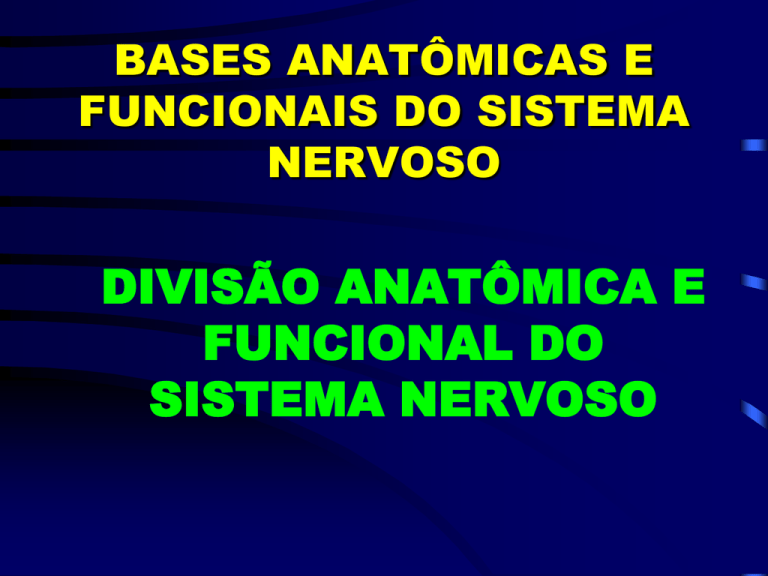 BASES ANATÔMICAS E FUNCIONAIS DO SISTEMA NERVOSO DIVISÃO ANATÔMICA E FUNCIONAL DO SISTEMA NERVOSO TECIDO NERVOSO É compreendido por dois tipos de células: ⇨ Neurônios ⇨ Células Gliais (Neuroglias) TECIDO NERVOSO Neurônio: unidade fundamental do tecido nervoso Função: receber processar enviar informações TECIDO NERVOSO Neuroglia: células que ocupam os espaços entre os neurônios Função: Sustentação Revestimento ou isolamento Modulação da atividade neuronal Defesa TECIDO NERVOSO - Neurônios ⇛ São células que se comunicam entre si ou com células musculares e secretoras através de linguagem elétrica (modificação de potencial de membrana). ⇛ A maioria dos neurônios possui três regiões: corpo celular dendrito (dédron = árvore) axônio (áxon = eixo) Vesículas Sinápticas NEURÔNIO - Corpo Celular ⇛ Contém núcleo e citoplasma ⇛ É o centro metabólico do neurônio ⇛ Responsável pela síntese de todas as proteínas neuronais, e pela maioria dos processos de degradação e renovação dos constituintes celulares NEURÔNIO - Dendritos ⇛ São curtos e ramificam-se como galhos de árvore, originando dendritos menores ⇛ São especializados em receber estímulos, traduzindo-os em alterações do potencial da membrana ⇛ Os potenciais propagam-se em direção ao corpo celular e, neste, em direção ao axônio NEURÔNIO - Axônio ⇛ Prolongamento longo e fino, originado do corpo ou de um dendrito principal ⇛ Apresenta comprimento variável (alguns milímetros a um metro) ⇛ É especializado em gerar e conduzir o potencial de ação (estímulo nervoso) ⇛ Os axônios, geralmente sofrem arborização terminal, através desta, estabelecem conexões com outros neurônios ou com células efetuadoras NEURÔNIOS CLASSIFICAÇÃO DOS NEURÔNIOS QUANTO AOS SEUS PROLONGAMENTOS Multipolares: vários dendritos e um axônio Bipolares: dois prolongamentos deixam o corpo celular, um dendrito e um axônio. Neurônios bipolares da retina e do gânglio espiral do ouvido interno Pseudo-unipolares: corpos celulares se localizam nos gânglios sensitivos, apenas um prolongamento deixa o corpo celular, dividindo-se como um T, dois ramos periférico ( terminação nervosa sensitiva) e central (SNC) * Raros nos vertebrados, neurônios desprovidos de axônios são as células amácrinas da retina NEURÔNIOS - Sinapses ⇛ Os neurônios, principalmente através de suas terminações axônicas, entram em contato com outros neurônios, passando-lhes informações ⇛ Os locais de tais contatos são denominados sinapses ou sinapses interneuronais NEURÔNIOS - Sinapses NEURÔNIOS - Sinapses ⇛ Os axônios podem relacionar-se também com células não neuronais ou efetuadoras (musculares) e células secretoras (glândulas salivares, por exemplo). Estes contatos são chamados de sinapses neuroefetuadoras e junções neuroefetuadoras ⇛ Funcionamento e morfologia: há dois tipos de sinapses, as elétricas e as químicas NEURÔNIOS - Sinapses SINAPSES ELÉTRICAS Raras em vertebrados e exclusivamente interneuronais As sinapses elétricas não são polarizadas, ou seja, a comunicação entre os neurônios envolvidos se faz nos dois sentidos NEURÔNIOS - Sinapses SINAPSES QUÍMICAS A grande maioria das sinapses interneuronais e todas as neuroefetuadoras são sinapses químicas, ou seja, a comunicação entre os elementos em contato depende da liberação de substância química, denominada neurotransmissor NEURÔNIOS - Sinapses TIPOS DE NEUROTRANSMISSORES: Acetilcolina Aminoácidos: glicina, glutamato, aspartato,ácido gama-amino-butírico ou GABA Monoaminas: dopamina, noradrenalina, adrenalina, serotonina e histamina Peptídeos: substância P (neurônios sensitivos) e os opióides (grupo química da morfina – endorfina e encefalinas) TECIDO NERVOSO - Fibras Nervosas Compreende um axônio e, quando presentes, seus envoltórios de origem glial. O principal envoltório das fibras nervosas é a bainha de mielina, que funciona como isolante elétrico. TECIDO NERVOSO - Fibras Nervosas ⇛ Quando envolvidos por bainha de mielina, os axônios são denominados fibras nervosas mielínicas ⇛ Na ausência de mielina denominam-se fibras nervosas amielínicas ⇛ Ambos os tipos ocorrem tanto no sistema nervoso central como no periférico, sendo a bainha de mielina formada por células de Schwann, no periférico, e por oligodendrócitos, no central. TECIDO NERVOSO - Fibras Nervosas ⇛ As áreas de fibras nervosas mielínicas são denominadas substância branca. ⇛ A neuroglia onde se concentram os corpos dos neurônios é denominada substância cinzenta, com base em sua cor in vivo. TECIDO NERVOSO - Fibras Nervosas ⇛ No sistema nervoso central, as fibras nervosas reúnem-se em feixes denominados tractos ou fascículos ⇛ No sistema nervoso periférico também agrupam-se em feixes, formando os nervos Neurônio de Associação Constituem a grande maioria dos neurônios existentes no Sistema Nervoso Central, fazem ligações entre os hemisférios e áreas cerebrais NEURÔNIO AFERENTE OU SENSITIVO Estes neurônios carregam mensagens de todos os receptores do corpo para o Sistema Nervoso Central sobre as modificações ocorridas no meio interno e externo Essas mensagens chamam-se impulsos nervosos NEURÔNIO MOTOR Leva mensagens, chamadas impulsos nervosos, do Sistema Nervoso Central para os órgãos ou músculos que respondem ao movimento. Como o Sistema Nervoso Trabalha O Sistema Nervoso coordena as atividades corporais garantindo que estas partes trabalhem de forma eficiente. Informações sobre mudanças são levadas pelos neurônios sensoriais para os neurônios de conexão no SNC. No Sistema Nervoso Central a informação é processada e impulsos nervosos são levados pelos neurônios motores para o corpo. Receptores Sensitivos Neur. Sensitivo Interneurônios Músculos Neurônio motor DIVISÃO ANATÔMICA DO SISTEMA NERVOSO cérebro encéfalo cerebelo tronco encefálico S.N.C medula es