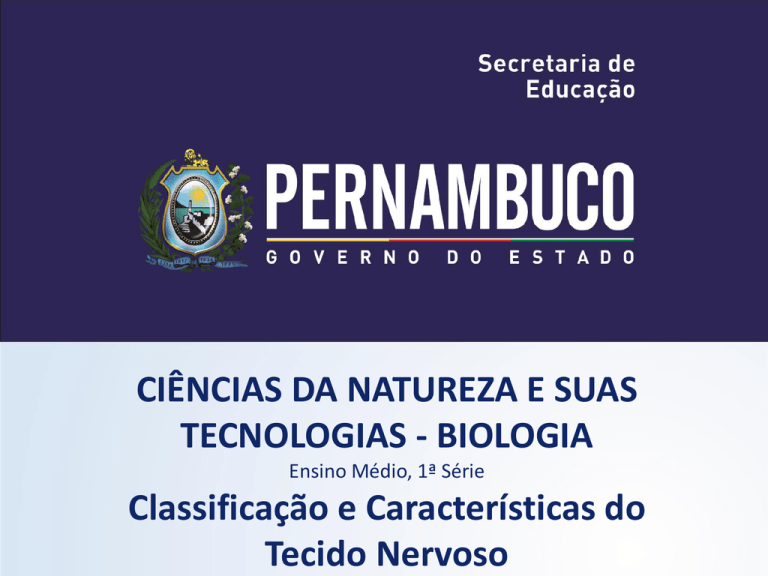 CIÊNCIAS DA NATUREZA E SUAS TECNOLOGIAS - BIOLOGIA Ensino Médio, 1ª Série Classificação e Características do Tecido Nervoso BIOLOGIA, Série 1º ANO Classificação e Características do Tecido Nervoso CARACTERÍSTICAS GERAIS TRANSMISSÃO DE IMPULSOS NERVOSOS RELAÇÃO DIRETA COM O SISTEMA ENDÓCRINO BIOLOGIA, Série 1º ANO Classificação e Características do Tecido Nervoso Organização do Sistema Nervoso Humano Divisão Partes Sistema Nervoso Central (SNC) Encéfalo e Medula Espinhal Sistema Nervoso Periférico (SNP) Nervos e gânglios Funções Gerais Processamento e Integração de informações Condução de informações entre órgão receptores de estímulos, o SNC e órgãos efetores (músculos, por ex.) BIOLOGIA, Série 1º ANO Classificação e Características do Tecido Nervoso Células do Tecido Nervoso ======= NEURÔNIO ====== Estrutura => Corpo celular, prolongamentos (maior e menores) Imagem: Mariana Ruiz, traduzida por Lijealso / Public Domain 4 ESTRUTURA BÁSICA DO NEURÔNIO Imagem: EugeneZelenko / Public Domain BIOLOGIA, Série 1º ANO Classificação e Características do Tecido Nervoso Árvore Dendrítica Neurônio Piramidal Córtex Cerebral Célula de Purkinje Córtex Cerebelar Imagem: Gray's Anatomy / Public Domain BIOLOGIA, Série 1º ANO Classificação e Características do Tecido Nervoso ======= NEURÔNIO ====== ===== direção do impulso nervoso ====== Imagem: Otago Polytechnic / Creative Commons Attribution 3.0 Unported 7 BIOLOGIA, Série 1º ANO Classificação e Características do Tecido Nervoso ======= NEURÔNIO ====== ===== MIELINA===== Imagem: LadyofHats / Public Domain 8 BIOLOGIA, Série 1º ANO Classificação e Características do Tecido Nervoso ======= NEURÔNIO ====== Imagem: NickGorton / Creative Commons Attribution-Share Alike 3.0 Unported ======NÓDULOS DE RANVIER====== 9 BIOLOGIA, Série 1º ANO Classificação e Características do Tecido Nervoso TIPOS DE NEURÔNIOS BIOLOGIA, Série 1º ANO Classificação e Características do Tecido Nervoso MULTIPOLARES: APRESENTAM UM ÚNICO AXÔNIO E VÁRIOS DENDRITOS BIPOLARES: APRESENTAM UM ÚNICO AXÔNIO E UM ÚNICO DENDRITO PSEUDOUNIPOLARES: APRESENTAM UM ÚNICO AXÔNIO COM UMA SÓ NEUROFIBRA BIOLOGIA, Série 1º ANO Classificação e Características do Tecido Nervoso UNIPOLAR BIPOLAR Dendritos Direção do impulso Direção do impulso Terminal axônico PSEUDO-UNIPOLAR MULTIPOLAR Direção do impulso Terminal axônico Direção do impulso Terminal axônico Imagem: Juoj8 / 1: Unipolar neuron 2: Bipolar neuron 3: Multipolar neuron 4: Pseudounipolar neuron / Creative Commons Attribution-Share Alike 3.0 Unported BIOLOGIA, Série 1º ANO Classificação e Características do Tecido Nervoso === NEURÔNIOS=== Quanto à posição NEURÔNIO AFERENTE Conduz o impulso nervoso do receptor para o SNC. Responsável por levar informações da superfície do corpo para o interior. Relaciona o meio interno com o meio externo. NEURÔNIO EFERENTE Conduz o impulso nervoso do SNC ao efetuador (músculo ou glândula). NEURÔNIO INTERNUNCIAL OU DE ASSOCIAÇÃO Faz a união entre os dois tipos anteriores. O corpo celular deste está sempre dentro do SNC (1). 13 Imagem: SEE-PE, redesenhado a partir de imagem de Autor Desconhecido. BIOLOGIA, Série 1º ANO Classificação e Características do Tecido Nervoso Imagem: SEE-PE, redesenhado a partir de imagem de Autor Desconhecido. BIOLOGIA, Série 1º ANO Classificação e Características do Tecido Nervoso GLIÓCITOS OU GLIAIS PROTEGEM, ENVOLVEM E NUTREM OS NEURÔNIOS TIPOS ASTRÓCITOS GLIÓCITOS DE MAIOR TAMANHO COM GRANDE QT DE PROLONGAMENTOS CITOPLASMÁTICOS. DÃO SUSTENTAÇÃO FÍSICA AO TECIDO NERVOSO. BIOLOGIA, Série 1º ANO Classificação e Características do Tecido Nervoso Imagem: Jdifool / GNU Free Documentation License CÉLULAS DA GLIA 16 BIOLOGIA, Série 1º ANO Classificação e Características do Tecido Nervoso OLIGODENDRÓCITOS GLIÓCITOS DE MENOR TAMANHO COM MENORAIOR TAMANHO COM PEQUENA QT DE PROLONGAMENTOS CITOPLASMÁTICOS. Imagem: Aceofhearts1968 / 1.)Ependymocites, 2.)Neurons, 3.)Axons, 4.)Oligodendrocyte, 5.)Astrocyte, 6.)Myelination, 7.)Microglial cell, 8.)Capilary / Public Domain FORMAM A BAINHA DE MIELINA BIOLOGIA, Série 1º ANO Classificação e Características do Tecido Nervoso MICRÓGLIAS SÃO MACRÓFAGOS QUE FAGOCITAM DENTRITOS E RESTOS CELULARES DO TECIDO NERVOSO APRESENTAM PEQUENA QUANTIDADE DE PROLONGAMENTOS CITOPLASMÁTICOS. CÉLULA DE SCHAWNN GLIÓCITOS PRESENTES NO SNP. PROTEGEM A BAINHA DE MIELINA. BIOLOGIA, Série 1º ANO Classificação e Características do Tecido Nervoso NEUROFIBRAS MIELINIZADAS APRESENTAM BAINHA DE MIELINA AUMENTAM A VELOCIDADE DE PROPAGAÇÃO DE IMPULSOS NERVOSOS APRESENTAM O NÓDULOS DE RANVIER ESCLEROSE MÚLTIPLA DEGENERAÇÃO GRADUAL DO ESTRATO MIELÍNICO BIOLOGIA, Série 1º ANO Classificação e Características do Tecido Nervoso NEUROFIBRAS NÃO MIELINIZADAS NÃO APRESENTAM BAINHA DE MIELINA DIMINUEM A VELOCIDADE DE PROPAGAÇÃO DE IMPULSOS NERVOSOS BIOLOGIA, Série 1º ANO Classificação e Características do Tecido Nervoso SINAPSES São pontos de união entre as células nervosas e entre estas e as células efetoras (Músculo ou Glândula). Imagem: Nrets / GNU Free Documentation License Imagem: Looie496 created file, US National Institutes of Health, National Institute on Aging created original / Public Domain 21 BIOLOGIA, Série 1º ANO Classificação e Características do Tecido Nervoso EVENTOS ELÉTRICOS NA CÉLULA NERVOSA POTENCIAL DE REPOUSO É o potencial de membrana antes que ocorra a excitação da célula nervosa. É o potencial gerado pela bomba de Na+ e K+ que joga 3 Na+ para fora e 2 K+ para dentro contra os seus gradientes de concentração => -75 mV Na+ K+ ATP ADP Pi 22 BIOLOGIA, Série 1º ANO Classificação e Características do Tecido Nervoso EVENTOS ELÉTRICOS NA CÉLULA NERVOSA POTENCIAL DE AÇÃO DESPOLARIZAÇÃO HIPERPOLARIZAÇÃO Imagem: Medicina82 / GNU Free Documentation Lice