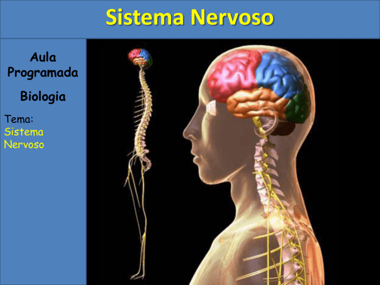 Sistema Nervoso Aula Programada Biologia Tema: Sistema Nervoso Sistema Nervoso 1) Introdução O sistema nervoso é responsável pelo ajustamento do organismo ao ambiente. Sua função é perceber e identificar as condições ambientais externas, bem como as condições reinantes dentro do próprio corpo e elaborar respostas que adaptem a essas condições. 2) Organização do sistema nervoso humano Cérebro Encéfalo Sistema Nervoso Central (SNC) Cerebelo Mesencéfalo Tronco Encefálico Ponte Bulbo Medula Sistema Nervoso Periférico (SNP) Nervos cranianos (12 pares) Nervos raquidianos (31 pares) Terminações nervosas Sistema Nervoso 3) Sistema nervoso central (SNC) a) Encéfalo Possui cerca de 1,4 kg nos adultos Está localizado na caixa craniana Dividido em 3 partes: cérebro, cerebelo e tronco encefálico Encéfalo cérebro cerebelo Tronco encefálico Sistema Nervoso 3) Sistema nervoso central (SNC) a) Encéfalo I) Cérebro Constitui cerca de 90% da massa encefálica Sua superfície é bastante pregueada (aumento da superfície) Dividido em dois hemisférios (esquerdo e direito) Dividido em duas partes: o Córtex (externo) – substância cinzenta (corpos neuronais) o Região interna – substância branca (dendritos e axônios) Sistema Nervoso 3) Sistema nervoso central (SNC) a) Encéfalo I) Cérebro Funções: o Sensações o Atos conscientes e voluntários (movimentos) o Pensamento o Memória o Inteligência o Aprendizagem o Sentidos o Equilíbrio Sistema Nervoso 3) Sistema nervoso central (SNC) a) Encéfalo I) Cérebro Tálamo e Hipotálamo (presentes na região inferior do cérebro) Tálamo o Reorganização dos estímulos nervosos o Percepção sensorial (consciência) Hipotálamo o Regulador da homeostase corporal o Temperatura o Apetite o Balanço hídrico o Controle da hipófise e outras glândulas Sistema Nervoso 3) Sistema nervoso central (SNC) I) Cérebro Tálamo e Hipotálamo Tálamo Hipotálamo Sistema Nervoso 3) Sistema nervoso central (SNC) II) Cerebelo Responsável pelo equilíbrio do corpo Tônus e vigor muscular Orientação espacial Coordenação dos movimentos Cerebelo Exercícios: Exercícios (UFG – 2006) Um chimpanzé com lesão no cerebelo tem comprometida a sua capacidade de (A)Mastigar e engolir os alimentos (B)Equilibrar-se sobre os galhos de árvores. (C)Enxegar a fêmea para o acasalmento. (D)Ouvir o som dos predadores. (E)Sentir o odor dos feromômios. Sistema Nervoso 3) Sistema nervoso central (SNC) III) Tronco encefálico 3 divisões: Mesencéfalo Ponte Bulbo Mesencéfalo Ponte Bulbo Sistema Nervoso 3) Sistema nervoso central (SNC) III) Tronco encefálico Mesencéfalo o Recepção e coordenação da contração muscular o Postura corporal Mesencéfalo Sistema Nervoso 3) Sistema nervoso central (SNC) III) Tronco encefálico Ponte o Manutenção da postura corporal, equilíbrio do corpo e tônus muscular. Ponte Sistema Nervoso 3) Sistema nervoso central (SNC) III) Tronco encefálico Bulbo o Controle dos batimentos cardíacos o Controle dos movimentos respiratórios o Controle da deglutição (engolir) Bulbo Sistema Nervoso 3) Sistema nervoso central (SNC) b) Medula Espinhal (raque) Cordão cilíndrico que parte da base do encéfalo e percorre toda a coluna vertebral. Aloja-se dentro das perfurações das vértebras. Da medula espinhal partem 31 pares de nervos raquidianos Sistema Nervoso 3) Sistema nervoso central (SNC) b) Medula Espinhal (raque) Funções da medula o Recebe as informações de diversas partes do corpo e as enviam para o encéfalo e vice-versa. o Responsável pelos atos reflexos (reflexo medular). Sistema Nervoso 3) Sistema nervoso central (SNC) b) Medula Espinhal (raque) Reflexo Medular A medula espinhal é capaz de elaborar respostas rápidas em situações de emergência, sem a interferência do encéfalo. Sistema Nervoso 3) Sistema nervoso central (SNC) c) Meninges São três (SNC). o o o delicadas membranas que revestem e protegem o sistema nervoso central Dura-máter Aracnóide Pia-máter Medula espinhal Encéfalo Sistema Nervoso 4) Sistema nervoso periférico (SNP) Constituído por: a) Nervos b) Gânglios nervosos c) Terminações nervosas (receptores para dor, tato, frio, pressão, calor, paladar, etc.). Nervos São fios finos formados por vários axônios de neurônios envolvidos por tecido conjuntivo. Transmitem mensagens de várias partes do corpo para o sistema nervoso central ou destes para as regiões corporais. Sistema Nervoso 4) Sistema nervoso periférico (SNP) Classificação dos nervos I) Quanto ao tipo de neurônio Sensitivos ou aferentes (contém apenas neurônios sensitivos) Motores ou eferentes (contém apenas neurônios motores) Mistos (contém neurônios sensitivos e motores) II) Quanto à posição anatômica Cranianos (ligados ao encéfalo) – 12 pares Raquidianos ou espinhais (ligados à medula) – 31 pares Sistema Nervoso 4) Sistema nervoso periférico (SNP) Gânglios nervosos o Aglomerado de corpos celulares de neurônios encontrados fora do sistema nervoso central. Corpos celulares Sistema Nervoso 4) Sistema nervoso periférico (SNP) Divisão do sistema nervoso periférico Sistema Nervoso Voluntário (somático) Ações conscientes: andar, falar, pensar, movimentar um braço, etc. Sistema Nervoso Autônomo (visceral) Ações inconscientes: controle da Simpático digestão, batimentos cardíacos, Parassimpático movimento das vísceras, etc. Sistema Nervoso 4) Sistema nervoso periférico (SNP) Terminações Nervosas Captam estímulos do meio interno ou externo e os levam para o sistema nervoso central. Sistema Nervoso 4) Sistema nervoso periférico (SNP) a) Sistema Nervoso Voluntário (Somático) Formado por nervos motores que conduzem impulsos do sistema nervoso central (SNC) à musculatura estriada esquelética. Determina ações conscientes: Andar, falar, abraçar, correr, etc. SNC Corpos celulares dentro do SNC Axônios controlando a musculatura esquelética Sistema Nervoso 4) Sistema nervoso perifé