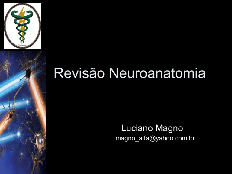 Revisão Neuroanatomia Luciano Magno [email protected] Neurociência DIVISÃO DO SISTEMA NERVOSO Sistema Nervoso Central cérebro encéfalo cerebelo tronco encefálico mesencéfalo ponte bulbo medula espinhal Sistema Nervoso Periférico aula 01 nervos espinhais cranianos gânglios terminações nervosas Prof.: Luciano Magno Neurociência DIVISÃO FUNCIONAL DO SISTEMA NERVOSO sistema nervoso somático aferente eferente aferente sistema nervoso visceral aula 01 simpático eferente = SN autônomo parassimpático Prof.: Luciano Magno Neurociência DIVISÃO DO SISTEMA NERVOSO aula 01 Prof.: Luciano Magno Neurociência ENCÉFALO aula 01 Prof.: Luciano Magno Neurociência ENCÉFALO • Cérebro • Cerebelo • Tronco Encefálico aula 01 Prof.: Luciano Magno Neurociência Cérebro Telencéfalo e Diencéfalo Telencéfalo É dividido em dois hemisférios cerebrais bastante desenvolvidos. Nestes, situam-se as sedes da memória e dos nervos sensitivos e motores. SULCOS GIRUS LOBOS aula 01 Prof.: Luciano Magno Neurociência Cérebro Telencéfalo e Diencéfalo SULCOS GIRUS LOBOS aula 01 Prof.: Luciano Magno Neurociência Cérebro Telencéfalo e Diencéfalo SULCOS GIRUS LOBOS Á R E A S aula 01 Prof.: Luciano Magno Neurociência Cérebro Telencéfalo e Diencéfalo SULCOS GIRUS LOBOS F U N Ç Õ E S aula 01 Prof.: Luciano Magno Neurociência Cérebro Telencéfalo e Diencéfalo Corpo Caloso, Fórnix e Septo Pelúcido aula 01 Prof.: Luciano Magno Neurociência Cérebro Telencéfalo e Diencéfalo Corpo Caloso, Fórnix e Septo Pelúcido aula 01 Prof.: Luciano Magno Neurociência Cérebro Telencéfalo e Diencéfalo SUBSTÂNCIA CINZENTA E BRANCA A região superficial do telencéfalo, que acomoda bilhões de corpos celulares de neurônios (substância cinzenta), constitui o córtex cerebral, formado a partir da fusão das partes superficiais telencefálicas e diencefálicas. O córtex recobre um grande centro medular branco, formado por fibras axonais (substância branca). aula 01 Prof.: Luciano Magno Neurociência NÚCLEOS (GÂNGLIOS) DA BASE Em meio ao centro branco (nas profundezas do telencéfalo), há agrupamentos de corpos celulares neuronais que formam os núcleos (gânglios) da base ou núcleos (gânglios) basais. CAUDATO PUTAMEN GLOBO PÁLIDO envolvidos em conjunto, no controle do movimento NÚCLEO SUBTALÂMICO aula 01 Prof.: Luciano Magno Neurociência NÚCLEOS (GÂNGLIOS) DA BASE aula 01 Prof.: Luciano Magno Neurociência NÚCLEOS (GÂNGLIOS) DA BASE Parece que os gânglios da base participam também de um grande número de circuitos paralelos, sendo apenas alguns poucos de função motora. Outros circuitos estão envolvidos em certos aspectos da memória e da função cognitiva. aula 01 Prof.: Luciano Magno Neurociência NÚCLEOS (GÂNGLIOS) DA BASE 1. Núcleo Caudato: controla movimentos intencionais grosseiros do corpo (isso ocorre a nível sub-consciente e consciente) e auxilia no controle global dos movimentos do corpo. 2. Putamen: funciona em conjunto com o núcleo caudato no controle de movimentos intencionais grosseiros. Ambos os núcleos funcionam em associação com o córtex motor, para controlar diversos padrões de movimento. aula 01 Prof.: Luciano Magno Neurociência NÚCLEOS (GÂNGLIOS) DA BASE 3. Globo Pálido: provavelmente controla a posição das principais partes do corpo, quando uma pessoa inicia um movimento complexo, Isto é, se uma pessoa deseja executar uma função precisa com uma de suas mãos, deve primeiro colocar seu corpo numa posição apropriada e, então, contrair a musculatura do braço. Acredita-se que essas funções sejam iniciadas, principalmente, pelo globo pálido. 4. Núcleo Subtalâmico e áreas associadas: controlam possivelmente os movimentos da marcha e talvez outros tipos de motilidade grosseira do corpo. aula 01 Prof.: Luciano Magno Neurociência Cérebro Telencéfalo e Diencéfalo Diencéfalo Compreende as seguintes partes: tálamo, hipotálomo, epitálamo e subtálamo, todas em relação com o III ventrículo. aula 01 Prof.: Luciano Magno Neurociência Cérebro Telencéfalo e Diencéfalo TÁLAMO São duas massas volumosas de substância cinzenta, de forma ovóide, dispostas uma de cada lado, na porção látero-dorsal do diencéfalo. Todas as mensagens sensoriais, com exceção das provenientes dos receptores do olfato, passam pelo tálamo antes de atingir o córtex cerebral. aula 01 Prof.: Luciano Magno Neurociência Cérebro Telencéfalo e Diencéfalo TÁLAMO Esta é uma região de substância cinzenta localizada entre o tronco encefálico e o cérebro. O tálamo atua como estação retransmissora de impulsos nervosos para o córtex cerebral. Ele é responsável pela condução dos impulsos às regiões apropriadas do cérebro onde eles devem ser processados. O tálamo também está relacionado com alterações no comportamento emocional; que decorre, não só da própria atividade, mas também de conexões com outras estruturas do sistema límbico (que regula as emoções). aula 01 Prof.: Luciano Magno Neurociência Cérebro Telencéfalo e Diencéfalo HIPOTÁLAMO O hipotálamo, também constituído por substância cinzenta, é o principal centro integrador das atividades dos órgãos viscerais, sendo um dos principais responsáveis pela homeostase corporal. Ele faz ligação entre o sistema nervoso e o sistema endócrino, atuando na ativação de diversas glândulas endócrinas. É o hipotálamo que controla a temperatura corporal, regula o apetite e o balanço de água no corpo, o sono e está envolvido na emoção e no comportamento sexual. aula 01 Prof.: Luciano Magno Neurociência Cérebro Telencéfalo e Diencéfalo HIPOTÁLAMO Tem amplas conexões com as demais áreas do prosencéfalo e com o mesencéfalo. Aceita-se que o hipotálamo desempenha, ainda, um papel nas emoções. Especificamente, as partes laterais parecem envolvidas com o prazer e a raiva, enquanto que a porção mediana parece mais ligada à aversão, ao desprazer e à tendên