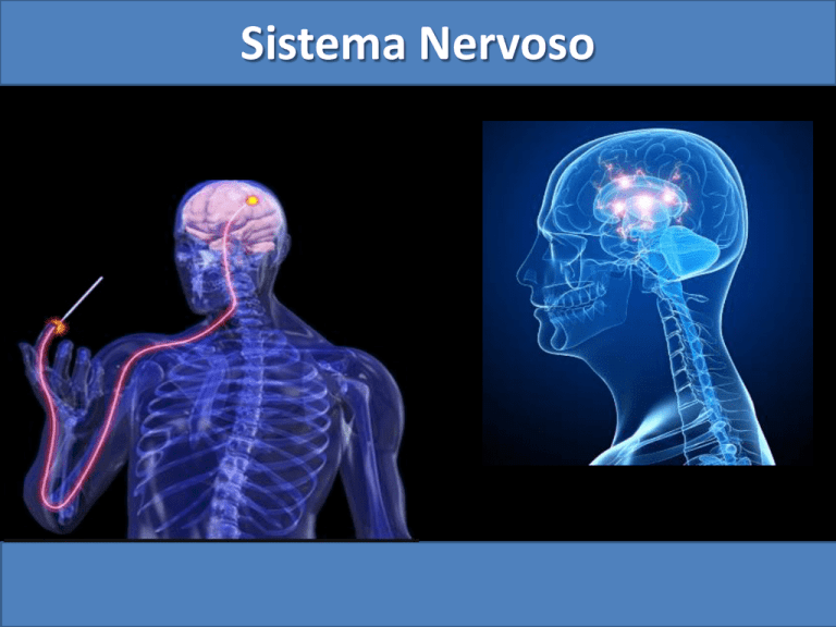 Sistema Nervoso Sistema Nervoso O sistema nervoso é responsável pelo ajustamento do organismo ao ambiente. Sua função é perceber e identificar as condições ambientais externas, bem como as condições reinantes dentro do próprio corpo e elaborar respostas que adaptem a essas condições. Sistema Nervoso Organização do sistema nervoso humano Sistema Nervoso Organização do sistema nervoso humano Cérebro Encéfalo Sistema Nervoso Central (SNC) Cerebelo Mesencéfalo Tronco Encefálico Ponte Bulbo Medula Sistema Nervoso Sistema nervoso central (SNC) – O encéfalo. Possui cerca de 1,4 kg nos adultos Está localizado na caixa craniana Dividido em 3 partes: cérebro, cerebelo e tronco encefálico Encéfalo Sistema Nervoso Sistema nervoso central (SNC) – O Cérebro Constitui cerca de 90% da massa encefálica Sua superfície é bastante pregueada (aumento da superfície) Dividido em dois hemisférios (esquerdo e direito) Dividido em duas partes: o Córtex (externo) – substância cinzenta (corpos neuronais) o Região interna – substância branca (dendritos e axônios) Sistema Nervoso Sistema nervoso central (SNC) – O cérebro. Funções: Sensações; Atos conscientes e voluntários (movimentos); Pensamento Memória; Inteligência; Aprendizagem; Sentidos e Equilíbrio. Sistema Nervoso Sistema nervoso central (SNC) - O Cérebro Função do Tálamo Reorganização dos estímulos nervosos Percepção sensorial (consciência) Função do Hipotálamo: Regulador da homeostase corporal Balanço hídrico e Temperatura Apetite Controle da hipófise e outras glândulas Sistema Nervoso Sistema nervoso central (SNC) – O Cerebelo Responsável pelo equilíbrio do corpo Tônus e vigor muscular Orientação espacial Coordenação dos movimentos Sistema Nervoso Sistema nervoso central (SNC) - O Tronco encefálico 3 divisões: Mesencéfalo Ponte Bulbo Mesencéfalo Ponte Bulbo Sistema Nervoso Sistema nervoso central (SNC) – Tronco encefálico. Mesencéfalo Recepção e coordenação da contração muscular Postura corporal Ponte Manutenção da postura corporal, equilíbrio do corpo e tônus muscular. Bulbo Controle dos batimentos cardíacos Controle dos movimentos respiratórios Controle da deglutição (engolir) Sistema Nervoso Sistema nervoso central (SNC) – Medula Espinhal (raque) Cordão cilíndrico que parte da base do encéfalo e percorre toda a coluna vertebral. Aloja-se dentro das perfurações das vértebras. Funções da medula Recebe as informações de diversas partes do corpo e as enviam para o encéfalo e vice-versa. Responsável pelos atos reflexos (reflexo medular). Sistema Nervoso Sistema nervoso central (SNC) - Reflexo Medular A medula espinhal é capaz de elaborar respostas rápidas em situações de emergência, sem a interferência do encéfalo. Sistema Nervoso Sistema Nervoso Periférico (SNP) Nervos cranianos (12 pares) Nervos raquidianos (31 pares) Terminações nervosas Sistema Nervoso Sistema nervoso periférico (SNP) Constituído por: a) Nervos b) Gânglios nervosos c) Terminações nervosas (receptores para dor, tato, frio, pressão, calor, paladar, etc.). Nervos São fios finos formados por vários axônios de neurônios envolvidos por tecido conjuntivo. Transmitem mensagens de várias partes do corpo para o sistema nervoso central ou destes para as regiões corporais. Sistema Nervoso Sistema nervoso periférico (SNP) Classificação dos nervos I) Quanto ao tipo de neurônio Sensitivos ou aferentes (contém apenas neurônios sensitivos) Motores ou eferentes (contém apenas neurônios motores) Mistos (contém neurônios sensitivos e motores) II) Quanto à posição anatômica Cranianos (ligados ao encéfalo) – 12 pares Raquidianos ou espinhais (ligados à medula) – 31 pares Sistema Nervoso Sistema nervoso periférico (SNP) Gânglios nervosos Aglomerado de corpos celulares de neurônios encontrados fora do sistema nervo central. Corpos celulares Sistema Nervoso Sistema nervoso periférico (SNP) Terminações Nervosas Captam estímulos do meio interno ou externo e os levam para o sistema nervoso central. Sistema Nervoso Sistema nervoso periférico (SNP) Divisão do sistema nervoso periférico Sistema Nervoso Voluntário (somático) Ações conscientes: andar, falar, pensar, movimentar um braço, etc. Sistema Nervoso Autônomo (visceral) Ações inconscientes: controle da Simpático digestão, batimentos cardíacos, Parassimpático movimento das vísceras, etc. Sistema Nervoso Sistema nervoso periférico (SNP) Diferenças entre os sistemas nervosos simpático e parassimpático: Sistema Nervoso Autônomo Simpático Parassimpático Fibra pré-ganglionar curta longa Fibra pós-ganglionar longa curta Origem dos nervos Região torácica e lombar da medula (somente nervos raquidianos) Região cervical (nervos cranianos) e região sacral da medula (nervos raquidianos) Mediador químico Fibras pré-ganglionares: Acetilcolina Fibras pós-ganglionares: Adrenalina Fibras pré-ganglionares: Acetilcolina Fibras pós-ganglionares: Acetilcolina Sistema Nervoso Sistema nervoso periférico (SNP) a) Sistema Nervoso Voluntário (Somático) Formado por nervos motores que conduzem impulsos do sistema nervoso central (SNC) à musculatura estriada esquelética. Determina ações conscientes: Andar, falar, abraçar, correr, etc. SNC Corpos celulares dentro do SNC Axônios controlando a musculatura esquelética Sistema Nervoso Sistema nervoso periférico (SNP) b) Sistema Nervoso Autônomo (vegetativo ou visceral) Constituído por nervos motores que conduzem impulsos do sistema nervoso central à musculatura lisa de órgãos viscerais, músculos cardíacos e glândulas. Realiza o controle da digestão, sistema cardiovascular, excretor e endócrino. Os nervos do SNP autônomo possuem dois tipos de neurônios: I. Pré-ganglionares (corpo celular dentro do SNC) II. Pós-ganglionares (Corpo celular dentro do gânglio) órgão gânglio SNC Neurônio Pré-ganglionar Neurônio Pós-ganglionar