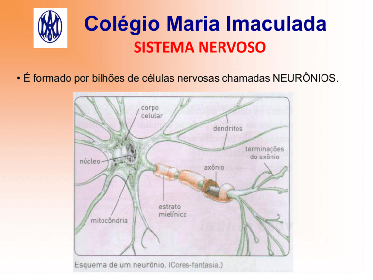 Colégio Maria Imaculada SISTEMA NERVOSO • É formado por bilhões de células nervosas chamadas NEURÔNIOS. Colégio Maria Imaculada SISTEMA NERVOSO • Os neurônios conduzem i.n através de neurotransmissores e as conexões estabelecidas chamam-se SINAPSES. • O sentido de propagação do i.n no neurônio é: dendritos celular axônio. corpo • Tal sistema funciona como uma grande rede de comunicações,em que as mensagens têm a forma de sinais químicos e elétricos. • Pode ser comparado a uma rede telefônica com a CENTRAL(que recebe chamadas e realiza ligações)e os FIOS(que conduzem as mensagens e as respostas). Colégio Maria Imaculada SISTEMA NERVOSO CENTRAL FIOS S.N.Central S.N.Periférico encéfalo medula espinal conjunto dos nervos OBS.: Há também o S.N. Visceral que integra as atividades de nossas vísceras(estômago,intestino,coração). Colégio Maria Imaculada SISTEMA NERVOSO S.N.CENTRAL É dividido em 2 partes: • Encéfalo situado no crânio é formado pelo cérebro,cerebelo,ponte ou protuberância e bulbo. • Medula Espinal localizada no canal vertebral. Colégio Maria Imaculada SISTEMA NERVOSO 1)ENCÉFALO a) Cérebro: Contém os centros nervosos relacionados com os sentidos, memória, pensamento e a inteligência. Coordena as ações voluntárias e os atos inconscientes. É dividido em duas partes ou hemisférios(direito e esquerdo). Apresenta reentrâncias e saliências denominadas CIRCUNVOLUÇÕES CEREBRAIS. Camada externa do cérebro é chamada de CÓRTEX CEREBRAL formada por uma substância cinzenta e a parte interna formada por uma substância branca. Colégio Maria Imaculada SISTEMA NERVOSO Colégio Maria Imaculada SISTEMA NERVOSO b) Cerebelo: Localização: abaixo do cérebro Funções: - coordena os movimentos orientados pelo cérebro; - dá o tônus muscular (regula o grau de contração); - mantém o equilíbrio do corpo (mantém ligações com os canais semicirculares da orelha interna); c) Ponte ou Protuberância Localização: abaixo do cérebro,diante do cerebelo e acima do bulbo Funções: - passagem de i.n que vão ao cérebro - reflexos associados às emoções(riso/lágrimas) d) Bulbo Localização: abaixo da ponte Funções: respiração,ritmo dos batimentos cardíacos e certos atos reflexos como deglutição,vômito,tosse etc. Colégio Maria Imaculada SISTEMA NERVOSO 2) MEDULA ESPINAL Forma:cordão com aproximadamente 40cm de comprimento Localização:ocupa o canal vertebral desde a 1ª vértebra até o nível da 2ª vértebra lombar Funções:centro nervoso dos atos involuntários e condutora de i.n OBS: Da medula partem 31 pares de nervos que se ramificam, conectando-se com as várias partes do corpo,recebendo mensagens de vários pontos e enviando-as para o cérebro e recebendo mensagens do cérebro e transmitindo-as para as várias partes do corpo. Colégio Maria Imaculada SISTEMA NERVOSO Meninges: - Membranas que envolvem o encéfalo e a medula - São três: dura-máter: membrana externa, que fica em contato com os ossos pia-máter: membrana interna, que envolve diretamente os órgãos aracnóide: membrana intermediária entre as duas OBS:Entre a pia-máter e a aracnóide existe um líquido ”CEFALORRAQUIDIANO” que protege os órgãos do S.N.Central contra choques mecânicos Colégio Maria Imaculada SISTEMA NERVOSO S.N. PERIFÉRICO Formação: nervos encarregados de fazer as ligações entre o S.N.C e o corpo NERVO é a reunião de várias fibras nervosas,que podem ser formadas de axônios ou de dendritos As FIBRAS estão reunidas em pequenos feixes;cada feixe forma um nervo; em nosso corpo existe uma REDE NERVOSA Colégio Maria Imaculada SISTEMA NERVOSO Tipos de NERVOS São classificados em três grupos: - Sensitivos: conduzem i.n de um órgão receptor de estímulos até o S.N.C - Motores: conduzem i.n do S.N.C até um órgão efetor(músculos e glândulas),que realizará a ação - Mistos: possuem ao mesmo tempo fibras nervosas sensitivas e motoras OBS: • NERVOS CRANIANOS: são aqueles que se ligam ao Encéfalo, formam 12 pares (cada nervo é formado por uma raiz motora e outra sensitiva) • NERVOS RAQUIDIANOS ou ESPINAIS: são aqueles que se ligam a Medula Espinal,formam 31 pares(todos eles são nervos mistos) Colégio Maria Imaculada SISTEMA NERVOSO S.N. AUTÔNOMO Formação: Nervos que funcionam independentemente da nossa vontade; estão ligados principalmente aos órgãos dos sistemas digestório, respiratório, circulatório e excretor. Partes: - S.N. Simpático (formado por nervos que saem da região dorsal e lombar da medula) - S.N. Parassimpático (formado por nervos que saem do encéfalo e da região sacral da medula) OBS: Os nervos desses sistemas geralmente produzem efeitos contrários entre si Colégio Maria Imaculada SISTEMA NERVOSO ATOS REFLEXOS São movimentos involuntários. Ex: Encostar a mão em um ferro quente Etapas de um Reflexo 1º) estímulo produzido na pele 2º) recepção por terminações nervosas 3º) condução para uma raiz sensitiva até a medula 4º) através de uma raiz motora a medula envia uma ordem ao músculo do braço,determinando que ele entre em ação:o braço então se contrai em uma fração de segundos Colégio Maria Imaculada SISTEMA NERVOSO