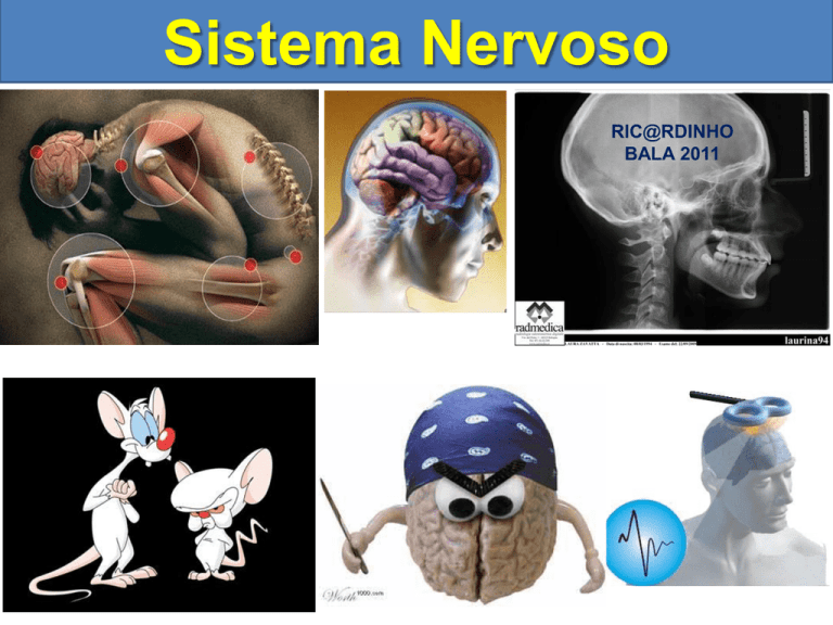 Sistema Nervoso RIC@RDINHO BALA 2011 Sistema Nervoso Eu você Sistema Nervoso Eu você Sistema Nervoso Eu Eu você você Sistema Nervoso Funções do Sistema Nervoso - Permite a percepção do meio ambiente - Associar e interpretar informações - Elabora respostas aos estímulos recebidos - Ordenar ações - Memória - Ligado ao Sistema Endócrino Sistema Nervoso Neurônio - Unidade morfológica e fisiológica do Sistema Nervoso - Formado por dendritos, corpo celular e axônio - Bainha de mielina: capa lipídica originada pelas células de Schwann ↑ velocidade do impulso Sistema Nervoso Neurônio - Unidade morfológica e fisiológica do Sistema Nervoso - Formado por dendritos, corpo celular e axônio - Bainha de mielina: capa lipídica originada pelas células de Schwann ↑ velocidade do impulso Sistema Nervoso Neurônio - Unidade morfológica e fisiológica do Sistema Nervoso - Formado por dendritos, corpo celular e axônio - Bainha de mielina: capa lipídica originada pelas células de Schwann ↑ velocidade do impulso Sistema Nervoso Corpo celular – núcleo e maioria das organelas citoplasmáticas Dendritos – ramificações do corpo celular. Função: captar estímulos Nódulo de Ranvier – regiões do axônio não recobertas por bainha Bainha de Mielina – células de Schwann que se enrolam no axônio. Isolante elétrico Axônio – maior prolongamento. Presença de vesículas com neurotransmissores na porção terminal Sistema Nervoso Neurônio Sistema Nervoso Tipos de neurônios Neurônios Sensoriais (Aferentes) - Recebem os estímulos e os levam até o cérebro ou medula espinhal Neurônios de Associação - Transmitem os impulsos dos aferente até o Sistema Nervoso Central - Importantes na comunicação entre os neurônios motores Neurônios Efetuadores (Eferentes) - leva o impulso do cérebro até o órgão efetor (ex: músculo - placa motora) - leva o impulso da medula espinal até órgão (Arco Reflexo) Sistema Nervoso Sinapse - Pontos de comunicação entre as células nervosas - Não há contato físico - O impulso nervoso passa através de neurotransmissores - Ex: acetilcolina Sistema Nervoso Sinapse - Pontos de comunicação entre as células nervosas - Não há contato físico - O impulso nervoso passa através de neurotransmissores - Ex: acetilcolina Sistema Nervoso Sinapse - Pontos de comunicação entre as células nervosas - Não há contato físico - O impulso nervoso passa através de neurotransmissores - Ex: acetilcolina Sistema Nervoso Sinapse Sistema Nervoso Organização do Sistema Nervoso Central (SNC) Encéfalo e medula espinal Sistema Nervoso Somático Periférico (SNP) Autônomo Simpático Parassimpático Sistema Nervoso Sistema Nervoso Central - Formado pelo encéfalo e medula espinal - Encéfalo (crânio), medula espinal (coluna vertebral) - Se liga às várias regiões do corpo através do SNP Sistema Nervoso Sistema Nervoso Central - Formado pelo encéfalo e medula espinal - Encéfalo (crânio), medula espinal (coluna vertebral) - Se liga às várias regiões do corpo através do SNP Sistema Nervoso Sistema Nervoso Central - Formado pelo encéfalo e medula espinal - Encéfalo (crânio), medula espinal (coluna vertebral) - Se liga às várias regiões do corpo através do SNP Sistema Nervoso Sistema Nervoso Central Processamento e integração de informação - Formado pelo encéfalo e medula espinal - Encéfalo (crânio), medula espinal (coluna vertebral) - Se liga às várias regiões do corpo através do SNP Sistema Nervoso Funções do Sistema Nervoso Central ENCÉFALO receber estímulos dos órgãos sensoriais enviar respostas a órgãos motores Sistema Nervoso Regiões do Sistema Nervoso Central - Bulbo - Ponte - Cerebelo - Tálamo - Hipotálamo - Cérebro - Hipocampo Sistema Nervoso Regiões do Sistema Nervoso Central - Bulbo - Ponte - Cerebelo - Tálamo - Hipotálamo - Cérebro - Hipocampo Sistema Nervoso Cérebro - Principal órgão do Sistema Nervoso - Local onde inicia todas as ações voluntárias do indivíduo - 100 bilhões de neurônios - Proteções: caixa craniana e meninges Sistema Nervoso Cérebro - Principal órgão do Sistema Nervoso - Local onde inicia todas as ações voluntárias do indivíduo - 100 bilhões de neurônios - Proteções: caixa craniana e meninges Sistema Nervoso Cérebro Sistema Nervoso Meninges - Dura-máter, aracnóide e pia-máter Sistema Nervoso Meninges - Dura-máter, aracnóide e pia-máter Sistema Nervoso Meninges - Dura-máter, aracnóide e pia-máter Líquido Cefalorraquidiano (Liquor) Sistema Nervoso Medula Espinal - Se aloja na coluna vertebral - 1 a 1,5 cm de diâmetro - Protegida também pelas meninges e pelo líquor Sistema Nervoso Medula Espinal - Se aloja na coluna vertebral - 1 a 1,5 cm de diâmetro - Protegida também pelas meninges e pelo líquor Sistema Nervoso Medula Espinal - Se aloja na coluna vertebral - 1 a 1,5 cm de diâmetro - Protegida também pelas meninges e pelo líquor - Função: ESTAÇÃO RETRANSMISSORA Recebe informações do corpo Conduz as informações ao cérebro Sistema Nervoso Medula Espinal Sistema Nervoso Respostas Reflexas Medulares - Respostas elaboradas diretamente pela medula - Sem interferência cerebral - Vantagem: ↑ na velocidade de resposta (defesa do organismo) Sistema Nervoso Respostas Reflexas Medulares - Respostas elaboradas diretamente pela medula - Sem interferência cerebral - Vantagem: ↑ na velocidade de resposta (defesa do organismo) - Ex: reflexo patelar, espetar o dedo, chapa quente, tosse, espirro Sistema Nervoso Respostas Reflexas Medulares Trajeto Sistema Nervoso Respostas Reflexas Medulares Trajeto Neurônios Sensitivos Medula Neurônios Efetores Músculos Sistema Nervoso Impulso Nervoso - Limiar de excitação: é o mínimo para desencadear um potencial de ação - Lei do Tudo ou Nada: estímulos acima de um determinado limiar geram impulsos com velocidades máximas Potencial de Repouso - Não há descargas elétricas - O impulso não e