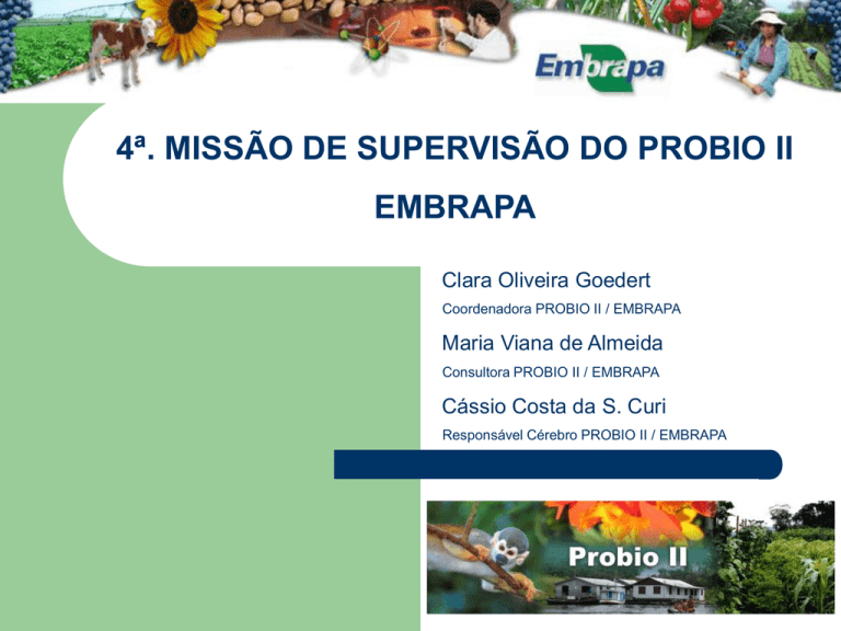 4ª. MISSÃO DE SUPERVISÃO DO PROBIO II EMBRAPA Clara Oliveira Goedert Coordenadora PROBIO II / EMBRAPA Maria Viana de Almeida Consultora PROBIO II / EMBRAPA Cássio Costa da S. Curi Responsável Cérebro PROBIO II / EMBRAPA DIFICULDADES OPERACIONAIS DE GESTÃO DO PROBIO II NA EMBRAPA CONTRATAÇÃO DOS BOLSISTA DIFICULDADES OPERACIONAIS DE GESTÃO DO PROBIO II NA EMBRAPA UCP Falta de orientação dos novos procedimentos e critérios adotados pela UCP (detalhamento de insumos, etc); Demora na resposta definitiva ou andamento de pedidos de não objeção (Shopping 001/2010 CPAO); Falta de Informação sobre os padrões de valores e nomenclaturas utilizados no Cérebro; DIFICULDADES OPERACIONAIS DE GESTÃO DO PROBIO II NA EMBRAPA UCP Falta de orientação dos novos procedimentos e critérios adotados pela UCP (detalhamento de insumos, etc); Demora na resposta definitiva ou andamento de pedidos de não objeção (Shopping 001/2010 CPAO); Falta de Informação sobre os padrões de valores e nomenclaturas utilizados no Cérebro; DIFICULDADES OPERACIONAIS DE GESTÃO DO PROBIO II NA EMBRAPA DIFICULDADES OPERACIONAIS DE GESTÃO DO PROBIO II NA EMBRAPA UCP Falta de orientação dos novos procedimentos e critérios adotados pela UCP (detalhamento de insumos, etc); Demora na resposta definitiva ou andamento de pedidos de não objeção (Shopping 001/2010 CPAO); Falta de Informação sobre os padrões de valores e nomenclaturas utilizados no Cérebro; DIFICULDADES OPERACIONAIS DE GESTÃO DO PROBIO II NA EMBRAPA DIFICULDADES OPERACIONAIS DE GESTÃO DO PROBIO II NA EMBRAPA DIFICULDADES OPERACIONAIS DE GESTÃO DO PROBIO II NA EMBRAPA DIFICULDADES OPERACIONAIS DE GESTÃO DO PROBIO II NA EMBRAPA DIFICULDADES OPERACIONAIS DE GESTÃO DO PROBIO II NA EMBRAPA DIFICULDADES OPERACIONAIS DE GESTÃO DO PROBIO II NA EMBRAPA DIFICULDADES OPERACIONAIS DE GESTÃO DO PROBIO II NA EMBRAPA DIFICULDADES OPERACIONAIS DE GESTÃO DO PROBIO II NA EMBRAPA UCP Falta de orientação dos novos procedimentos e critérios adotados pela UCP (detalhamento de insumos, etc); Demora na resposta definitiva ou andamento de pedidos de não objeção (Shopping 001/2010 CPAO); Falta de Informação sobre os padrões de valores e nomenclaturas utilizados no Cérebro (diárias, etc); DIFICULDADES OPERACIONAIS DE GESTÃO DO PROBIO II NA EMBRAPA DIFICULDADES OPERACIONAIS DE GESTÃO DO PROBIO II NA EMBRAPA CAIXA Demora na aprovação dos processos – necessário alterar o cronograma; Troca do número de código da Atividade no POA, na execução do pagamento; Falta de definição com relação ao recolhimento de tributos. DIFICULDADES OPERACIONAIS DE GESTÃO DO PROBIO II NA EMBRAPA CAIXA Demora na aprovação dos processos – necessário alterar o cronograma; Troca do número de código da Atividade no POA, na execução do pagamento; Falta de definição com relação ao recolhimento de tributos. DIFICULDADES OPERACIONAIS DE GESTÃO DO PROBIO II NA EMBRAPA CAIXA Demora na aprovação dos processos – necessário alterar o cronograma; Troca do número de código da Atividade no POA, na execução do pagamento; Falta de definição com relação ao recolhimento de tributos. DIFICULDADES OPERACIONAIS DE GESTÃO DO PROBIO II NA EMBRAPA CAIXA Demora na aprovação dos processos – necessário alterar o cronograma; Troca do número de código da Atividade no POA, na execução do pagamento; Falta de definição com relação ao recolhimento de tributos. DIFICULDADES OPERACIONAIS DE GESTÃO DO PROBIO II NA EMBRAPA CÉREBRO Problemas na migração do SIGMA para o CÉREBRO; Como inserir dados do beneficiário na solicitação de suprimento de fundos; Problemas com a inclusão de dados de estrangeiros nas solicitações de diárias; Dificuldades para encaixar as carreiras da EMBRAPA e os locais de destino nos padrões de diárias existentes no Cérebro; Definição do local para visualizar diárias e suprimentos de fundos após a aprovação; Não é possível responder questionamento da reprovação de insumos no POA, pela UCP; Após o salvamento de insumos no POA, a página retorna ao início DIFICULDADES OPERACIONAIS DE GESTÃO DO PROBIO II NA EMBRAPA CÉREBRO Problemas na migração do SIGMA para o CÉREBRO; Como inserir dados do beneficiário na solicitação de suprimento de fundos; Problemas com a inclusão de dados de estrangeiros nas solicitações de diárias; Dificuldades para encaixar as carreiras da EMBRAPA e os locais de destino nos padrões de diárias existentes no Cérebro; Definição do local para visualizar diárias e suprimentos de fundos após a aprovação; Não é possível responder questionamento da reprovação de insumos no POA, pela UCP; Após o salvamento de insumos no POA, a página retorna ao início DIFICULDADES OPERACIONAIS DE GESTÃO DO PROBIO II NA EMBRAPA CÉREBRO Como inserir dados do beneficiário na solicitação de suprimento de fundos; Problemas com a inclusão de dados de estrangeiros nas solicitações de diárias; Dificuldades para encaixar as carreiras da EMBRAPA e os locais de destino nos padrões de diárias existentes no Cérebro; Definição do local para visualizar diárias e suprimentos de fundos após a aprovação; Não é possível responder questionamento da reprovação de insumos no POA, pela UCP; Após o salvamento de insumos no POA, a página retorna ao início DIFICULDADES OPERACIONAIS DE GESTÃO DO PROBIO II NA EMBRAPA CÉREBRO Problemas na migração do SIGMA para o CÉREBRO; Como inserir dados do beneficiário na solicitação de suprimento de fundos; Problemas com a inclusão de dados de estrangeiros nas solicitações de diárias; Dificuldades para encaixar as carreiras da EMBRAPA e os locais de destino nos padrões de diárias existentes no Cérebro; Definição do local para visualizar diárias e suprimentos de fundos após a aprovação; Não é possível responder questionamento da reprovação de insumos no POA, pela UCP; Após o salvamento de insumos no POA, a página retorna ao