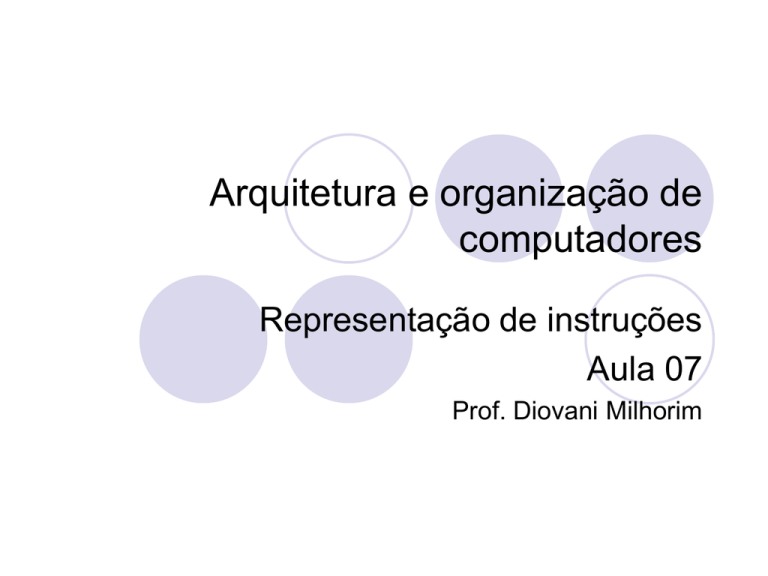 Arquitetura e organização de computadores Representação de instruções Aula 07 Prof. Diovani Milhorim Representação de instruções INSTRUÇÃO DE MÁQUINA Quem executa um programa é o hardware e o que ele espera encontrar é um programa em linguagem de máquina (uma seqüência de instruções de máquina em código binário). Um programa em linguagem de alto nível não pode ser executado diretamente pelo hardware. Representação de instruções INSTRUÇÃO DE MÁQUINA O programa tem que ser transformado (traduzido) para linguagem de máquina por um compilador, antes de ser carregada em memória. Para que o hardware possa executá-lo. A linguagem de máquina é composta de códigos binários, representando instruções, endereços e dados e está totalmente vinculada ao conjunto ("set") de instruções da máquina. Representação de instruções Funcionalmente as operações do computador são: matemáticas (aritméticas, lógicas, de complemento, de deslocamento... movimentação de dados (memória <--> registrador) entrada-saída (leitura e escrita em dispositivos externos - dispositivos de Entrada / Saída) controle (desvio da sequência de execução, parar, etc...) Representação de instruções Exemplo: O conjunto de instruções de alguns processadores, como por exemplo o Intel 8080, não possui instruções para multiplicação ou divisão; portanto, um programa em linguagem de máquina, nestes processadores, não pode fazer multiplicação ou divisão diretamente (somente através de combinação de outras instruções). Já um programa em linguagem de nível mais alto pode implementar comandos de multiplicação (ou divisão) que combinem uma série de instruções binárias do conjunto de instruções para fazer uma multiplicação (ou divisão) através de repetidas somas (subtrações) ou por deslocamento de bits. Representação de instruções Exemplo: Conjunto de instruções Máquina hipotética Representação de instruções Convenções usadas: Representação de instruções Formato das instruções: Código de Operação ou OPCODE - identifica a operação a ser realizada pelo processador. É o campo da instrução cuja valor binário identifica (é o código binário) da operação a ser realizada. Este código é a entrada no decodificador de instruções na unidade de controle. Cada instrução deverá ter um código único que a identifique. Representação de instruções Formato das instruções: Operando(s) - é o campo da instrução cujo valor binário sinaliza a localização do dado (ou é o próprio dado) que será manipulado (processado) pela instrução durante a operação. Representação de instruções Formato das instruções: Em geral, um operando identifica o endereço de memória onde está contido o dado que será manipulado, ou pode conter o endereço onde o resultado da operação será armazenado. Finalmente, um operando pode também indicar um Registrador (que conterá o dado propriamente dito ou um endereço de memória onde está armazenado o dado). Os operandos na verdade fornecem os dados da instrução. Obs: Existem instruções que não tem operando. Ex.: Instrução HALT (PARE). Representação de instruções Formatos de instrução: Há diversos formatos de instruções, com características particulares, vantagens e desvantagens. O conjunto de instruções de uma máquina pode ser constituído por instruções de diversos formatos. Esta flexibilidade permite a escolha da instrução adequada para aplicação em cada caso. Conjunto de instruções pode ser analisado sob alguns aspectos, por exemplo: quantidade de instruções quantidade de operandos modo de endereçamento (próxima aula) Representação de instruções Formatos de instrução: Exemplos Representação de instruções Formatos de instrução: LTR - Linguagem de Transferência entre Registradores (register transfer language) A LTR é utilizada para sinalizar o processamento de uma operação, mostrando o que acontece com os registradores e posições de memória como resultado do processamento de uma instrução. caracteres alfanuméricos significam abreviaturas de nomes de registradores ou posições de memória (ex: REM. MP) parênteses indicam conteúdo, no caso de registradores, ou o valor é um endereço na MP. seta indica atribuição (transferência de conteúdo entre registradores ou entre registrador e memória principal) Representação de instruções Formatos de instrução: LTR - Linguagem de Transferência entre Registradores Exemplo: ·REM <--- (CI) o conteúdo do CI é copiado para o REM ·RDM <--- (MP(REM)) o conteúdo da célula da MP cujo endereço está no REM é copiado para o RDM Representação de instruções TAMANHO (EM BITS) DE UMA INSTRUÇÃO PROBLEMA DE PROJETO: Escolha do tamanho das instruções Da escolha do tamanho das instruções depende : · tamanho da memória · tamanho das células da MP · velocidade de acesso · organização do barramento de dados. Representação de instruções TAMANHO (EM BITS) DE UMA INSTRUÇÃO Basicamente, o projetista decide entre fatores como economia de espaço em memória, processamento mais rápido das instruções ou um conjunto de instruções mais completo e poderoso: Maior Conjunto Instruções --> requer muitas instruções (para atendimento a diferentes aplicações) --->muitos bits por opcode --> requer instruções completas ---> muitos bits para operandos --> requer hardware mais complexo ---> processamento de instruções mais lento Representação de instruções TAMANHO (EM BITS) DE UMA INSTRUÇÃO CÓDIGO DE OPERAÇÃO (OPCODE) O número de bits do código de operação depende de quantas instruções tem o set de instruções da máquina. Ex: um processador com 256 instruções (ou 2^8 instruções) teria necessidade de 8 bits para representar o código de operação. Lembre-se que cada instrução precisa ter o seu código binário! Um processador pode ter suas instruç