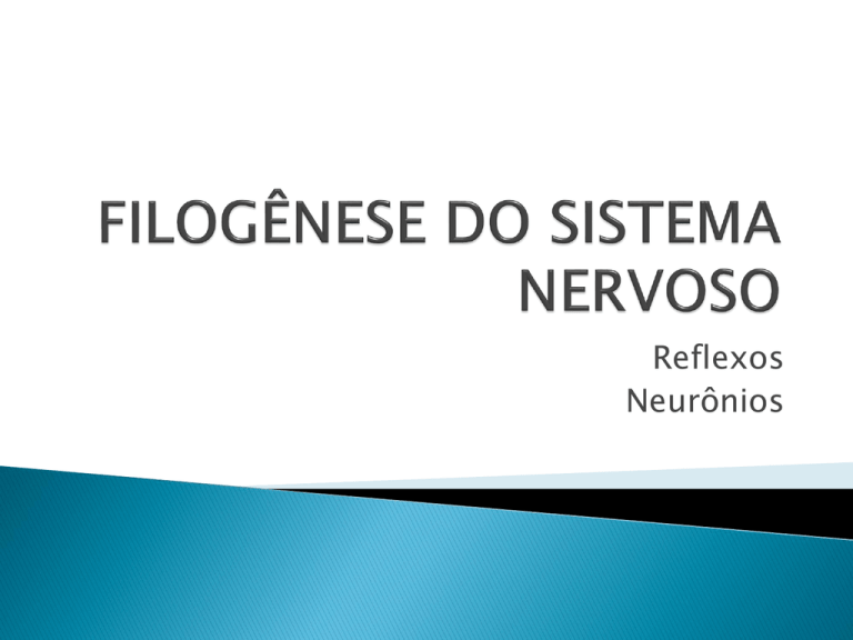 Reflexos Neurônios Os seres vivos, mesmo os mais primitivos, precisam se ajustar continuamente ao meio ambiente para sobreviver. A primeira função do Sistema Nervoso foi adaptar os organismos aos mais diversos tipos de ambientes. Os primeiros neurônios surgiram como células que se diferenciaram das demais para receber estímulos do meio-ambiente, transmitindo-os às células musculares para gerar uma resposta adaptativa. Para que os seres vivos se ajustem continuamente ao meio ambiente são particularmente importantes três propriedades do Protoplasma (substâncias que compõem a célula): ◦ Irritabilidade ◦ Condutibilidade ◦ Contratilidade Irritabilidade – Propriedade de ser sensível a um estímulo. Permite a uma célula detectar as mudanças do meio ambiente. Condutibilidade – Capacidade de conduzir um estímulo através do Protoplasma determinando uma resposta em outra parte da célula. Contratibilidade –Contração – encurtamento da célula visando fugir de um estímulo nocivo. Um organismo unicelular como a AMEBA apresenta estas propriedades do protoplasma. Quando tocada, se afasta rapidamente daquilo que a tocou, porém suas reações são muito rudimentares. Protoplasma Em seres um pouco mais evoluídos, como as ESPONJAS, já se observa a diferenciação do Citoplasma = uma parte especializada em contração e outra parte especializada em irritabilidade e condutibilidade. A irritabilidade é possível mediante um órgão sensorial semelhante ao tato, com receptores sensíveis que realizam o papel de sensação . As células musculares primitivas são encontradas no epitélio que reveste os orifícios que permitem a penetração de água no interior das esponjas. Diferenciação do Citoplasma na ESPONJA Com o aparecimento dos METAZOÁRIOS mais complicados, as células musculares passaram a ocupar posição mais profunda perdendo o contato com o meio externo. Na superfície surgiram células que se diferenciaram para receber os estímulos do meio ambiente, transmitindo-os ás células musculares. Já os primeiros metazoários apresentam suas células nervosas localizadas mais superficialmente atuando como um tato de fato e profundamente as células musculares. As células especializadas em irritabilidade (excitabilidade) e condutibilidade foram os primeiros Neurônios, que provavelmente surgiram nos CELENTERADOS. Os celenterados foram os primeiros organismos a apresentar células nervosas propriamente ditas. Nos celenterados como no tentáculo de uma anemôna do mar, aparecem células nervosas unipolares, com um só prolongamento denominado AXÔNIO, que faz contato com as células musculares situadas mais profundamente. Esquema de um Dispositivo Neuromuscular no tentáculo de um Celenterado. Na extremidade destas células nervosas desenvolveu-se uma formação especial denominada: receptor. O receptor transforma vários estímulos físicos ou químicos em impulsos nervosos, que podem ser transmitidos ao efetuador: músculo ou glândula. O dispositivo neuromuscular no tentáculo de uma anemôna permite respostas apenas locais, nas demais partes do corpo existe uma rede de fibras nervosas, permitindo difusão dos impulsos nervosos em várias direções – Sistema Nervoso Difuso O Sistema Nervoso Difuso foi substituído nos PLATELMINTOS E ANELÍDEOS por um Sistema Nervoso Central – centralização do sistema nervoso. Nos PLATELMINTOS, encontram-se dispositivos nervosos bem mais complexos do que apresentados nos celenterados. No epitélio da superfície do animal existem neurônios, que por meio de seu axônio, estão ligados a outros neurônios, que por sua vez possuem um axônio que faz conexão com os músculos. As células nervosas se ligam diretamente aos músculos efetores de movimento, essa conexão agora existente entre um “Neurônio Sensorial” e um executor de movimentos, torna possível a formação básica de um Arco Reflexo Simples O que representa um grande passo evolutivo. Temos assim o Arco Reflexo Simples Envolve : ◦ Uma sinapse ◦ Neurônios: Sensitivo Motor Axônio do Neurônio Eferente Axônio do Neurônio Aferente Sinapse Os neurônios situados na superfície são especializados em receber os estímulos e conduzir os impulsos ao centro – são denominados: ◦ NEURÔNIOS SENSITIVOS OU AFERENTES. Os neurônios situados no gânglio e especializados em conduzir o impulso do centro até o efetuador (no caso o músculo) – são denominados: ◦ NEURÔNIOS MOTORES OU EFERENTES. Aferentes: neurônios, fibras ou feixes de fibras que trazem impulsos a uma determinada área do sistema nervoso. Refere-se ao que entra no sistema nervoso. Eferentes: neurônios, fibras ou feixes de fibras que levam impulsos de uma determinada área do sistema nervoso. Refere-se ao que sai do sistema nervoso. Em animais segmentados como a minhoca, para que ela possa evitar um estímulo nocivo aplicado em um segmento, pode ser necessário que a resposta se faça em outros segmentos, existindo pois, um terceiro tipo de neurônio. Estes neurônios interligam células nervosas sensoriais a células motoras do segmento e são denominados: ◦ NEURÔNIO DE ASSOCIAÇÃO OU INTERNUNCIAL. Assim, o estímulo aplicado em um segmento dá origem a um impulso que é conduzido pelo neurônio sensitivo ao centro. O axônio deste neurônio faz sinapse com o neurônio de associação, cujo axônio estabelece sinapse com o neurônio motor do segmento vizinho. Toda a circuitaria neuronal torna-se mais sofisticada e complexa, permitindo o surgimento do: Arco Reflexo Intersegmentar. Temos o Arco reflexo Intersegmentar Envolve: ◦ Duas sinapses ◦ Neurônios: Sensitivo De associação Motor Neurônio Eferente Neurônio de Associação Estímulo Nocivo Durante milhões de anos a seleção natural foi mantendo vivos os animais que tinham algo a mais em relação aos outros e junto com esses animais foi-se criando e preservando um tipo de sistema nervoso que foi se aprimorando cada dia mais