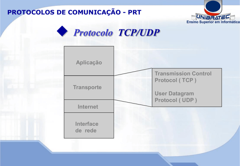 PROTOCOLOS DE COMUNICAÇÃO - PRT Protocolo TCP/UDP Aplicação Transmission Control Protocol ( TCP ) Transporte User Datagram Protocol ( UDP ) Internet Interface de rede PROTOCOLOS DE COMUNICAÇÃO - PRT TCP/UDP Transport Control Protocol(TCP) – Oferece verificação de erro e controle de fluxo extensivos para garantir a entrega bem sucedida de dados. O TCP é um protocolo baseado em conexão. Nos Protocolos orientados a conexão, cada pacote de dados enviado • rede recebe uma confirmação, e o emissor registra mensagens de pela status para a garantia da entrega dos pacotes. A conexão é encerrada ao final da transmissão. • User Datagram Protocol(UDP) – Oferece uma capacidade reduzida de controle de erros. É um protocolo sem conexão, ou seja, os datagramas enviados do emissor ao receptor, não são controlados com mensagens de recebimento,e assim a transmissão dos dados não é tão confiável como o TCP. PROTOCOLOS DE COMUNICAÇÃO - PRT PROTOCOLO TCP • • • • ORIENTADO A CONEXÃO CONEXÃO CONFIÁVEL FIM-A-FIM SOCKET = PORT TCP + END. IP CONTROLE DE FLUXO – JANELA DESLIZANTE • CONTROLE DE ERROS – CHECKSUM • VÁRIAS CONEXÕES SIMULTÂNEAS PROTOCOLOS DE COMUNICAÇÃO - PRT Processamento Orientado por fluxo – Processa dados em um fluxo O TCP formata os dados em segmentos de tamanho variável, que serão passados a camada internet. Reorganização – Quando os dados chegam ao destino fora de ordem, O TCP reorganiza os dados para restaurar a ordem original. Controle de Fluxo – Garante que a transmissão de dados não ultrapassará os tamanhos de buffer (capacidade da máquina destino de processar as informações.) Término da Conexão – O recurso de fechamento de uma conexão, garante que todos os segmentos foram enviados e recebidos antes que uma conexão fosse fechada. PROTOCOLOS DE COMUNICAÇÃO - PRT Portas e Soquetes Camada de Aplicação F T P 21 Camada de Transporte T E L N E T S M T P D N S 23 25 53 TCP H T T P 80 S N M P 161 Números de Portas UDP Porta é um endereço interno predefinido como uma via da aplicação para a camada de transporte ou vice-versa.Um host cliente entra em contato com a aplicação de FTP de um servidor via a porta 21 do TCP. PROTOCOLOS DE COMUNICAÇÃO - PRT Portas e Soquetes Soquete – É um endereço formado pela junção do endereço IP com o número de porta . Por exemplo, o soquete 200.110.131.141.80 refere-se à porta 80 no host com o endereço 200.110.131.141. Portas TCP/UDP mais utilizadas padronizadas pelo IANA: FTP = 21 TELNET=23 SMTP=25 HTTP=80 POP3=110 SNMP=161 DNS=53 PROTOCOLOS DE COMUNICAÇÃO - PRT The TCP Service Model Port 21 23 25 69 79 80 110 119 Protocol FTP Telnet SMTP TFTP Finger HTTP POP-3 NNTP Use File transfer Remote login E-mail Trivial File Transfer Protocol Lookup info about a user World Wide Web Remote e-mail access USENET news Some assigned ports. PROTOCOLOS DE COMUNICAÇÃO - PRT Tanto o TCP quanto o UDP usam números de porta (ou soquete) para passar as informações às camadas superiores. Os números de portas são usados para manter registro de diferentes conversações que cruzam a rede ao mesmo tempo. Os desenvolvedores de aplicações de software concordaram em usar os números de portas bem conhecidos que estão definidos no RFC1700. Conversações, que não envolvem aplicações com números de portas bem conhecidos, recebem números de porta que foram selecionados aleatoriamente em um conjunto específico. Esses números de portas são usados como endereços de origem e destino no segmento TCP. Algumas portas são reservadas no TCP e no UDP , embora possa não haver aplicações para suportá-los. Os números de portas têm os seguintes conjuntos atribuídos: •Números abaixo de 255 - para aplicações públicas •Números de 255 a 1023 - atribuídos às empresas para aplicações comerciais. •Números acima de 1023 - não são regulamentados Os sistemas finais usam números de portas para selecionar as aplicações corretas. Os números de portas de origem são atribuídos dinamicamente pelo host de origem, normalmente são números maiores do que 1023. PROTOCOLOS DE COMUNICAÇÃO - PRT TCP Header. PROTOCOLOS DE COMUNICAÇÃO - PRT PROTOCOLO TCP 0 4 8 15 16 Número do port de origem 16 bits 31 Número do port de destino 16 bits Número de Seqüência 32 bits Número de Reconhecimento 32 bits Tam. Cab. 4 bits Reservado 6 bits U A P R S F R C S S Y I G K H T N N Soma Verificadora TCP 16 bits 20 bytes Tamanho da janela 16 bits Indicador de Urgência 16 bits Dados PROTOCOLOS DE COMUNICAÇÃO - PRT A seguir, definições dos campos no segmento TCP: •porta de origem - número da porta que fez a chamada •porta de destino - número da porta chamada •número de seqüência - número usado para garantir a seqüência correta dos dados de chegada •número de confirmação - próximo octeto TCP esperado •HLEN - número de palavras de 32 bits no cabeçalho •reservado - definido como zero •janela - número de octetos que o remetente está disposto a aceitar •checksum - checksum calculado do cabeçalho e dos campos de dados •indicador de urgência - indica o final dos dados urgentes •dados - dados do protocolo da camada superior PROTOCOLOS DE COMUNICAÇÃO - PRT Handshake Triplo TCP Abrir Conexão Os hosts TCP estabelecem uma sessão orientada para conexão com outro usando um handshake triplo. Uma seqüência de conexão handshake triplo/aberta sincroniza a conexão nas duas extremidades antes dos dados serem transferidos. A troca de números de seqüência de introdução, durante a seqüência de conexão, é importante. Ela garante que dados perdidos, devido a problemas de transmissão que possam ocorrer mais adiante, possam ser recuperados. PROTOCOLOS DE COMUNICAÇÃO - PRT Handshake Triplo TCP Abrir Conexão Host A Host B Send SYN (seq = x) Receive SYN (seq = x) Send SYN (seq = y, ack = x+1) Receive SYN (seq = y, ack = x+1) Send ACK (ack = y+1 ) Receive ACK (ac