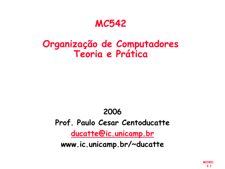 MC542 Organização de Computadores Teoria e Prática 2006 Prof. Paulo Cesar Centoducatte [email protected] www.ic.unicamp.br/~ducatte MO401 3.1 MC542 Arquitetura de Computadores Conjunto de Instruções “Computer Organization and Design: The Hardware/Software Interface” (Capítulo 2) MO401 3.2 Conjuntos de Instruções • • • • • • Introdução Classificação do ISA Endereçamento de Memória Operações no Conjunto de Instruções Tipo e tamanho dos operandos Codificação do ISA • • A Arquitetura MIPS Impacto Compiladores vs ISA – – 80x86 DLX MO401 3.3 Introdução O ISA é a porção da máquina visível ao programador (nível de montagem) ou aos projetistas de compiladores software instruction set hardware 1. Quais as vantagens e desvantagens das diversas alternativas de ISA. 2. Como as linguagens e compiladores afetam (ou são afetados) o ISA. 3. Arquitetura DLX como exemplo de arquitetura RISC. MO401 3.4 Introdução - ISA software instruction set Interface entre o Hardware e o Usuário hardware MO401 3.5 Introdução - Interface Uma boa interface: • Sobrevive a várias implementações (portabilidade, copacidade, escalabilidade, …). • Usada de diferentes formas (generalidade). • Provê funcionalidades para os níveis superiores. • Permite uma implementação eficiente no nível inferior (hw). impl 1 uso uso Interface uso impl 2 Time impl 3 MO401 3.6 Evolução dos ISAs Single Accumulator (EDSAC 1950) Accumulator + Index Registers (Manchester Mark I, IBM 700 series 1953) Separation of Programming Model from Implementation High-level Language Based (B5000 1963) Concept of a Family (IBM 360 1964) General Purpose Register Machines Complex Instruction Sets (Vax, Intel 432 1977-80) CISC (Intel x86, Pentium) Load/Store Architecture (CDC 6600, Cray 1 1963-76) RISC (Mips, Sparc, 88000, IBM RS6000, …1987) MO401 3.7 Evolução dos ISAs • As maiores vantagens em uma arquitetura, em geral, são associadas com as mudanças do ISA – Ex: Stack vs General Purpose Registers (GPR) • Decisões de projeto que devem ser levadas em consideração: – tecnologia – – – – organização linguagens de programação tecnologia em compiladores sistemas operacionais MO401 3.8 Projeto de um ISA 5 aspectos principais • Número de operandos (explícitos) (0,1,2,3) • Armazenamento do Operando. Aonde ele está? • Endereço Efetivo. Como é especificado? • Tipo & Tamanho dos operandos. byte, int, float, … como eles são especificados? • Operações add, sub, mul, … como são especificadas? MO401 3.9 Projeto de um ISA Outros aspectos • Sucessor • Condições Como é especificado? Como são determinadas? • Codificação Fixa ou Váriavel? Tamanho? • Paralelismo MO401 3.10 Classes básicas de ISA Accumulator: 1 address 1+x address add A addx A acc acc acc + mem[A] acc + mem[A + x] Stack: 0 address add tos tos + next General Purpose Register: 2 address add A B 3 address add A B C Load/Store: 0 Memory 1 Memory EA(A) EA(A) load R1, Mem1 load R2, Mem2 add R1, R2 EA(A) + EA(B) EA(B) + EA(C) Instruções da ALU podem ter dois ou três operandos. Instruções da ALU podem ter 0, 1, 2, 3 operandos. add R1, Mem2 MO401 3.11 Classes básicas de ISA Código nas diferentes classes de endereçamento para: C = A + B. Stack Accumulator Register (Register-memory) Push A Load A Load Push B Add B Add Add Store C Store Pop C R1, A R1, B C, R1 Register (load-store) Load R1, A Load R2, B Add R3, R1, R2 Store C, R3 MO401 3.12 Vantagens e Desvantagens Stack V: Forma simples para avaliação de expressões (notação polonesa). Instruções curtas, podem levar a uma boa densidade de código. D: A pilha não pode ser acessada randomicamente. Esta limitação torna mais complicada a geração de código eficiente. A implementação eficiente também é mais difícil, a pilha torna-se um gargalo. MO401 3.13 Vantagens e Desvantagens Accumulator V: Minimiza o número de estados internos da máquina. Instruções curtas. D: Uma vez que o acumulador é um temporário, o tráfego na memória é alto. MO401 3.14 Vantagens e Desvantagens Register V: Formato mais geral para geração de código. D: Todos os operandos devem ser nomeados, instruções mais longas. Enquanto as máquinas mais antigas usavam o estilo “stack” ou “accumulator”, arquiteturas moderrnas (projetadas nos últimos 10-20 anos) usam “general-purpose register” Registradores são mais rápidos O uso de Registradores é mais fácil para os compiladores Registradores podem ser utilizados mais efetivamente como forma de armazenamento MO401 3.15 Tipos de Máquinas MO401 3.16 Machine EDSAC IBM 701 Number of general-purpose registers 1 1 Architectural style Year Accumulator Accumulator 1949 1953 CDC 6600 IBM 360 8 16 Load-store Register- memory 1963 1964 DEC PDP-8 1 Accumulator 1965 DEC PDP-11 Intel 8008 Motorola 6800 8 1 2 Register- memory Accumulator Accumulator 1970 1972 1974 DEC VAX 16 Register- memory, memory- memory 1977 Intel 8086 Motorola 68000 1 16 Extended accumulator Register- memory 1978 1980 Intel 80386 8 Register- memory 1985 MIPS HP PA-RISC SPARC PowerPC DEC Alpha 32 32 32 32 32 Load-store Load-store Load-store Load-store Load-store 1985 1986 1987 1992 1992 MO401 3.17 Registradores no Intel 80X86 GPR0 EAX Accumulator GPR1 ECX Count register, string, loop GPR2 EDX Data Register; multiply, divide GPR3 EBX Base Address Register GPR4 ESP Stack Pointer GPR5 EBP Base Pointer – for base of stack seg. GPR6 ESI Index Register GPR7 EDI Index Register CS Code Segment Pointer SS Stack Segment Pointer DS Data Segment Pointer ES Extra Data Segment Pointer FS Data Seg. 2 GS Data Seg. 3 EIP Instruction Counter Eflags Condition Codes PC MO401 3.18 Modos de Endereçamento Interpretando endereços de memória Qual objeto é acessado em função do endereço e qual o seu tamanho? Objetos endereçados a byte – um endereço refere-se ao número de bytes contados do início da memória. Little Endian – o byte cu