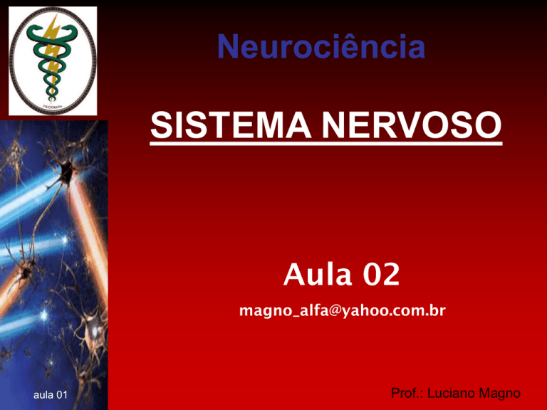 Neurociência SISTEMA NERVOSO Aula 02 [email protected] aula 01 Prof.: Luciano Magno Neurociência HOMEM aula 01 X MULHER Prof.: Luciano Magno Neurociência SISTEMA NERVOSO É o órgão da consciência, da cognição, da ética e do comportamento; como tal, é a estrutura mais complexa de existência conhecida. Sistema Nervoso aula 01 Sistema Nervoso Central Sistema Nervoso Periférico SNC (encéfalo e medula espinhal) SNP (nervos e gânglios nervosos) Prof.: Luciano Magno Neurociência SISTEMA NERVOSO Tecido Nervoso Neurônios céls. responsáveis pela recepção e transmissão dos estímulos do meio (interno e externo). - Irritabilidade PROPRIEDADES - Condutibilidade Células da Glia (neuróglia) participam da atividade neural, da nutrição e de processos de defesa, além da função de sustentação. aula 01 Prof.: Luciano Magno Neurociência NEURÔNIOS Compostos por: Corpo celular (pericário) Dendritos Axônio aula 01 Prof.: Luciano Magno Neurociência NEURÔNIOS De acordo com o tamanho e a forma dos seus prolongamentos, os neurônios são classificados em neurônios: multipolares p.ex.: grande maioria bipolares p.ex.: interneurônios pseudo-unipolares p.ex.: gânglios espinhais aula 01 Prof.: Luciano Magno Neurociência NEURÔNIOS Ainda são classificados segundo a sua função: Neurônios motores Neurônios sensitivos Interneurônios aula 01 Prof.: Luciano Magno Neurociência SUBSTÂNCIA BRANCA e SUBSTÂNCIA CINZENTA No SNC há uma certa segregação entre os corpos celulares dos neurônios e os seus prolongamentos. Isto faz com que sejam reconhecidas no encéfalo e na medula espinhal duas porções distintas, denominadas substância branca e substância cinzenta. aula 01 Prof.: Luciano Magno Neurociência SUBSTÂNCIA BRANCA Não contém corpos celulares de neurônios, sendo constituída por prolongamentos de neurônios e por células da glia. Seu nome origina-se da presença de grande quantidade de um material esbranquiçado denominado mielina, que envolve certos prolongamentos dos neurônios. aula 01 Prof.: Luciano Magno Neurociência SUBSTÂNCIA CINZENTA É assim chamada porque mostra essa coloração quando observada macroscopicamente. É formada principalmente por corpos celulares dos neurônios e células da glia, contendo também prolongamentos de neurônios. aula 01 Prof.: Luciano Magno Neurociência NEURÓGLIA Composta por: Astrócitos Céls da Micróglia Oligodendrócitos Céls. Ependimárias Céls. de Schwann aula 01 Prof.: Luciano Magno Neurociência NEURÓGLIA aula 01 Prof.: Luciano Magno Neurociência POTENCIAL DE REPOUSO X POTENCIAL DE AÇÃO aula 01 Prof.: Luciano Magno Neurociência IMPULSO NERVOSO aula 01 Prof.: Luciano Magno Neurociência IMPULSO NERVOSO Bomba de Na+ / K+ aula 01 Prof.: Luciano Magno Neurociência IMPULSO NERVOSO aula 01 Prof.: Luciano Magno Neurociência IMPULSO NERVOSO aula 01 Prof.: Luciano Magno Neurociência IMPULSO NERVOSO aula 01 Prof.: Luciano Magno Neurociência IMPULSO NERVOSO aula 01 Prof.: Luciano Magno Neurociência IMPULSO NERVOSO Condução Saltatória aula 01 Prof.: Luciano Magno Neurociência IMPULSO NERVOSO O Terminal axonal e as Sinapses Estruturas (junções) altamente especializadas, responsáveis pela transmissão dinâmica do impulso nervoso, de um neurônio para outro, ou para outro tipo celular. As sinapses podem ser elétricas ou químicas (maioria). aula 01 Prof.: Luciano Magno Neurociência IMPULSO NERVOSO O Terminal axonal e as Sinapses Tipos de conexões entre os neurônios: • Axodendríticas • Axossomáticas • Dendrodentríticas • Axoaxonicas aula 01 Prof.: Luciano Magno Neurociência IMPULSO NERVOSO O Terminal axonal e as Sinapses ESTRUTURAS DE UMA SINAPSE Axônio FENDA Botões terminais aula 01 Células Receptora SINÁPTICA • Vesículas sinápticas (neurotransmissores) • Receptores • Membrana pré-sináptica • Membrana póssináptica Prof.: Luciano Magno Neurociência IMPULSO NERVOSO O Terminal axonal e as Sinapses SINAPSES ELÉTRICAS As sinapses elétricas, mais simples e evolutivamente antigas, permitem a transferência direta da corrente iônica de uma célula para outra. Ocorrem em sítios especializados denominados junções gap ou junções comunicantes. Nesses tipos de junções as membranas pré-sinápticas (do axônio - transmissoras do impulso nervoso) e pós-sinápticas (do dendrito ou corpo celular receptoras do impulso nervoso) estão separadas por apenas 3 nm. aula 01 Prof.: Luciano Magno Neurociência IMPULSO NERVOSO O Terminal axonal e as Sinapses SINAPSES ELÉTRICAS aula 01 Prof.: Luciano Magno Neurociência IMPULSO NERVOSO O Terminal axonal e as Sinapses SINAPSES QUÍMICAS As membranas pré e pós-sinápticas são separadas por uma fenda com largura de 20 a 50 nm - a fenda sináptica. A passagem do impulso nervoso nessa região é feita, então, por substâncias químicas: os neuro-hormônios, também chamados mediadores químicos ou neurotransmissores, liberados na fenda sináptica. aula 01 Prof.: Luciano Magno Neurociência IMPULSO NERVOSO O Terminal axonal e as Sinapses SINAPSES QUÍMICAS O terminal axonal típico contém dúzias de pequenas vesículas membranosas esféricas que armazenam neurotransmissores - as vesículas sinápticas. A membrana dendrítica relacionada com as sinapses (pós-sináptica) apresenta moléculas de proteínas especializadas na detecção dos neurotransmissores na fenda sináptica - os receptores. aula 01 Prof.: Luciano Magno Neurociência IMPULSO NERVOSO O Terminal axonal e as Sinapses SINAPSES QUÍMICAS aula 01 Prof.: Luciano Magno Neurociência IMPULSO NERVOSO O Terminal axonal e as Sinapses SINAPSES QUÍMICAS aula 01 Prof.: Luciano Magno Neurociência Por meio das sinapses, um neurônio pode transmitir mensagens para células ou até milhares de neurônios diferentes aula 01 Prof.: Luciano Magno Neurociência PLACA MOTORA aula 01 Prof.: Luciano Magno Neurociência NEUROTRANSMISSORES São mediadores químicos responsáveis pela transmissão do i