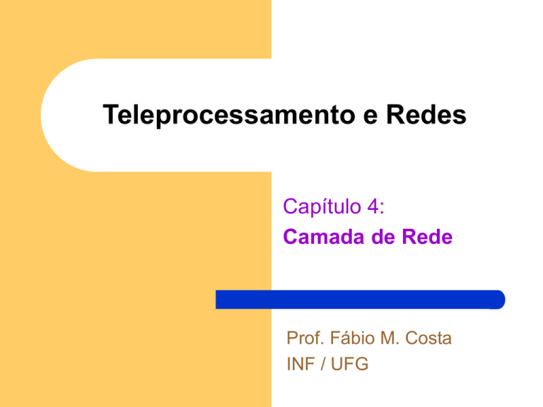 Teleprocessamento e Redes Capítulo 4: Camada de Rede Prof. Fábio M. Costa INF / UFG Visão Geral 2 Serviço oferecidos pela camada de rede Organização interna da camada de rede Algoritmos de roteamento – visão geral Controle de congestionamento Interconexão de redes A camada de rede na Internet A camada de rede em redes ATM – visão geral Prof. Fábio M. Costa - INF / UFG No contexto da pilha de protocolos... 3 Prof. Fábio M. Costa - INF / UFG Função básica da Camada de Rede Determinar caminhos para a transmissão de pacotes Conduzir pacotes através da rede, passando por vários nodos, da origem até o destino – Nodo: Roteador ou Host Primeira camada que se ocupa com transmissão de dados fim-a-fim Sub-rede R1 4 Origem R2 R4 R3 R5 Destino Prof. Fábio M. Costa - INF / UFG Fução básica da Camada de Rede (2) application transport network data link physical network data link physical network data link physical network data link physical network data link physical network data link physical network data link physical network data link physical network data link physical application transport network data link physical 5 Prof. Fábio M. Costa - INF / UFG Pressupostos básicos Conhecimento da topologia da rede Capacidade de escolher caminhos otimizados Evitar a sobrecarga de certos enlaces ou roteadores Lidar com as incompatibilidades entre redes diferentes – 6 Quando origem e destino se encontram em redes com características diferentes Prof. Fábio M. Costa - INF / UFG Serviço oferecido pela Camada de Rede Requisitos fundamentais: – – – Dois tipos mutuamente excludentes de serviços: – – 7 Independentes da tecnologia da rede subjacente Isolar a Camada de Transporte das questões relativas ao tamanho, tipo e topologia das subredes presentes Usar um esquema de endereçamento uniforme Serviço orientado a conexões Serviço sem conexões Prof. Fábio M. Costa - INF / UFG Serviço sem conexões Defendido pela comunidade ligada à Internet Argumentos principais: – A função da sub-rede é mover bits de um lado para o outro – A sub-rede é inerentemente não-confiável, independentemente de seu design 8 SEND_PACKET, RECEIVE_PACKET Hosts devem aceitar o fato, sendo que os mesmos são responsáveis pelo controle de erros e de fluxo Tornar a sub-rede o mais simples possível Movendo a complexidade adicional para os hosts (computadores dos usuários) Prof. Fábio M. Costa - INF / UFG Serviço orientado a conexões Defendido pela comunidade ligada às companhias telefônicas Principais argumentos: – Sub-rede deve prover um serviço confiável – Usuários (hosts) não devem se preocupar com estes “detalhes” 9 Funções como controle de erros e de fluxo são realizadas pela sub-rede Apropriado no caso de terminais “burros”: telefone Remove a complexidade dos hosts Sub-rede mais complexa Prof. Fábio M. Costa - INF / UFG Organização interna da Camada de Rede Rede baseada em Circuitos Virtuais X Rede baseada em Datagramas Datagramas Circuitos Virtuais (VC) – – – 10 rota fixa no estabelec. da conexão roteadores mantém tabela de VCs ativos análogo ao sistema telefônico – – – rota determinada para cada pacote individual pacotes podem seguir rotas diferentes análogo ao sistema postal Prof. Fábio M. Costa - INF / UFG Sub-rede baseada em Circuitos Virtuais Cada roteador mantém uma tabela de VCs: – – Cada VC recebe um número único no contexto de um roteador – 11 Uma entrada para cada VC passando por ele Indicando a interface de rede através da qual pacotes de cada VC devem ser encaminhados O mesmo VC pode ser identificado através de números diferentes em roteadores distintos Pacotes são identificados pelo número do VC ao qual pertencem Prof. Fábio M. Costa - INF / UFG Sub-rede baseada em Circuitos Virtuais (2) Protocolo de sinalização – – Usado para o estabelecimento de circuitos virtuais Antes que transferência de dados real possa ocorrer application transport 5. Data flow begins network 4. Call connected data link 1. Initiate call physical 12 6. Receive data application 3. Accept call 2. incoming call transport network data link physical Prof. Fábio M. Costa - INF / UFG Sub-rede baseada em Datagramas Cada roteador mantém uma tabela indicando: – A interface de rede através da qual cada roteador existente pode ser atingido – Tabela de rotas Pacotes (datagramas) devem conter o endereço completo do destino – 13 Interface usada para encaminhar pacotes destinados àquele roteador específico Roteadores usam este endereço para verificar, em suas tabelas de rotas, qual interface usar para encaminhar cada pacote recebido Prof. Fábio M. Costa - INF / UFG Sub-rede baseada em Datagramas (2) Não é necessário tempo inicial de preparação da conexão Dados começam a ser transmitidos imediatamente application transport network data link 1. Send data physical 14 application transport network 2. Receive data data link physical Prof. Fábio M. Costa - INF / UFG Circuitos Virtuais e Datagramas: Comparação Aspecto Sub-rede baseada em Datagramas Sub-rede baseada em VCs Estabelecimento de circuito Não necessário Necessário. Overhead inicial Endereçamento Cada pacote contém o endereço completo do destino Cada pacote contém um pequeno número identificando o VC Informação de estado Sub-rede stateless Cada VC requer uma entrada na tabela de VCs Roteamento Cada pacote roteado independente Rota escolhida quando do estabelecim. do VC Efeito de falhas de roteadores Nenhum. Pacotes podem seguir outra rota VCs passando pelo roteador são terminados Controle de congestionamento Difícil Resolvido com a reserva de buffers para cada VC 15 Prof. Fábio M. Costa - INF / UFG Estrutura Interna da Sub-rede e Tipos de Serviço Tipo de sub-rede Tipo de serviço (camada superior) 16 Datagrama Circuito Virtual Sem-conexão UDP sobre IP UDP sobre IP sobre ATM Orientado a conexão TCP sobre IP ATM AAL1 sobre ATM Prof. Fábio M. Costa - IN