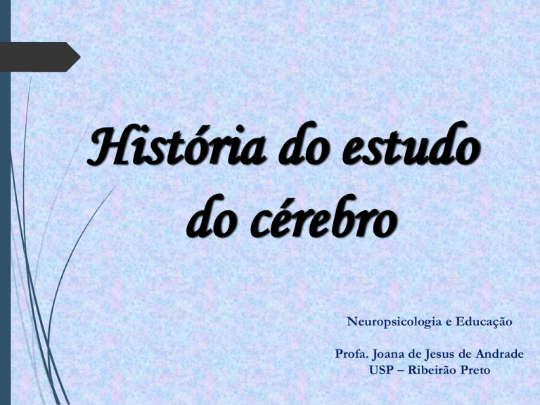 História do estudo do cérebro Neuropsicologia e Educação Profa. Joana de Jesus de Andrade USP – Ribeirão Preto Provavelmente a humanidade vencerá, cedo ou tarde, a cegueira, a surdez e a debilidade mental. Mas as vencerá muito antes no plano social e pedagógico do que nos planos médico e biológico (Vigotski). 400 cm3 800 cm3 1000 cm3 1300 cm3 1350 cm3 "Há razões para acreditar-se que a atividade voluntária, mais do que o intelecto altamente desenvolvido, diferencia os seres humanos dos animais filogeneticamente mais próximos" (Vigotski) Papiros Egípcios de Edwin Smith Escrito por volta de 1700 a.C. contém referências à textos escritos até 3000 a.C. É considerado o primeiro documento médico da história da humanidade e sua autoria é provavelmente de um grande médico egípcio chamado Imhotep. Descreve os sintomas, o provável diagnóstico e, quando possível, sugere um tratamento para pacientes que haviam sofrido lesões cerebrais e no pescoço. Cérebro circunvoluções meninges líquido cefaloraquidiano 470 - 360 a.C. Demócrito Diz que o cérebro é a sede do pensamento; localiza as faculdades afetivas em diferentes partes do corpo – o desejo no fígado e a ira no coração. A tradição chinesa considera que alguns dos principais órgãos do corpo são afetados quando há alteração emocional. Pulmão - tristeza, expressada em asma e bronquite. Coração - à ansiedade. Rim, ossos e medula - medo. Fígado - raiva e revolta. Baço e pâncreas - preocupação. 460 – 355 a.C. Hipócrates * correlaciona ferimentos cranianos a problemas motores; * afirma que o cérebro é a parte mais importante do corpo e é onde está localizado o pensamento. * postula que tanto as doenças neurológicas quanto as doenças mentais são distintas e localizam-se no cérebro. Descreve a epilepsia como sendo um distúrbio do cérebro e estabelece que o cérebro está envolvido com nossas sensações e emoções e é o sítio da inteligência. 428 – 347 a.C Platão No Timeo, atribui a idéia de imortalidade ao intelecto situado na cabeça, atribui a medula espinhal como sendo a parte mais importante do corpo. 348 – 322 a.C Aristóteles Discorda da idéia de se atribuir ao cérebro a sede do pensamento, postulada por Platão; afirma que o coração é a sede da inteligência, o verdadeiro centro de comando da vida, da sensação e do movimento. Ao cérebro nada mais resta que a simples tarefa de refrigerar o organismo, uma vez que nada mais é além de um “composto de água e terra”. O coração sendo visto como o centro da vida faz renascer o “cardiocentrismo”. Escreve sobre memória e reminiscência. O sapo e a sapa, o gato e a gata, o homem e a mulher... 200-129 a.C. Galeno Volta a atribuir ao cérebro o comando do corpo e das atividades mentais, rompendo de vez com o “cardiocentrismo”; também propõe uma decomposição da alma em funções específicas, de acordo com três faculdades: motora, sensitiva e racional. Foi um intenso dissecador e prestou muita atenção às meninges e às cavidades encefálicas e menos atenção ao cérebro em si. Idade Média – Renascimento Retorno à Antiguidade Clássica: os estudos sobre neuroanatomia são retomados por Leonardo da Vinci que atuou no Hospital de Santa Maria Nuova – Florença (1504); - 1020 Avicena sugere que três ventrículos do cérebro realizam cinco diferentes processos cognitivos: senso comum, imaginação, cogitação, avaliação e memória. - 1506 Marko Marullik usa o termo Psichiologia pela primeira vez. 1596-1650 René Descartes Primeiro filósofo moderno e anatomista; afirmava que uma parte do ser humano, o corpo, é a máquina responsável pelos mecanismos físicos e biológicos e está ligada a outra parte do ser humano que se compreende como sendo indivisível, racional, imaterial, responsável pelo juízo moral e sofrimentos, que é a mente. A glândula pineal é responsável pela união da mente com o corpo; res cogitans pensante) e res extensa (partes mecânicas). Em 1649 publica Paixões da alma e Discurso do método. (coisa 1757-1828 Franz Joseph Gall Médico e neuroanatomista alemão, analisa as conformações da cabeça atribuindo as faculdades mentais e/ou aptidões às protuberâncias existentes na caixa craniana; apresentou um mapa contendo 35 faculdades intelectuais e emocionais. Surge o localizacionismo. Faz o primeiro dos famosos mapas do cérebro humano, dividindo a superfície do crânio em 27 fatias, distinguindo tanto funções psíquicas quanto motrizes. Usando um método precário, ainda assim acertou as áreas das palavras e da memória das palavras, localizada na região frontal do cérebro. Assim, Gall abriu o caminho das localizações cerebrais. Localizacionismo: ontem e hoje 1794-1867 Pierre Flourens Fisiologista francês, no final da década de 1820, submete a frenologia à análise experimental demonstrando os equívocos de Gall: todas as áreas cerebrais funcionam concomitantemente para a realização de cada função mental específica. Surge o unitarismo (mais tarde denominada campo agregado), “qualquer parte do hemisfério cerebral é capaz de desempenhar todas as funções do hemisfério”. 1809-1882 Charles Darwin Publica A origem das espécies por meio da seleção natural e em 1871 A descendência do homem. Para ele a mente também se desenvolveu pela seleção e adaptação dos mais “aptos”. 1960 – Jane Goodall – 30 anos de estudos dos chimpanzés na Tanzânia: chimpanzés produzem instrumentos (folhas como material de limpeza, como esponja, limpam gravetos para pegar insetos, ludibriam seus companheiros, quebram coquinhos com pedra -martelo- e apoio –bigorna-) Leakley: “Agora teremos de redefinir ferramenta, redefinir o homem ou aceitar os chimpanzés como humanos 1824-1880 Pierre Paul Broca Demonstra que a perda da fala em alguns indivíduos é proveniente de uma lesão na terceira circunvolução do lóbulo frontal superior esquerdo. “Nós