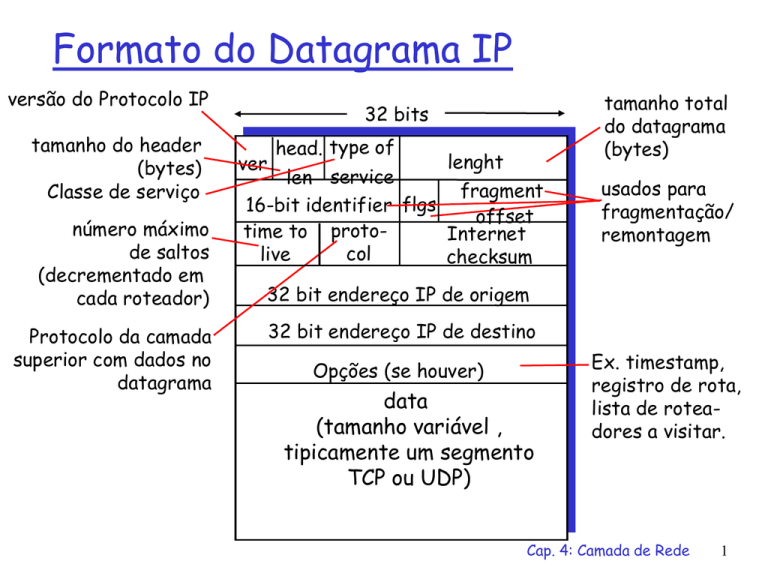 Formato do Datagrama IP versão do Protocolo IP tamanho do header (bytes) Classe de serviço número máximo de saltos (decrementado em cada roteador) Protocolo da camada superior com dados no datagrama 32 bits head. type of lenght len service fragment 16-bit identifier flgs offset time to protoInternet col live checksum ver tamanho total do datagrama (bytes) usados para fragmentação/ remontagem 32 bit endereço IP de origem 32 bit endereço IP de destino Opções (se houver) data (tamanho variável , tipicamente um segmento TCP ou UDP) Ex. timestamp, registro de rota, lista de roteadores a visitar. Cap. 4: Camada de Rede 1 IP Fragmentação e Remontagem Enlaces de rede têm MTU (max.transfer size) - corresponde ao maior quadro que pode ser transportado pela camada de enlace. tipos de enlaces diferentes possuem MTU diferentes (ethernet: 1518 bytes) Datagramas IP grandes devem ser divididos dentro da rede (fragmentados) um datagrama dá origem a vários datagramas “remontagem” ocorre apenas no destino final O cabeçalho IP é usado para identificar e ordenar datagramas relacionados fragmentação in: um datagrama grande out: 3 datagramas menores reassembly Cap. 4: Camada de Rede 2 IP Fragmentação e Remontagem tamanho ID fragflag offset =4000 =x =0 =0 Um grande datagrama se torna vários datagramas menores tamanho ID fragflag offset =1500 =x =1 =0 tamanho ID fragflag offset =1500 =x =1 =1480 tamanho ID fragflag offset =1040 =x =0 =2960 Cap. 4: Camada de Rede 3 ICMP: Internet Control Message Protocol Usado por computadores e roteadores para troca de informação de controle da camada de rede relatório de erros: host, rede, porta ou protocolo echo request/reply (usado pela aplicação ping) transporte de mensagens: mensagens ICMP transportadas em datagramas IP ICMP message: tipo, código, mais primeiros 8 bytes do datagrama IP que causou o erro Tipo 0 3 3 3 3 3 3 4 Código 0 0 1 2 3 6 7 0 8 9 10 11 12 0 0 0 0 0 descrição echo reply (ping) dest. network unreachable dest host unreachable dest protocol unreachable dest port unreachable dest network unknown dest host unknown source quench (congestion control - not used) echo request (ping) route advertisement router discovery TTL expired bad IP header Cap. 4: Camada de Rede 4 ICMP – Exemplo: traceroute Envia uma série de datagramas IP em direção ao destino com TTLs crescentes: 1, 2, 3, ... Ao receber o n-ésimo datagrama, o n-ésimo roteador observa que seu TTL zerou envia de volta mensagem ICMP tipo 11, código 0 Host de origem recebe cada uma das mensagens ICMP e: reconstitui a rota para o host destino estima o atraso acumulado em cada nó no caminho Cap. 4: Camada de Rede 5 DHCP: Dynamic Host Configuration Protocol Protocolo cliente-servidor Cliente: host “recém-chegado” à rede Servidor: fornece informações de configuração de rede aos clientes (ex.: endereço IP) Um servidor para cada rede local (LAN), ou Roteador local faz o papel de agente de relay para o servidor de DHCP mais próximo Cap. 4: Camada de Rede 6 DHCP Servidor DHCP 223.1.1.1 Atua como relay agent 223.1.1.2 223.1.1.4 223.1.1.3 223.1.3.1 223.1.3.27 223.1.2.5 223.1.2.1 223.1.2.9 223.1.2.2 223.1.3.2 Cap. 4: Camada de Rede 7 DHCP: Troca de mensagens DHCP Discover Message : broadcast pelo cliente datagrama UDP, endereçado para 255.255.255.255, porta 67 DHCP Server Offer : resposta do servidor DHCP local (via protocolo de enlace), contendo: endereço IP proposto para o cliente máscara de rede prazo de validade do endereço IP fornecido Pode haver mais de um servidor DHCP: cliente escolhe DHCP Request : cliente confirma aceitação dos parâmetros de configuração do servidor escolhido DHCP ACK : servidor confirma os parâmetros do cliente Cap. 4: Camada de Rede 8 DHCP DHCP discover Src: 0.0.0.0, 68 Dest: 255.255.255.255, 67 DHCPDISCOVER Yiaddr: 0.0.0.0 Transaction ID: 654 DHCP request DHCP offer Src: 223.1.2.5, 67 Dest: 255.255.255.255, 68 DHCPOFFER Yiaddr: 223.1.2.4 Transaction ID: 654 DHCP server ID: 223.1.2.5 Lifetime: 3600 secs Src: 0.0.0.0, 68 Dest: 255.255.255.255, 68 DHCPREQUEST Yiaddr: 223.1.2.4 Transaction ID: 655 DHCP server ID: 223.1.2.5 DHCP ACK Lifetime: 3600 secs Src: 223.1.2.5, 67 Dest: 255.255.255.255, 68 DHCPACK Yiaddr: 223.1.2.4 Transaction ID: 655 DHCP server ID: 223.1.2.5 Lifetime: 3600 secs Cap. 4: Camada de Rede 9 NAT: Network Address Translation Solução de transição para a escassez de endereços IP Redes locais podem utilizar endereços IP não-validos Roteador NAT traduz os endereços internos da rede local (não-válidos externamente) para um endereço válido endereço do roteador que conecta a rede local com a Internet i.e., roteador habilitado para NAT Cap. 4: Camada de Rede 10 NAT: Exemplo Tabela de tradução NAT Do lado da LAN Do lado da WAN 10.0.0.1, 3345 138.76.29.7, 5001 ... ... S = 10.0.0.1, 3345 D = 128.119.40.186, 80 10.0.0.1 10.0.0.2 S = 138.76.29.7, 5001 D = 128.119.40.186, 80 1 2 10.0.0.4 4 10.0.0.3 138.76.29.7 S = 128.119.40.186, 80 D = 10.0.0.1, 3345 3 S = 128.119.40.186, 80 D = 138.76.29.7, 5001 Cap. 4: Camada de Rede 11 Roteamento na Internet A Internet consiste de Sistemas Autônomos (AS) interconectados entre si: Stub AS: pequena corporação Multihomed AS: grande corporação (sem tráfego de trânsito) Transit AS: provedor de acesso Dois níveis de roteamento: Intra-AS: o administrador é responsável pela definição do método de roteamento Inter-AS: padrão único Cap. 4: Camada de Rede 12 Hierarquia de AS Roteador de borda Inter-AS (exterior gateway) Roteador interno Intra-AS (gateway) Cap. 4: Camada de Rede 13 Roteamento Intra-AS Também conhecido como Interior Gateway Protocols (IGP) IGPs mais comuns: RIP: Routing Information Protocol OSPF: Open Shortest Path First IGRP: Interior Gateway Routing Protocol (proprietário da Cisco) Cap. 4: Camada de Rede 14 RIP ( Routing Information Protocol) Algoritmo do tipo vetor-distância Incluso na distribuição do BSD-UNIX em 1982 Métrica de distância: núme