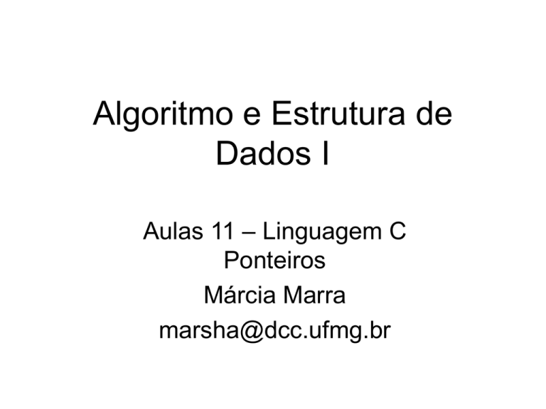 Algoritmo e Estrutura de Dados I Aulas 11 – Linguagem C Ponteiros Márcia Marra [email protected] Introdução a Ponteiros (1/3) • Armazenam endereços de memória. • Quando você anota o endereço de um colega você está criando um ponteiro. • O ponteiro é este seu pedaço de papel. Ele tem anotado um endereço. • Qual é o sentido disto? – Simples. Quando você anota o endereço de um colega, depois você vai usar este endereço para achá-lo. – O C funciona assim. Você anota o endereço de algo numa variável ponteiro para depois usar. 2 Introdução a Ponteiros (2/3) • Um ponteiro também tem tipo. • Quando você anota um endereço de um amigo você o trata diferente de quando você anota o endereço de uma empresa. • Apesar de o endereço dos dois locais ter o mesmo formato (rua, número, bairro, cidade, etc.) eles indicam locais cujos conteúdos são diferentes. • Então os dois endereços são ponteiros de tipos diferentes. 3 Introdução a Ponteiros (3/3) • No C, é necessário informar ao compilador para que tipo de variável vamos apontá-lo. • Um ponteiro int aponta para um inteiro, isto é, guarda o endereço de um inteiro. 4 Declaração de Ponteiros • Declaração de ponteiros: Tipo_ponteiro *nome_variavel • Exemplos de ponteiros: – int *pt; – char *temp,*pt2; • Estes ponteiros foram declarados porém não inicializados! Podem estar apontando para qualquer área de memória, incluindo a porção de memória reservada ao SO! • O ponteiro deve ser inicializado (apontado para algum lugar conhecido) antes de ser usado! Isto é de suma importância! 5 Utilizando ponteiros • Para atribuir um valor a um ponteiro recémcriado poderíamos igualá-lo a um valor de memória. – Mas, como saber a posição na memória de uma variável do nosso programa? – Seria muito difícil saber o endereço de cada variável que usamos – os endereços são: • determinados pelo compilador durante a compilação; • realocados durante a execução do programa. • Para saber o endereço de uma variável basta usar o operador &. 6 Utilizando ponteiros – um exemplo int count=10; int *pt; pt=&count; • Como nós colocamos um endereço em pt, ele está agora "liberado" para ser usado. • É possível, por exemplo, alterar o valor de count usando pt. • Para tanto vamos usar o operador "inverso" do operador &. É o operador *. 7 Utilizando Ponteiros • No exemplo anterior, uma vez que fizemos pt=&count a expressão *pt é equivalente ao próprio count. • Isto significa que, se quisermos mudar o valor de count para 12, basta fazer *pt=12. 8 Utilização de ponteiros – voltando a analogia da empresa • Digamos que exista uma empresa. Ela é como uma variável que já foi declarada. • Você tem um papel em branco onde vai anotar o endereço da firma. O papel é um ponteiro do tipo empresa. • Você então liga para a empresa e pede o seu endereço, o qual você vai anotar no papel. – Isto é equivalente, no C, a associar o papel à firma com o operador &. Ou seja, o operador & aplicado à firma é equivalente a você ligar para a mesma e pedir o endereço. • Uma vez de posse do endereço no papel você poderia, por exemplo, fazer uma visita à firma. – No C você faz uma visita à firma aplicando o operador * ao papel. Uma vez dentro da firma você pode copiar seu conteúdo ou modificá-lo. 9 Utilizando ponteiros • Uma observação importante: – apesar do símbolo ser o mesmo, o operador * (multiplicação) não é o mesmo operador que o * (referência de ponteiros). – Para começar o primeiro é binário, e o segundo é unário pré-fixado. 10 Exemplo 1 de utilização de ponteiro #include <stdio.h> int main () { int num,valor; int *p; num=55; p=&num; /* Pega o endereco de num */ valor=*p; /* Valor e igualado a num indiretamente */ printf ("\n\n%d\n",valor); printf ("Endereco para onde o ponteiro aponta: %p\n",p); printf ("Valor da variavel apontada: %d\n",*p); return(0); } 11 Execução do exemplo 1 12 Exemplo 2 de utilização de ponteiro #include <stdio.h> int main () { int num,*p; num=55; p=&num; /* Pega o endereco de num */ printf ("\nValor inicial: %d\n",num); *p=100; /* Muda o valor de num de uma maneira indireta */ printf ("\nValor final: %d\n",num); return(0); } 13 Execução do exemplo 2 14 Operações com ponteiros (1/4) • É possível igualar dois ponteiros: – Se temos dois ponteiros p1 e p2 podemos realizar as operações: p1 = p2; *p1 = *p2; • É possível também incrementar e decrementar ponteiros: – O ponteiro passa a apontar para o próximo valor do mesmo tipo que ele aponta. – Por isto a importância do tipo!! 15 Operações com ponteiros (2/4) • Se você incrementa um char*, ele anda 1 byte na memória e se você incrementa um int*, ele anda 2 bytes. – Se temos 2 ponteiros p1 e p2 então: p1++; p2--; • Estas são operações com ponteiros! O conteúdo da variável não é alterado! Para incrementar o conteúdo de uma variável apontada por p1, temos: (*p)++; 16 Operações com ponteiros (3/4) • É possível ainda realizar soma e subtração de inteiros com ponteiros: p=p+15; p=p-2; • Se quisermos utilizar o conteúdo do ponteiro 15 posições para frente, basta: *(p+15); 17 Operações com ponteiros (4/4) • É possível ainda realizar comparação entre ponteiros: p1 == p2 p1 != p2 p1 > p2 p1 < p2 • Não é possível realizar com ponteiros: – Multiplicação e divisão de ponteiros – Adicionar 2 ponteiros – Adicionar ou subtrair outros tipos de dados 18 Pratique o conceito de ponteiros • Sendo p um ponteiro, qual a diferença entre: p++; (*p)++; *(p++); • O que quer dizer *(p+10);? • Como é realizada a comparação entre ponteiros? 19 Pratique o conceito de ponteiros • Qual o valor de y no final do programa abaixo? int main() { int y, *p, x; y = 0; p = &y; x = *p; x = 4; (*p)++; x--; (*p) += x; printf ("y = %d\n", y); return(0); } • Escreva um comentário em cada comando d