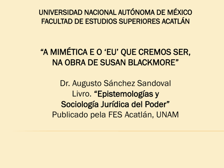 UNIVERSIDAD NACIONAL AUTÓNOMA DE MÉXICO FACULTAD DE ESTUDIOS SUPERIORES ACATLÁN “A MIMÉTICA E O ‘EU’ QUE CREMOS SER, NA OBRA DE SUSAN BLACKMORE” Dr. Augusto Sánchez Sandoval Livro. “Epistemologías y Sociología Jurídica del Poder” Publicado pela FES Acatlán, UNAM “A MIMÉTICA E O ‘EU’ QUE CREMOS SER” A produção de linguagens, de pensamentos e de ideologias são cargas energéticas que permanecem no espaço e podem ser copiados, replicados ou imitados pelas pessoas inconscientemente. Os mimes seriam os conceitos com os quais podemos nomear as cargas energéticas com informação desejada, que invadem nossa consciência e nosso Eu, para identificá-las e liberar-nos delas. Os genes, os mimes e a linguagem como imitação. Para ter consciência de algo, precisamos da linguagem e esta se constitui e se transmite tanto pelos genes que residem nos cromossomas, como pelos mimes. MEMES: São elementos de uma cultura que podem considerar-se transmitidos por médios não genéticos, especialmente pela imitação. Os genes, os mimes e a linguagem como imitação. A imitação: é uma modalidade de réplica ou de cópia e isto é o que constitui ao meme como replicador. Assim que dispomos da linguagem, tudo o que se experimenta está colorido por nossos memes. Os genes, os mimes e a linguagem como imitação A linguagem em quaisquer de suas formas leva uma carga de mimese que previamente tem-se colocado no cérebro, de maneira que sua expressão, por qualquer médio, constitui uma cópia ou réplica da mensagem contida nos mimes. Analogia de transmissão dos mimes Longitudinalmente por via genética e Horizontalmente por via de contagio como se fossem vírus. Um vírus: é uma mensagem química que requer de una célula viva anfitriã para produzir novas partículas virais, segundo as instruções codificadas no seu ADN ou ARN. Essas novas partículas não se constroem no interior do vírus, mas fora dele, na célula anfitriã. Analogia de transmissão dos mimes Um mime é como um vírus, ele não pode existir só e requer de um meio biológico para poder sobreviver e multiplicar-se por meio da linguagem oral, imitado, representado ou escrito. O cérebro humano torna-se o meio no qual se incubam e conseguem propagar-se os mimes, residentes no vasto campo da memória, tanto individual como coletiva, contida na consciência. Analogia de transmissão dos mimes Quando imitamos estamos transmitindo algo, que pode por sua vez copiar-se varias vezes até criar vida própria. Esse algo que pode ser uma ideia, uma ordem, uma conduta, uma informação, é suscetível de ser copiada, chama-se meme Analogia de transmissão dos mimes O inconsciente coletivo histórico e o inconsciente individual: Manifestam uma carga de mimes que participam tanto do mundo concreto, como do mundo biológico de cada sujeito, que permitem ou não, o desenvolvimento de ideias libertarias ou preconceituosas, segundo a predisposição biológico-cultural de cada pessoa. Analogia de transmissão dos mimes O inconsciente coletivo histórico e o inconsciente individual : Manifestam uma carga de mímes que participam tanto do mundo concreto, como do mundo biológico de cada sujeito, que permitem ou não, o desenvolvimento de ideias libertarias ou preconceituosas, segundo a predisposição biológico-cultural de cada pessoa. Analogia de transmissão dos mimes Conclusão: As emoções, comportamentos e expressões das pessoas são motivados pelos mimes que encontraram em seus cérebros a possibilidade de seu desenvolvimento, mas também pelos processos de experiência adquiridos através do ensino- aprendizagem, ou na experiência individual do conhecer. Analogia de transmissão dos mimes Conclusão: Os mimes são ao parecer, entidades de energia com informação, que estão no espaço, cujo desenvolvimento e proliferação estão no cérebro de alguém ou alguns que tenham a predisposição para aceitá-los e reproduzi-los por meio de condutas, pela linguagem ou qualquer outro meio de imitação. Se não for assim, mesmo que se sobreviveriam nesse cérebro. colocarem, não Os grupos de mimeplexos mimes constituem Os mimes copiam-se, replicam-se e multiplicam-se formando um mimeplexo que constitui um mime complexo coadaptado. Assim, os mimes, como os genes, selecionam-se dentro de um grupo de outros mimes dentro de um mesmo complexo. Os grupos de mimeplexos Por analogia com mimes os constituem complexos de genes coadaptados, os memes selecionados nos seus respectivos ambientes “colaboram” em memeplexos onde se apoiam mutuamente (apoiam-se dentro do memeplexo, mas são hostis aos memeplexos rivais). É possível que as religiões constituam o exemplo memepléxico mais convincente, mas sem dúvida alguma, há muitos mais. Os grupos de mimeplexos mimes constituem R. Dawkins: Criou o conceito vírus da mente para explicar os memeplexos ideológicos e das religiões que se copiam, espalham e têm amplos efeitos virais egoístas nas populações humanas infectadas. Os grupos de mimeplexos mimes constituem Por conseguinte: A linguagem e discursos A comunicação A cultura e tradições As historias e livros Os inventos e as ideias Transmitem-se pela imitação de um cérebro a outro sendo assim a expressão da mimese. Os genes, os mimes, os mimeplexos, o euplexo e a desfiguração do Eu e da consciência. O poder se exerce pela força e também pela persuasão mediante mensagens da linguagem, mas também por mimes, que por sua vez são copiados, replicados e disseminados no grupo social, introduzindo nas consciências predispostas, que por sua vez os espalham. Os genes, os mimes, os mimeplexos, o euplexo e a desfiguração do Eu e da consciência. Para Susan Blackmore os humanos somos duas coisas simultaneamente: Uma: Somos máquinas de mimes a) Cada um de nós é um ser único, nossos genes provêm de outras criaturas que tem existido antes de nós, e caso continuarmos a reprodução, seguirão transmitindo-se. O
