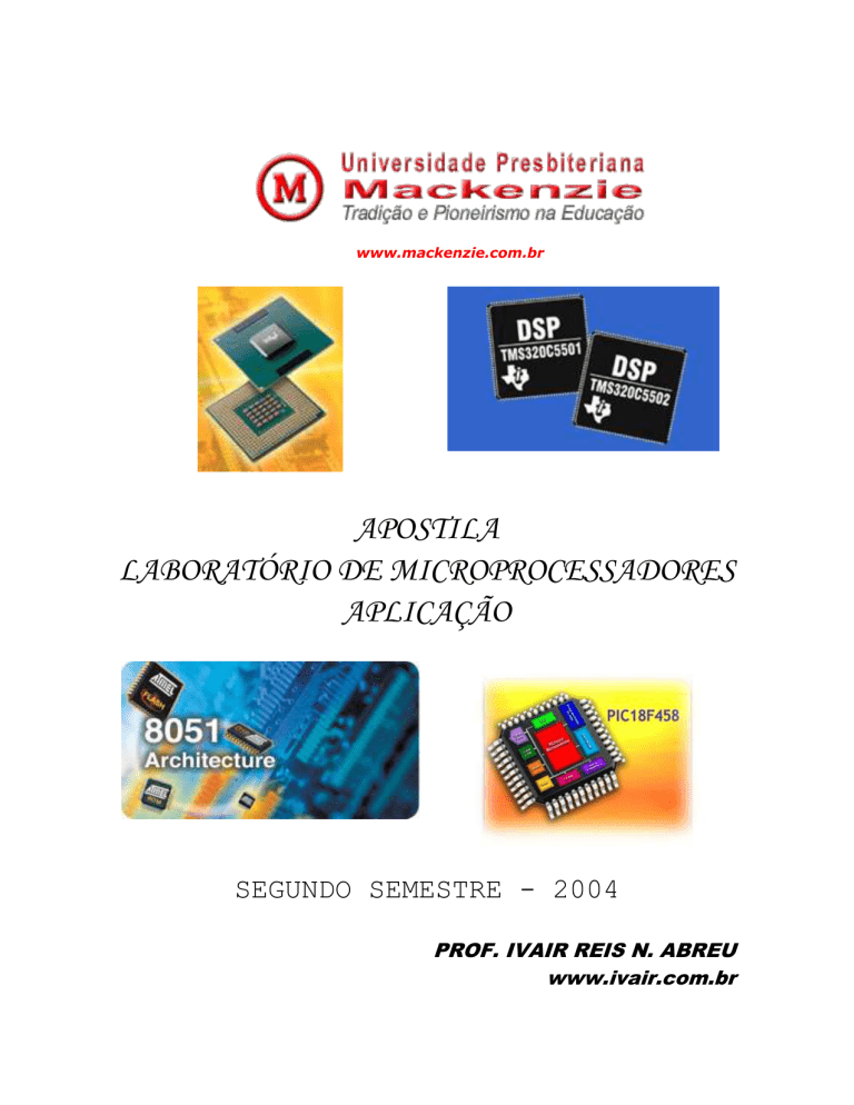 www.mackenzie.com.br APOSTILA LABORATÓRIO DE MICROPROCESSADORES APLICAÇÃO SEGUNDO SEMESTRE - 2004 PROF. IVAIR REIS N. ABREU www.ivair.com.br APOSTILA DE LABORATÓRIO MACKENZIE MICROPROCESSADORES APLICAÇÃO INDICE PLANEJAMENTO DIDÁTICO PEDAGÓGICO 4 EXPERIÊNCIA 1 - REVISÃO ASM51/AVSIM51 5 EXPERIÊNCIA 2 - REVISÃO ASM51/AVSIM51 9 FOLHA DE RESPOSTAS – EXPERIÊNCIA 2 11 EXPERIÊNCIA 3 - REVISÃO CONJUNTO DE INSTRUÇÕES 8051 12 FOLHA DE RESPOSTAS – EXPERIÊNCIA 3 17 EXPERIÊNCIA 4 - KIT 8031 18 FOLHA DE RESPOSTAS – EXPERIÊNCIA 4 23 EXPERIÊNCIA 5 - ALARME COM O KIT 8031 / GRAVAÇÃO DE EPROM 24 FOLHA DE RESPOSTAS – EXPERIÊNCIA 5 26 EXPERIÊNCIA 6 - SISTEMA DE SEMAFORO DE PEDESTRES 27 FOLHA DE RESPOSTAS – EXPERIÊNCIA 6 29 EXPERIÊNCIA 7 - SISTEMA DE TEMPORIZAÇAO/INTERRUPÇÃO 8051 30 FOLHA DE RESPOSTAS – EXPERIÊNCIA 7 34 EXPERIÊNCIA 8 - TECLADO MATRICIAL 35 FOLHA DE RESPOSTAS – EXPERIÊNCIA 8 39 EXPERIÊNCIA 9 - COMUNICAÇÃO SERIAL 40 2 APOSTILA DE LABORATÓRIO MACKENZIE MICROPROCESSADORES APLICAÇÃO FOLHA DE RESPOSTAS – EXPERIÊNCIA 9 43 EXPERIÊNCIA 10 - CONVERSOR A/D 8 BITS 44 FOLHA DE RESPOSTAS – EXPERIÊNCIA 10 48 EXPERIÊNCIA 11 - PROJETO COMPLETO 49 EXPERIÊNCIA 12 - APRESENTAÇÃO DO PROJETO DE PESQUISA 50 Revisão: 08/08/2004 3 APOSTILA DE LABORATÓRIO MACKENZIE MICROPROCESSADORES APLICAÇÃO PLANEJAMENTO DIDÁTICO PEDAGÓGICO LABORATÓRIO DE MICROPROCESSADORES APLICAÇÃO SEGUNDO SEMESTRE 2004 CURSO SUPERIOR DE TECNOLOGIA ELÉTRICA UNIDADE: FCEBI DISCIPLINA: Laboratório de Microprocessadores Aplicação PROFESSOR: Ivair Reis Neves Abreu Departamento: Eletrônica ETAPA: 6 CARGA HORÁRIA: 2 aulas práticas OBJETIVOS: o aluno deverá adquirir praticar os conceitos básicos de sistemas com microcontroladores e processadores digitais de sinal ao nível de projeto físico e programação em linguagem de montagem (e máquina) para teste do sistema elaborado. METODOLOGIA Aula prática com computadores e ferramentas de programação (compiladores e simuladores) e utilização de placa didática (kit) baseada no microcontrolador da família 8051. No final do curso o aluno deverá apresentar um projeto prático utilizando a placa didática e todos os conceitos ministrados no curso (projeto de hardware e firmware básico). CRITÉRIO DE AVALIAÇÃO Nota de Laboratório = 0,33 x Participação + 0,33 Experiência 12 + 0,33 Trabalho Prático Participação = presença e entrega da folha de respostas das 10 primeiras experiências. Experiência 12 - Entregue individualmente no último dia útil do laboratório. Trabalho Prático Exp. 11 - Grupo de 4 alunos entregue no último dia útil de laboratório. BIBLIOGRAFIA - APLICAÇÕES PRÁTICAS DO MICRONTROLADOR 8051. Vidal Pereira da Silva Jr. - Érica DATABOOK EMBEDED APLICATIONS 8051 / 89Sxxx. Intel / ATMEL (www.atmel.com) THE 8051 FAMILY OF MICROCONTROLLERS. Richard H. Barnett. Prentice Hall. THE 8051 MICROCONTROLLER. I. Schott Mackenzie. Prentice Hall. APOSTILA DE LABORATÓRIO DE MICROPROCESSADORES APLICAÇÕES. Ivair Reis Neves Abreu Internet: www.microcontroller.com www.8052.com www.vidal.com.br www.icmaster.com www.microchip.com www.ti.com www.zilog.com www.motorola.com www.cypress.com 4 APOSTILA DE LABORATÓRIO MACKENZIE MICROPROCESSADORES APLICAÇÃO EXPERIÊNCIA 1 - Revisão ASM51/AVSIM51 1) - Objetivo: ASM51/AVSIM51 revisão dos comandos básicos do sistema de desenvolvido 2) - Introdução Teórica: - Edição: utilizar o programa EDIT (DOS) ou BLOCO DE NOTAS. utilizar WORD ou WORDPAD salvar arquivo como TXT - Compilação: ASM51 <nome.asm> - Conversão OBJ para HEX: OH <nome.hex> to <nome.obj> - Simulação: AVSIM51 (com o arquivo nome.hex) ou TSCONTROL - Gravação de EPROM ou memória flash (8951). Se - Compilação do programa fonte: através do compilador ASM51, convertemos as instruções contidas no editor para linguagem de máquina. Este programa gera dois arquivos: NOME.LST -> arquivo imprimível onde serão guardadas as mensagem dos possíveis erros gerados pelo compilador. Este arquivo deve ser sempre acessado em caso de detecção de erros. NOME.HEX -> programa a ser simulado e gravado em uma EPROM. Ex: "ASM51 TESTE1.ASM" - Conversor: pelo fato do simulador e o processo de gravação de EPROM utilizar normalmente um arquivo tipo HEX, faz-se necessário a presença do programa OH para converter este arquivo .OBJ para .HEX. A estrutura da chamada de OH é a seguinte: 'OH <nome.obj> TO <nome.hex>' - Simulação do programa fonte: realizado através do simulador 'AVSIM51' da AVOCET. Para executar o programa basta digitar: 'AVSIM51' São apresentadas 6 opções de entrada, onde trabalharemos com a opção 'A: 8051'. Como o microcontrolador já apresenta memória ROM e RAM, não há necessidade de configurarmos através do 'SET' a área de memória. Apenas carregamos o programa através do comando 'LOAD - AVOCET'. Observe a presença de todos os registradores internos do 8051 e dos 4 ports P0, P1, P2 e P3 no lado direito inferior da tela. Esta etapa poderá ser saltada se digitarmos: 'AVSIM51 A' A tela do programa possui duas regiões de trabalho: comandos e display. O cursor se colocará inicialmente no menu de comandos e com o 5 APOSTILA DE LABORATÓRIO MACKENZIE MICROPROCESSADORES APLICAÇÃO acionamento da tecla ESC poderemos trabalhar no campo display. Acionando ESC novamente voltamos ao campo comandos. Os principais comandos utilizados em nosso curso são vistos abaixo: - Dump: configura as janelas de memória 1 e 2 do campo display. A opção '1' configura a primeira janela e a opção '2' configura a segunda janela. Uma vez selecionada a janela, optando pela opção 'ABSOLUTE' simplesmente entramos com o endereço inicial desejado. Na opção 'INDIRECT' associaremos o endereço da janela com um par de registradores. Ex: 1) - 'DUMP 1 ABSOLUTE 30H' -> o primeiro endereço da janela 1 será 30h. 'DUMP 2 INDIRECT SP - 10h'-> o primeiro endereço da janela 2 será o endereço do apontador de pilha