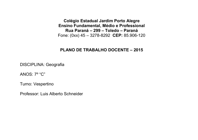 Colégio Estadual Jardim Porto Alegre Ensino Fundamental, Médio e Professional Rua Paraná – 299 – Toledo – Paraná Fone: (0xx) 45 – 3278-8292 CEP: 85.906-120 PLANO DE TRABALHO DOCENTE – 2015 DISCIPLINA: Geografia ANOS: 7º “C” Turno: Vespertino Professor: Luis Alberto Schneider Justificativa Geografia é uma ciência viva, dinâmica e aberta. Dentro desta perspectiva os objetos geográficos são interligados com as ações humanas. É uma ciência que compreende o estudo do espaço geográfico, como sendo um espaço social, produzido e reproduzido pela sociedade, através do trabalho. É através do trabalho que o homem transforma e organiza o espaço, conforme seus interesses e necessidades. O espaço geográfico é composto por elementos naturais, culturais, técnicos e também por ações sociais, políticas e econômicas. A disciplina de geografia trata o Homem como agente principal do meio onde vive, pois o homem é o transformador, organizador e produtor do espaço geográfico. A geografia é uma área de conhecimento comprometida em tornar o mundo compreensível para os alunos e tem como meta buscar um ensino que direciona os mesmo para a cidadania possibilitando-os a compreender sua importância no conjunto de interação entre a sociedade e natureza. Metodologia Acompanhar no dia a dia as aptidões e desenvolvimentos das habilidades dos alunos através da leitura, escrita e interpretações dos conceitos fundamentais da geografia: paisagem, lugar, região, território, natureza e sociedade com o objetivo de inserir os alunos no seu contexto social, através de diálogos abertos, para tornar o ensino da Geografia interessante, produtivo e ligado com os pensamentos e inovações do mundo moderno, o qual nossos alunos estão inseridos. ORIENTAÇÕES GERAIS: No desenvolvimento dos conteúdos estabelecidos é preciso contemplar uma discussão sobre as relações sociedade-natureza. Abordar a localização da paisagem em diferentes escalas, articulando com os princípios cartográficos, signos, escalas, orientação para justificar o conteúdo geográfico. Os conteúdos estruturantes devem nortear a escolha dos Conteúdos Específicos, sabendo que para cada conteúdo trabalhado podemos abordá-lo nos quatro Conteúdos estruturantes. Os temas educacionais contemporâneos, tais como: cultura afro-brasileira, indígenas, educação ambiental, história do Paraná, prevenção ao uso indevido de drogas, sexualidade humana, educação fiscal, direito da criança e adolescente, educação tributária e enfrentamento a violência contra a criança e o adolescente deverão ser abordadas no desenvolvimento dos conteúdos. CONTEÚDOS ESTRUTURANTES: DIMENSÃO ECONÔMICA DO ESPAÇO GEOGRÁFICO DIMENSÃO POLÍTICA DO ESPAÇO GEOGRÁFICO DIMENSÃO CULTURAL DEMOGRÁFICA DO ESPAÇO GEOGRÁFICO DIMENSÃO SOCIOAMBIENTAL DO ESPAÇO GEOGRÁFICO PLANO DE TRABALHO DOCENTE GEOGRAFIA – 7º ANO - 1º BIMESTRE – 2015 Conteúdos Básicos Conteúdos Específicos Formação, localização e regionalização do território brasileiro Território brasileiro. Regiões do Brasil. Por que regionalizar? Regionalização, limites territoriais, expansão territorial e políticas regionais. Critérios, descentralização, planejamento, ações governamentais, coletas de dados e pesquisas das regiões brasileiras. Justificativa Localizar identificar e compreender a expansão territorial e a configuração do atual território brasileiro, através da divisão em regiões. Compreender o que é e porque regionalizar e as políticas regionais do Brasil. Entender a divisão feita pelo IBGE, para que possa melhor atender as especificidades das regiões. Avaliação: Neste bimestre os alunos farão duas avaliações (prova, Encaminhamentos seminário ou trabalho) Metodológicos com peso 70 e outras atividades com peso 30. Recuperação com peso 100. Aula expositiva com Espera-se que o aluno mapa regional do Brasil possa compreender o e ressaltar sobre a processo de formação do chegada dos território, localização e a portugueses na América. regionalização através dos mapas e textos específicos. Aula expositiva com mapa regional do Brasil e ressaltar sobre as políticas que determina as formas de regionalização. Espera-se que o aluno possa compreender que a divisão do território não aconteceu por acaso, mas vários fatores foram analisados, através de atividades escrita e com mapas. Aula expositiva com Responder um questionário texto sobre o IBGE e que ressalta as regiões citar como exemplo a brasileiras e alguns fatores importância pesquisa do que são resultado da censo que direciona os regionalização. investimentos para as regiões. GEOGRAFIA - 7º ANO - 2º BIMESTRE - 2015 Conteúdos Básicos Conteúdos Específicos Justificativa A distribuição da população por regiões, natalidade, mortalidade, pirâmide etária, e diversidade da população dentro do país. Entender como a população está distribuída por regiões e os fatores que influenciam na população com: natalidade, mortalidade, pirâmide etária, e diversidade da população dentro do país. Entender os movimentos populacionais, porque as pessoas migram e as causas históricas – econômicas e sociais que causam os movimentos migratórios e a formação da população do Paraná. Brasil: aspectos demográficos Emigrações, imigrações, e migrações internas e a influência no espaço geográfico brasileiro. Os movimentos demográficos. Encaminhamentos Metodológicos Aula expositiva com exemplos próximo dos alunos, como quantas pessoas tem na família a idades delas e se possível trazer fotos para serem analisadas durante a aula. Aula expositiva com exemplos próximo dos alunos sobre migrações, como de onde vieram, porque vieram e as diferenças entre perceberam entre os lugares. Avaliação: Neste bimestre os alunos farão duas avaliações (prova, seminário ou trabalho) com peso 70 e outras atividades com peso 