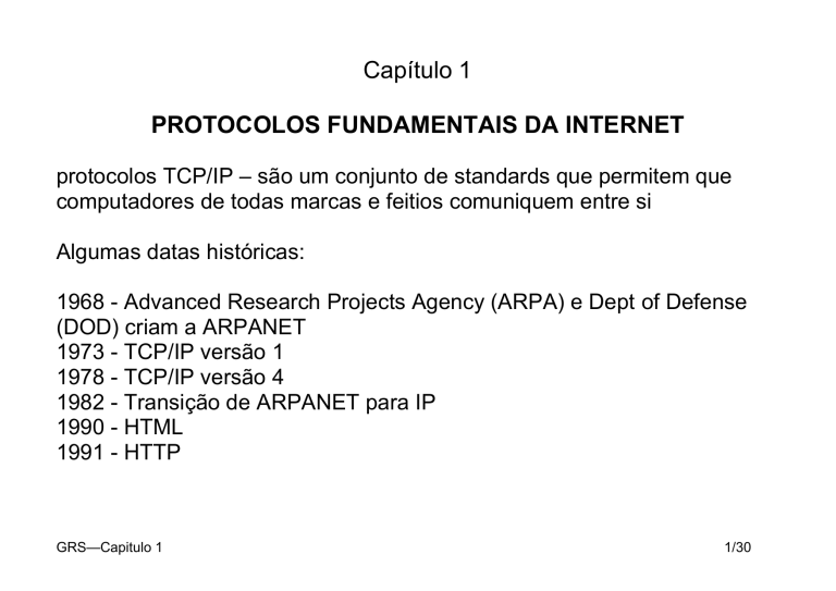 Capítulo 1 PROTOCOLOS FUNDAMENTAIS DA INTERNET protocolos TCP/IP – são um conjunto de standards que permitem que computadores de todas marcas e feitios comuniquem entre si Algumas datas históricas: 1968 - Advanced Research Projects Agency (ARPA) e Dept of Defense (DOD) criam a ARPANET 1973 - TCP/IP versão 1 1978 - TCP/IP versão 4 1982 - Transição de ARPANET para IP 1990 - HTML 1991 - HTTP GRS—Capitulo 1 1/30 ARQUITECTURA TCP/IP — LAYERS (CAMADAS) - os protocolos TCP/IP descrevem várias camadas de software: Application Transport Network Link physical GRS—Capitulo 1 telnet, ftp, HTTP, SMTP TCP, UDP IP, ICMP Ethernet 2/30 LAYERS Physical layer - descreve o nível físico: niveis de tensão, modulação, cablagem, conectores etc. Exemplos: ethernet, token ring, ADSL, wireless Wi-Fi 802.11b/g Link layer - corresponde ao device driver incluido no sistema operativo. É o software que faz a formatação de dados mais apropriada para o nivel fisico. Exemplo: ethernet, ppp, pppoE Network layer - (internet layer) responsável pelo transporte dos pacotes na rede: encaminhamento (routing) Transport layer - responsável pelo fluxo de dados—integridade, fraccionamento e re-agrupamento dos dados GRS—Capitulo 1 3/30 LAYERS (2) Application layer - software que faz a interface com o utilizador. Exemplos: telnet (login remoto) ftp (file transfer protocol) ssh (secure shell) SMTP e POP3 (mail transfer protocols) HTTP GRS—Capitulo 1 4/30 EXEMPLO: FTP entre dois hosts (mesma rede) A maior parte das aplicações funcionam em modo cliente servidor O servidor oferece um serviço—é um programa que corre em background (daemon) e está permanentemente à espera que o cliente se ligue GRS—Capitulo 1 5/30 EXEMPLO: FTP entre dois hosts (redes diferentes) A Internet é feita de redes independentes e fisicamente diferentes As redes A e B podem ser de tipos fisicos diferentes (ethernet, token ring, adsl, wireless etc) GRS—Capitulo 1 6/30 ENDEREÇOS IP 32 bits agrupados 8 a 8. Todos o equipamento na Internet tem que ter um numero único Exemplo 140.252.13.33 decimal 1000 1100 . 1111 1100 . 0000 1101 . 0010 0001 binário 8C.FC.0D.21 hexadecimal GRS—Capitulo 1 7/30 CLASSES Os endereços IP dividem-se em classes De 0.0.0.0 a 127.0.0.0 De 128.0.0.0 a 191.255.0.0 De 192.0.0.0 a 223.255.255.0 Classe A - 8 bits identificam a rede Classe B - 16 bits identificam a rede Classe C - 24 bits identificam a rede GRS—Capitulo 1 8/30 MÁSCARA DE REDE É um conjunto de 32 bits o os bits a 1 identificam a rede o os bits a 0 identificam o host Todos os hosts na mesma rede tem os mesmos bits de identificação da rede Faz-se uma operação AND da máscara com o endereço IP para encontrar a rede GRS—Capitulo 1 9/30 GRS—Capitulo 1 10/30 MÁSCARA DE REDE GENERICA Numero de bits que identificam a rede não precisa de ser um multiplo de 8 bits Classless network Exemplo: mascara 255.255.252.0 GRS—Capitulo 1 11/30 MÁSCARA DE REDE GENERICA (2) Todos os bits de identificação do host a zero -> endereço da rede Todos os bits de identificação do host a um -> endereço de broadcast EXEMPLO Qual o endereço de rede e o endereço de broadcast? IP 10.10.23.27/255.255.252.0 IP Mascara 0000 1010.0000 1010.0001 0111.0001 1011 1111 1111.1111 1111.1111 1100.0000 0000 AND 0000 1010.0000 1010.0001 0100.0000 0000 Endereço da rede: 10.10.20.0 Endereço de broadcast: 10.10.23.255 GRS—Capitulo 1 12/30 ENDEREÇOS IP RESERVADOS (PRIVADOS) 10.x.x.x 127.x.x.x Classe A loopback 172.16.x.x Classe B 172.31.x.x 192.168.0.x Classe C 192.168.255.x GRS—Capitulo 1 13/30 DOMAIN NAME SYSTEM (DNS) Endereços IP não são práticos para nós (humanos!) As pessoas preferem recordar nomes Exemplo 193.136.224.30 www.ualg.pt O servidor DNS converte IPs em nomes e vice-versa As aplicações web são clientes de DNS, mas também há clientes dedicados (por exemplo nslookup) GRS—Capitulo 1 14/30 ENCAPSULAMENTO Cada nível no protocolo coloca um header e um trailer (cabeçalho e terminação) nos dados que lhe são transmitidos Importante: cada nível NÃO altera os dados que recebe GRS—Capitulo 1 15/30 ENCAPSULAMENTO (2) Application header: informação sobre os dados (conteúdo,formato, compressão etc) TCP header: identifica a aplicação que gera os dados IP header: informação de routing (IP origem, IP destino) Ethernet header: endereços físicos de origem e destino GRS—Capitulo 1 16/30 MODELO CLIENTE-SERVIDOR A maior parte das aplicações na Internet funcionam no modelo cliente-servidor O servidor é concurrente – quando o cliente se liga ao servidor, este gera imediatamente uma cópia de si mesmo para servir o cliente Assim, o servidor está sempre disponivel para aceitar pedidos de ligação do cliente GRS—Capitulo 1 17/30 PORTAS (PORTOS) As aplicações “servidor” são identificados por números standard – portas. As portas 1-1023 são reservadas a serviços que pertencem a root Exemplos: telnet FTP SMTP TFTP HTTP GRS—Capitulo 1 TC P TC P TC P UD P TC P Porta 23 Porta 21 Porta 25 Porta 69 Porta 80 18/30 A combinação protocolo-porta identifica univocamente a aplicação no servidor (exemplo TCP porta 80 -> servidor web) A aplicação cliente é igualmente identificada por um par protocoloporta – agora a porta assume um número aleatório (ainda não utilizado) acima de 1024 GRS—Capitulo 1 19/30 PROTOCOLOS FUNDAMENTAIS GRS—Capitulo 1 20/30 REQUEST FOR COMMENTS (RFCs) RFCs – documentos oficiais que descrevem os protocolos RFC 791 – protocolo IP RFC 793 – protocolo TCP RFC 768 – protocolo UDP GRS—Capitulo 1 21/30 PROTOCOLO IP Responsável pelo encaminhamento dos dados Simples: Não estabelece uma ligação (connectionless) Não seguro (unreliable) Connectionless - apenas fornece a informação para enviar dados de um ponto para outro, não verifica que a ligação é possível Unreliable - não garante a entrega dos dados GRS—Capitulo 1 22/30 IP HEADER GRS—Capitulo 1 23/30 PROTOCOLO UDP Objectivo